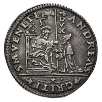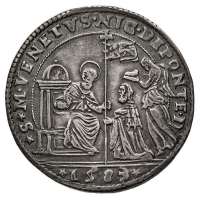 Governo dei Dogi Biennali (1528-1797) - Testone della Benedizione di II tipo 1554 - Diritto: Gesù Cristo stante a destra nell'atto di benedire il Doge genuflesso mentre tiene il vessillo della Repubblica; in esergo la data - Rovescio: croce ornata e accantonata da read all