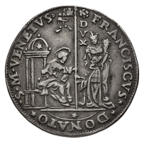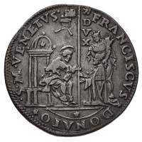 Francesco Donà (1545-1553) - Osella Anno VI (1551) - Zecca: Venezia - Diritto: il Doge genuflesso con la personificazione dell'Abbondanza alle spalle, riceve da San Marco il vessillo della Repubblica - Rovescio: legenda su sei righe orizzontali - gr. 9,67 - Rara - read all