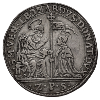 Leonardo Donà (1606-1612) - Osella Anno I (1606) - Zecca: Venezia - Diritto: il Doge genuflesso riceve da San Marco il vessillo della Repubblica - Rovescio: San Marco seduto a sinistra fra due leoni porge la spada alla Giustizia genuflessa di fronte a lui - gr. 9,42 - read all