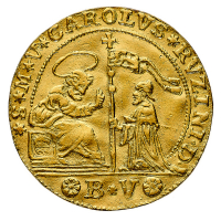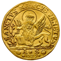 Carlo Ruzzini (1732-1735) - Quarto di Ducato da 2 Zecchini - Zecca: Venezia - Diritto: il Doge genuflesso tiene un'asta con vessillo e croce e riceve la benedizione da San Marco che gli siede di fronte - Rovescio: il leone alato stante a sinistra regge il Vangelo con la read all