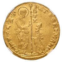 Pietro Grimani (1741-1752) - Zecchino NGC MS 63 - Zecca: Venezia - Diritto: il Doge genuflesso tiene un'asta culminante in una croce e riceve la benedizione da San Marco che gli sta di fronte - Rovescio: Gesù Cristo benedicente entro una cornice a mandorla - Cert. read all