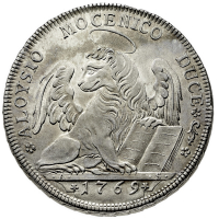 Alvise IV Mocenigo (1763-1779) - Tallero per il Levante 1769 - Zecca: Venezia - Diritto: il leone di San Marco seduto a destra retrospiciente mostra il Vangelo aperto - Rovescio: busto diademato di donna a destra - gr. 28,15 - Molto rara - Migliore di SPL