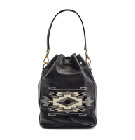 black leather, black textile lining. Double adjustable and removable shoulder strap. Drawstring closure. Applied front motif with ethnic design. Golden-tone metal hardware.
