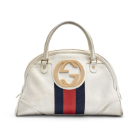white leather with central Web stripe, blue fabric interior. Double leather handles, two-way zip fastening. Large interlocking GG logo on the front. Silver-tone metal hardware.