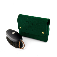 Mini pouch in green felt, marked with “S” indicating an employee purchase; fastened with golden snap buttons. Shoe brush in beechwood and horsehair, featuring stainless-steel Clou de Selle detail.