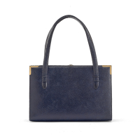 blue boar leather with matching lamb leather interior. Double blue leather handle, snap button closure with jeweled detail. Silver- and gold-tone metal hardware.
