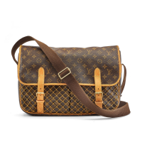 brown Monogram canvas with cowhide trim, removable waxed canvas interior. Adjustable brown canvas shoulder strap. Flap with two buckle straps. Two front patch pockets. Golden-tone metal hardware.
