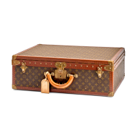 brown Monogram canvas, biscuit fabric interior. Double handle and cowhide trim. Double zip closure with logoed pullers. Complete with original padlock. Golden-tone metal hardware.