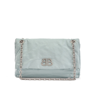 Arena light-blue leather, interior in black fabric. Metal chain shoulder strap, flap closure with double magnetic fastening. One hidden front pocket. Silver-tone metal hardware.