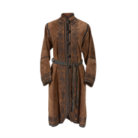 biscuit suede, decorated with black cord embroidery forming spirals and scrolls along the edges and cuffs. Lightly padded quilted lining. Fastened with five brown methacrylate toggles. Leather braided belt with cord and