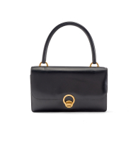 black Box leather, matching interior. Box leather handle. Flap closure with snap ring. Golden-tone metal hardware.