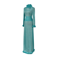teal lamé knit fabric, double ruffles follow the neckline, sleeve edges and hem. Small embroidered front logo. Front zip fastening.