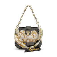 mustard crocodile and Monogram Charm print protected by crystal vinyl. Black leather interior. Double chain handle in metal and silk. Flap closure with mock padlock. Golden-tone metal hardware.