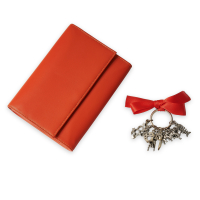 multicolour leather wallet with coin pocket, checkbook and bill compartments closed by snap, five card slots and two flat pockets. Keychain in .800 silver with ten applied good-luck charms.