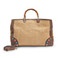 natural straw with brown leather trim and multicolour studs. Beige canvas interior. Double bamboo handle, removable and adjustable brown leather shoulder strap. Central zip closure with logoed pull, two side compartments with magnetic closure. Golden-tone metal