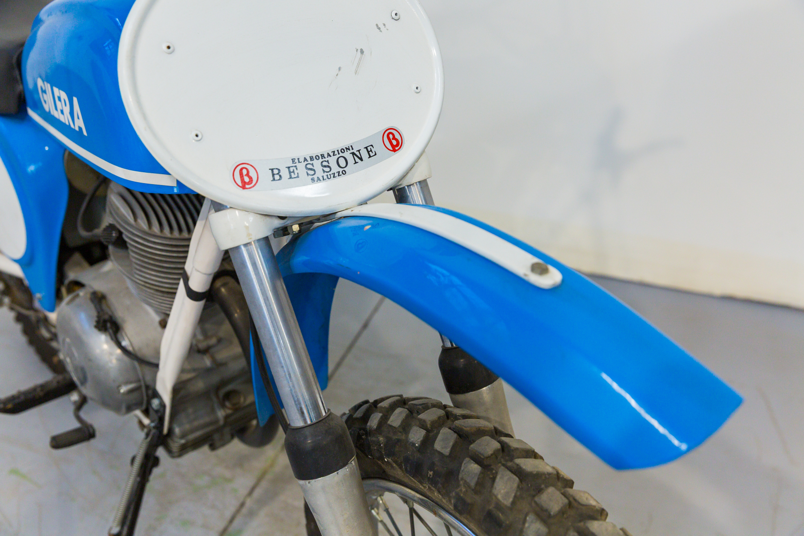 Motorcycle tuned by renowned Saluzzo-based preparer Mario Bessone, one of the foremost specialists of Gilera’s single-cylinder engines from Arcore. Derived from the street-going Giubileo model, it was extensively modified to significantly enhance performance through deep changes to the valve timing and fuel systems. Chassis components are top‑tier—the best available in its era. Finely restored, in excellent condition. Ideal for participating in historical off‑road reenactments with a rare and highly competitive motorcycle.
