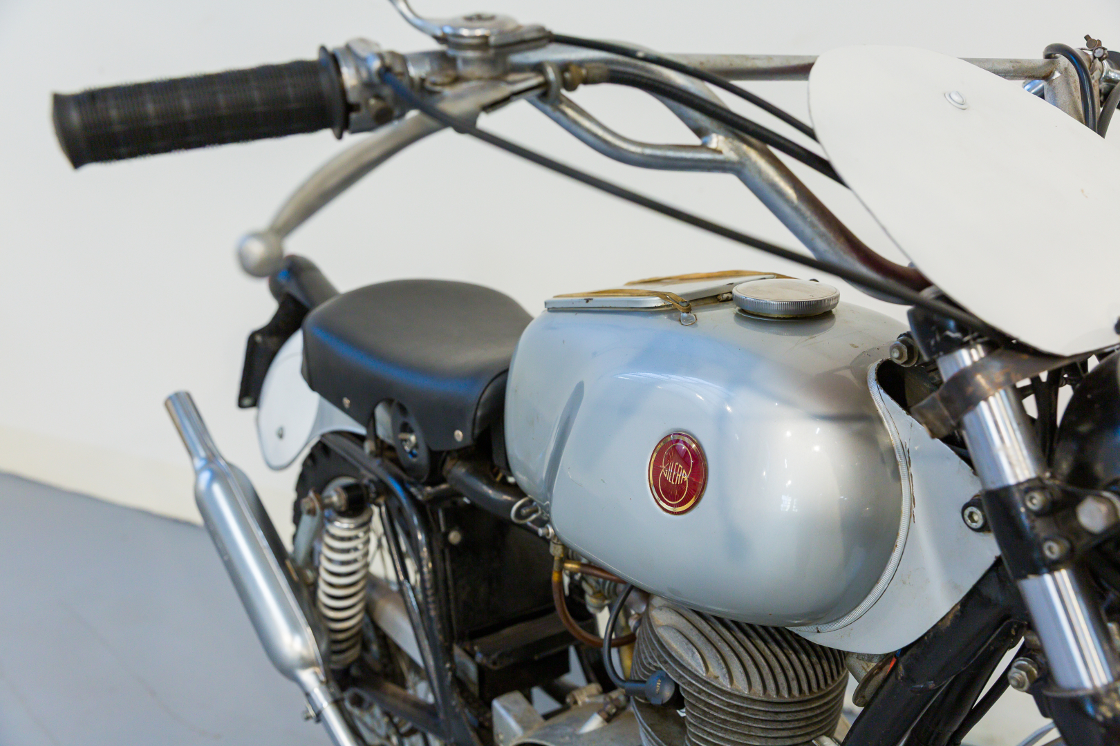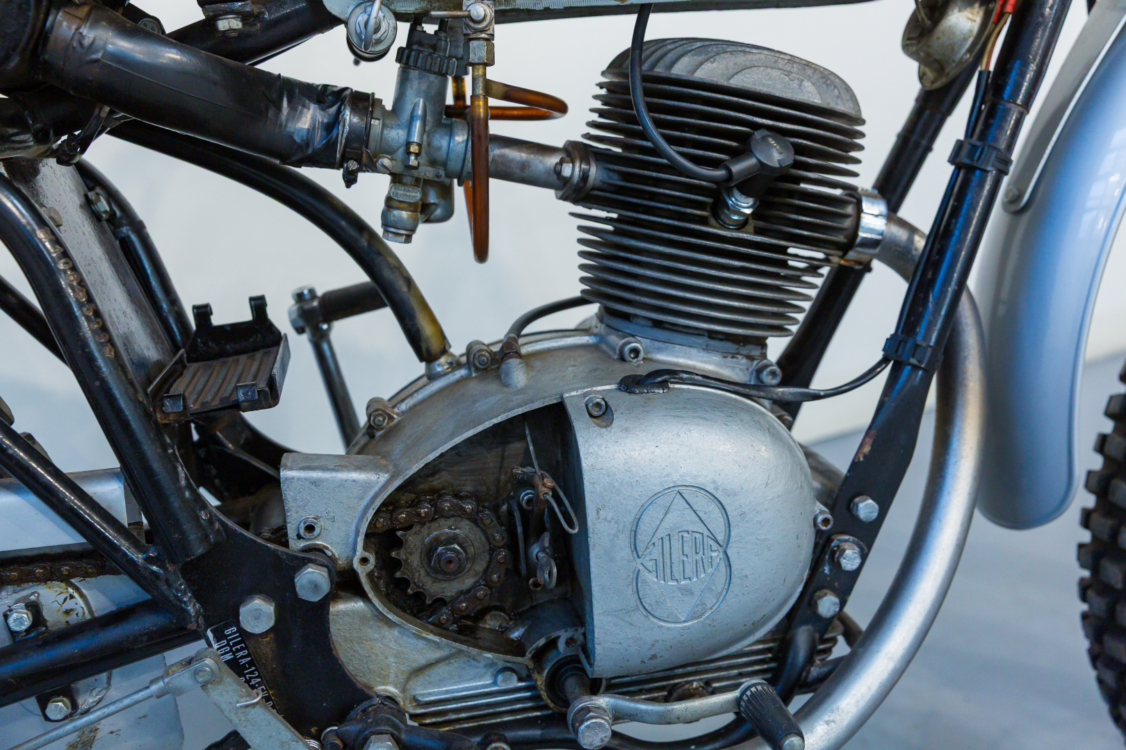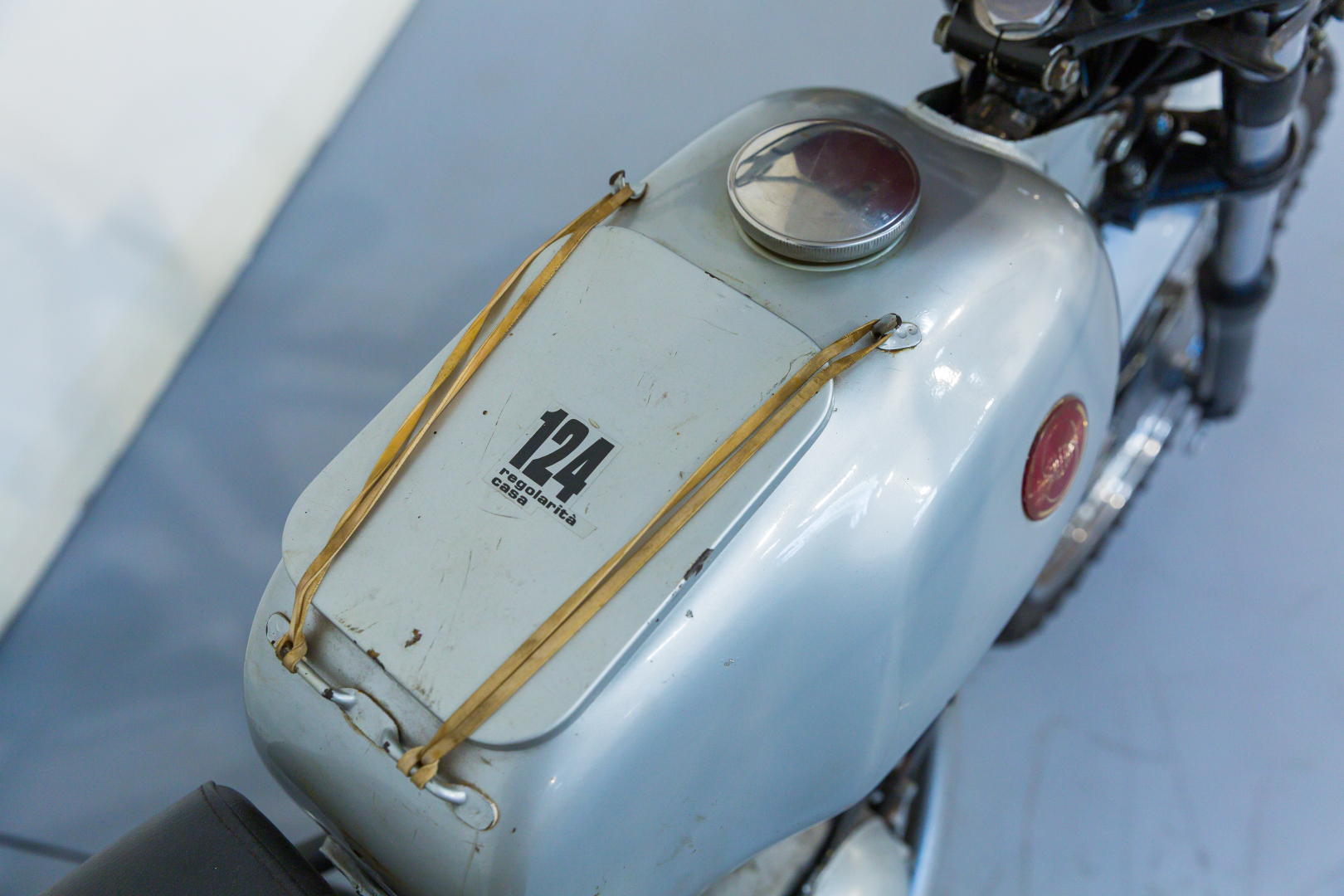The Gilera 124 Regolarità is an off-road motorcycle produced by the historic Arcore-based manufacturer. A natural evolution of the well-known Giubileo Regolarità, it was powered by a torquey four-stroke single-cylinder engine with a five-speed gearbox and equipped with top-quality components such as Ceriani forks and shock absorbers. Preserved and in good condition. The tank must be restored.  A general inspection is recommended before use.