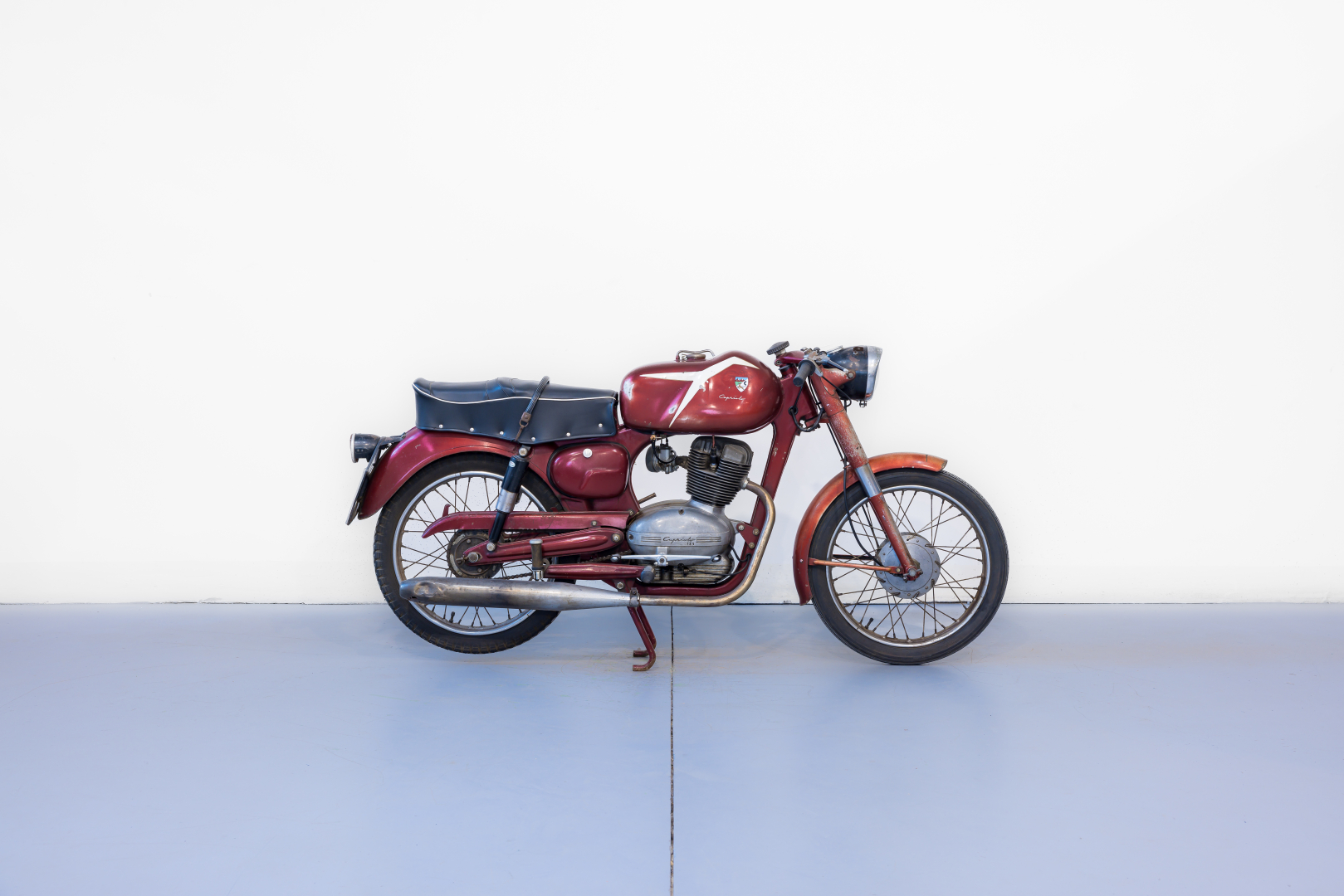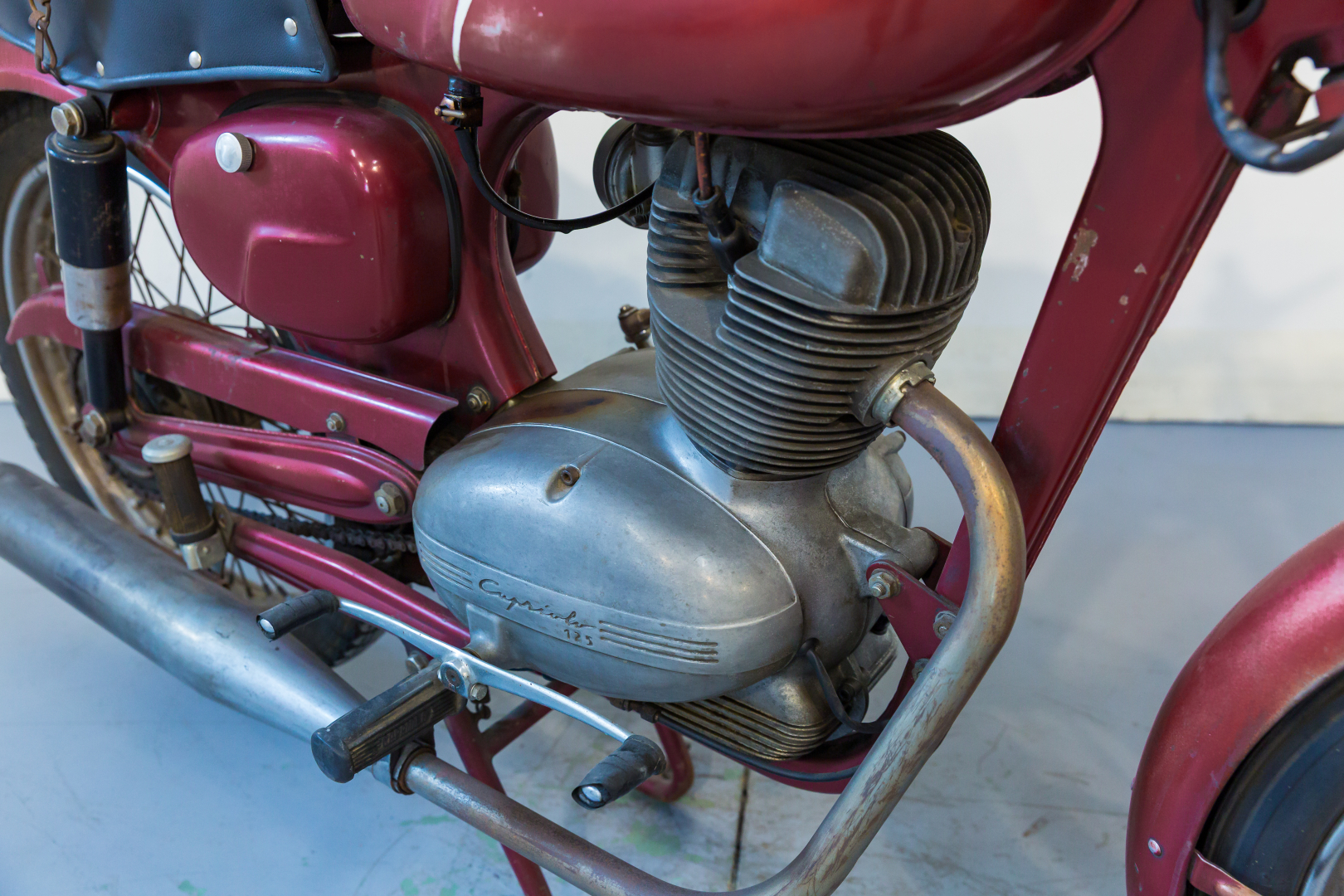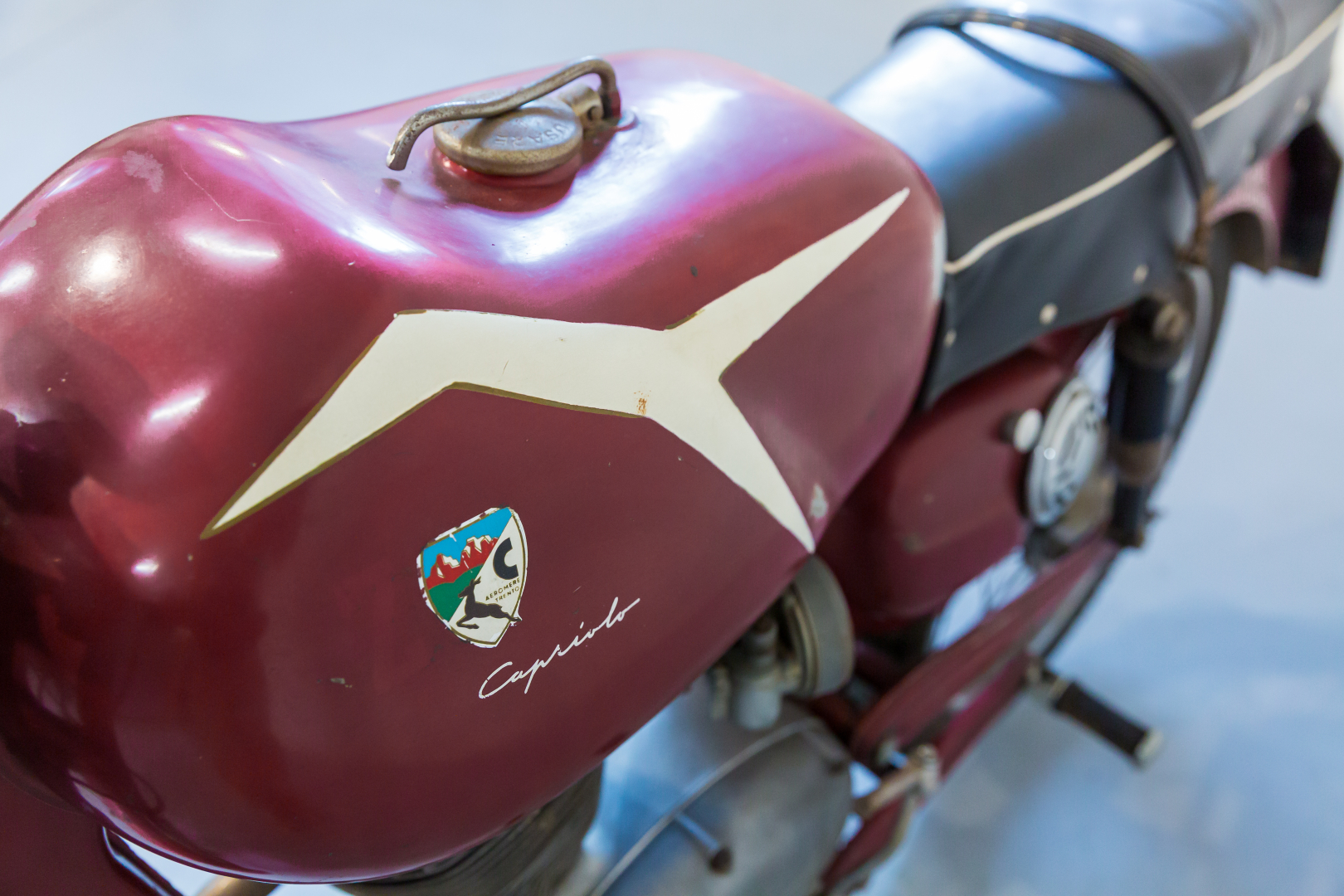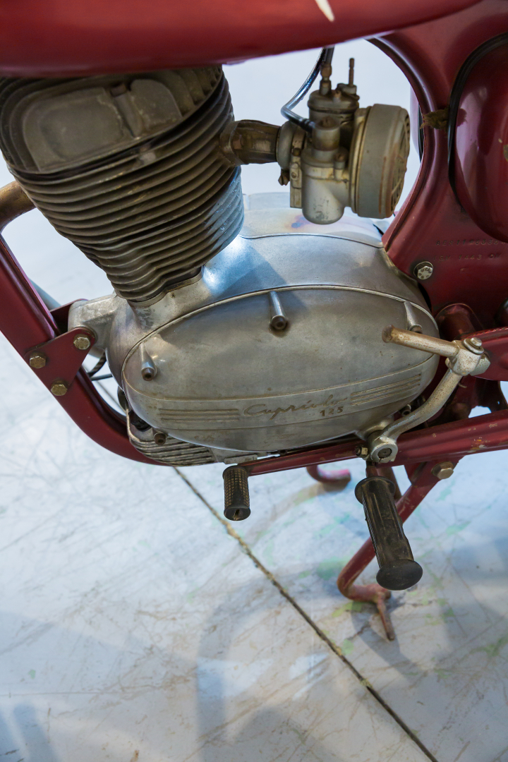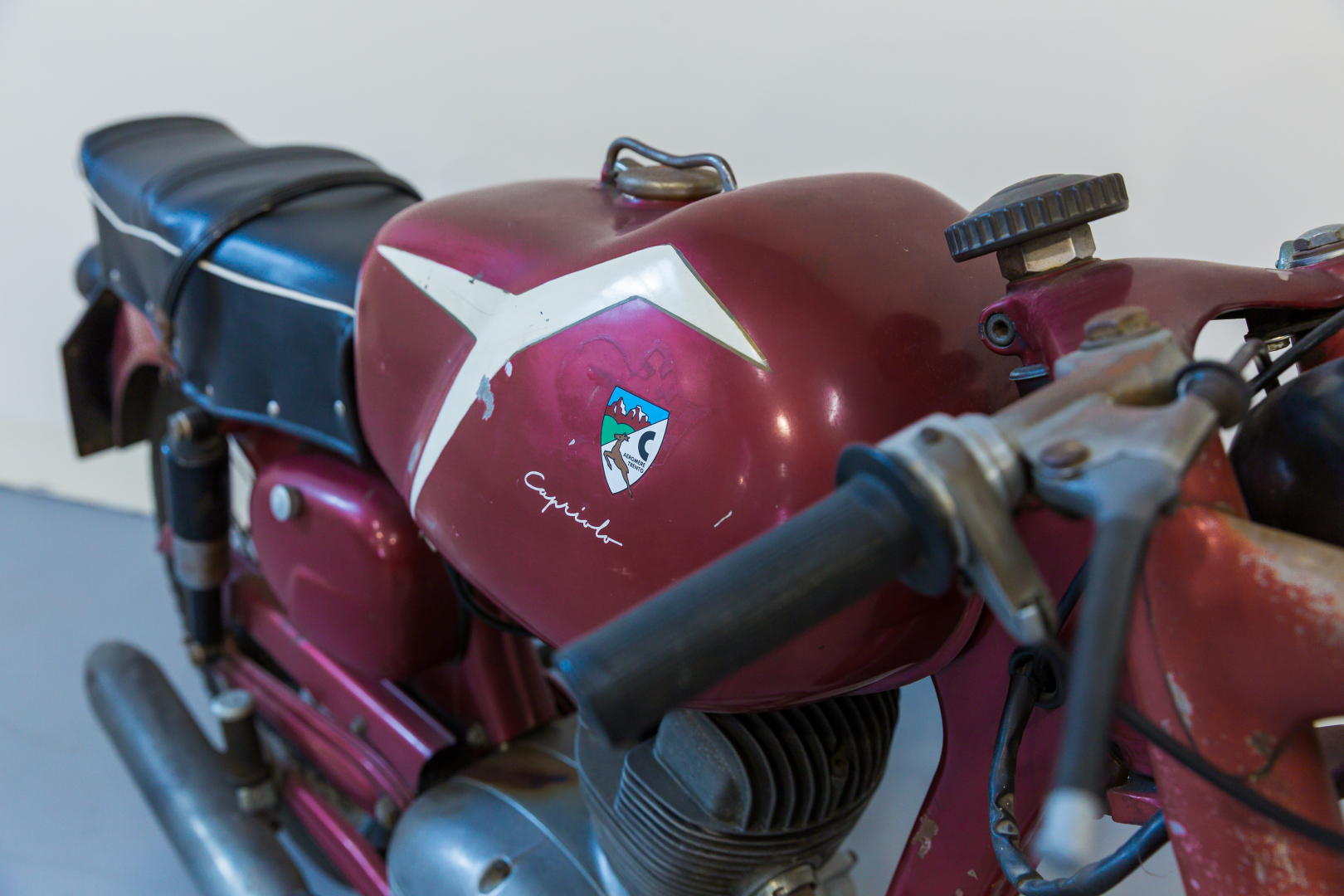 Aeromere S.p.A. of Trento—born from the merger of Aero Caproni S.p.A.—continued to design and produce reliable, economical motorcycles with exciting performance, the right traits for post‑war success as the country resumed growth. Unveiled at the 1959 Milan Motorcycle Show, the Capriolo 125 was powered by a 125 cc four‑stroke single set in a robust pressed‑steel frame in true Caproni style. It came in Gran Turismo (with high handlebars) and De Luxe (sportier look with lower bars) versions; the example offered here is the latter, in fair overall condition. A general check is recommended before use.