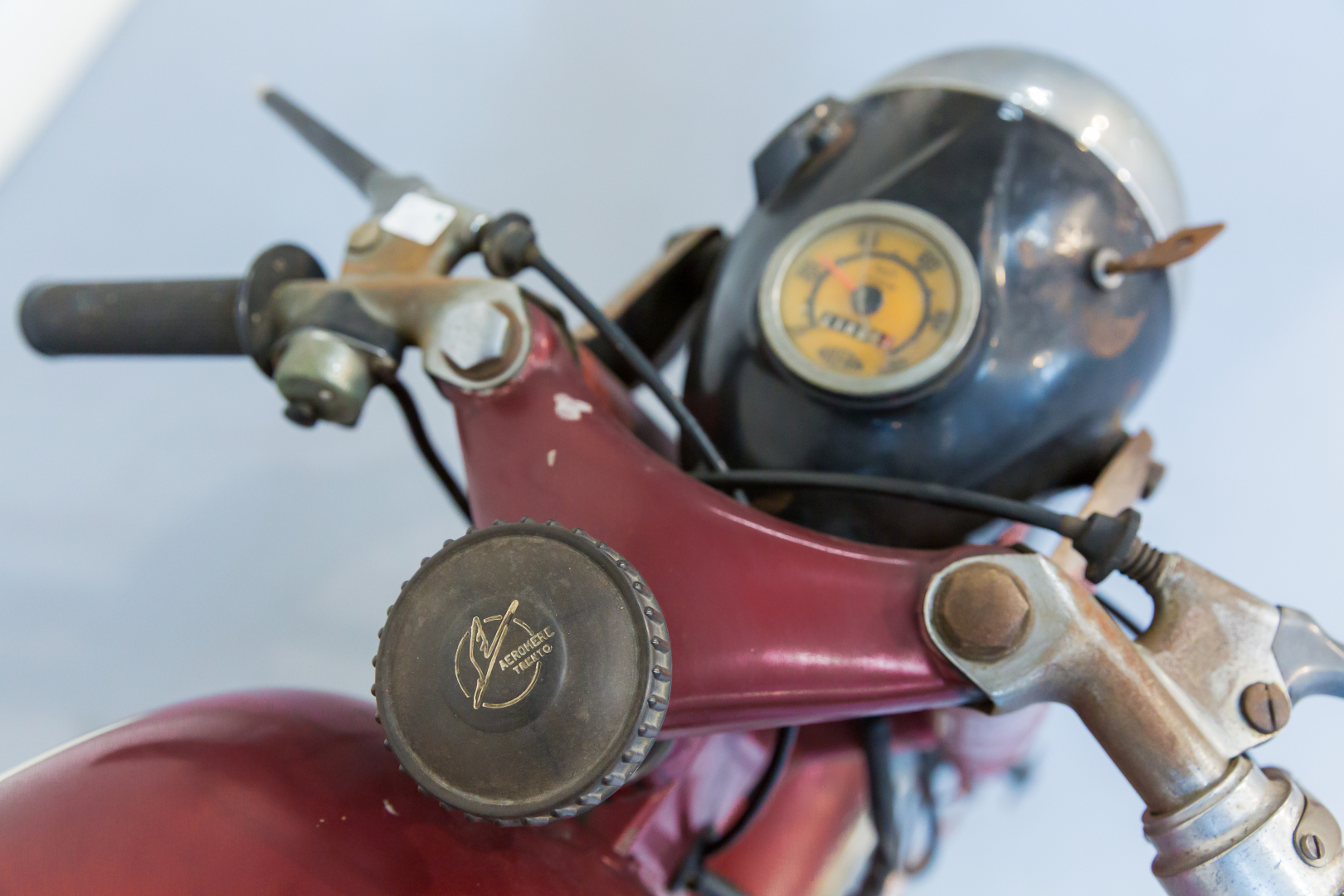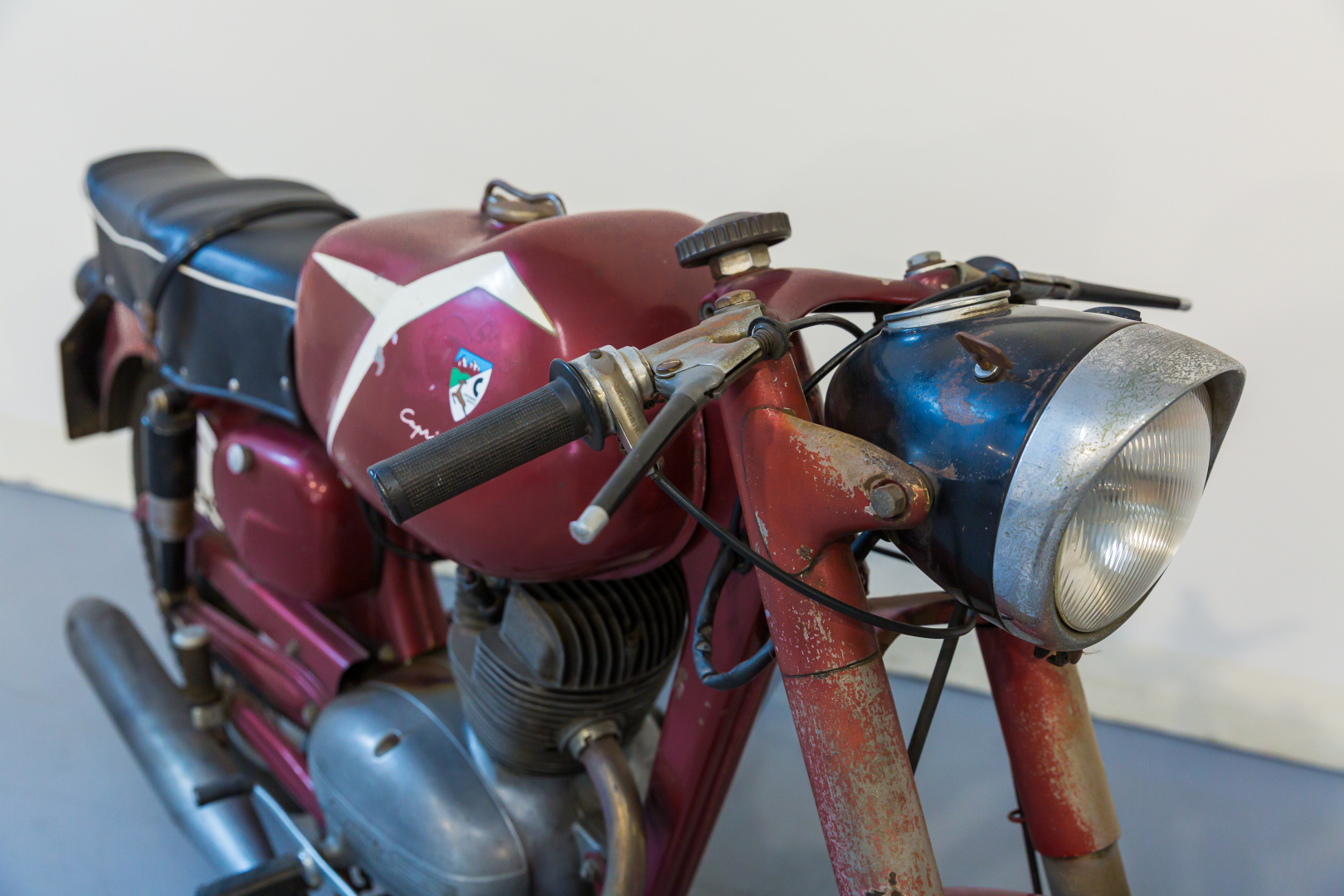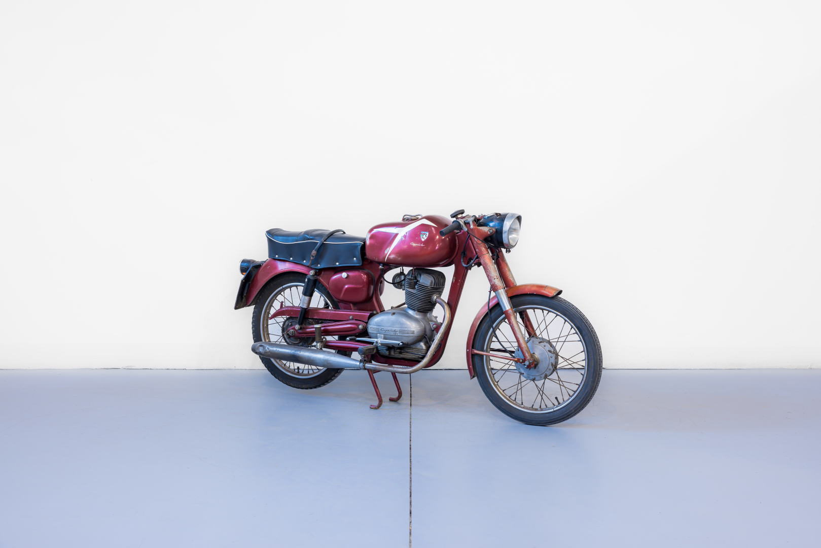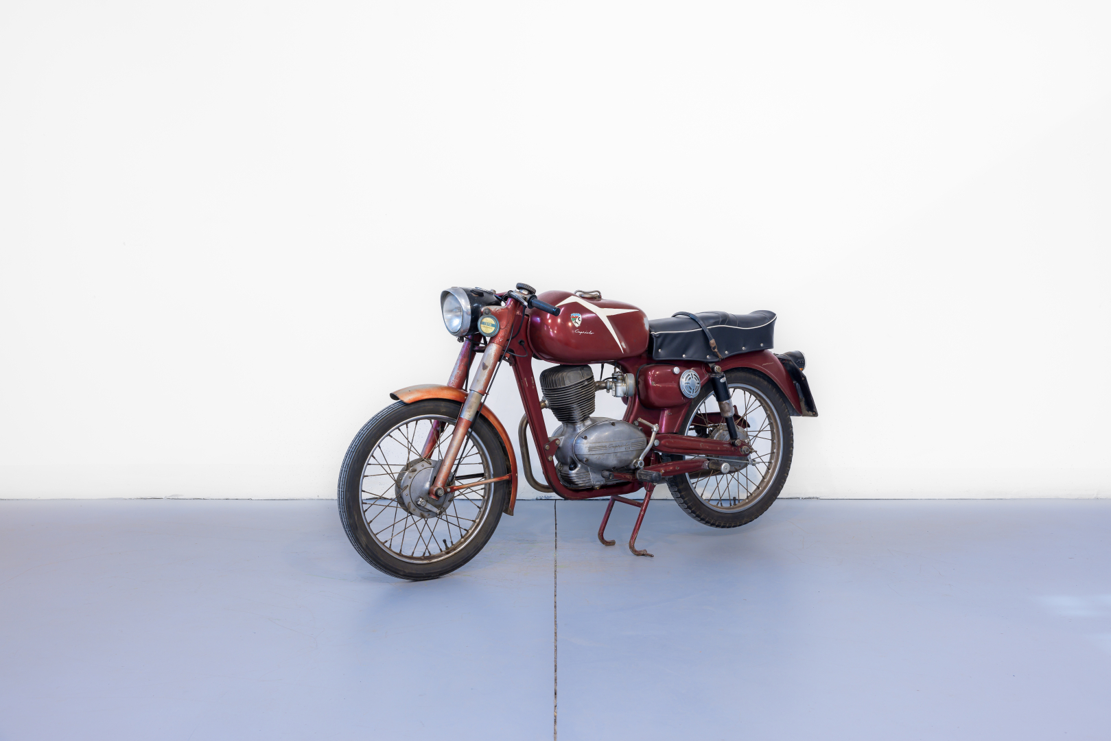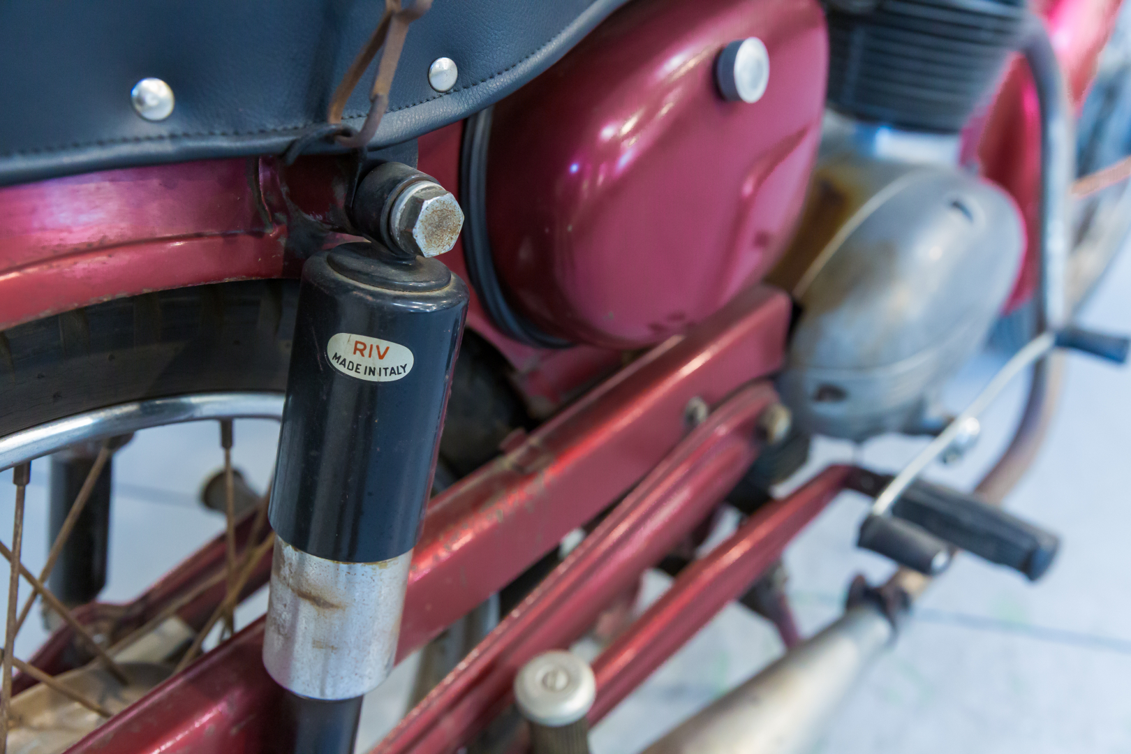 Aeromere S.p.A. of Trento—born from the merger of Aero Caproni S.p.A.—continued to design and produce reliable, economical motorcycles with exciting performance, the right traits for post‑war success as the country resumed growth. Unveiled at the 1959 Milan Motorcycle Show, the Capriolo 125 was powered by a 125 cc four‑stroke single set in a robust pressed‑steel frame in true Caproni style. It came in Gran Turismo (with high handlebars) and De Luxe (sportier look with lower bars) versions; the example offered here is the latter, in fair overall condition. A general check is recommended before use.