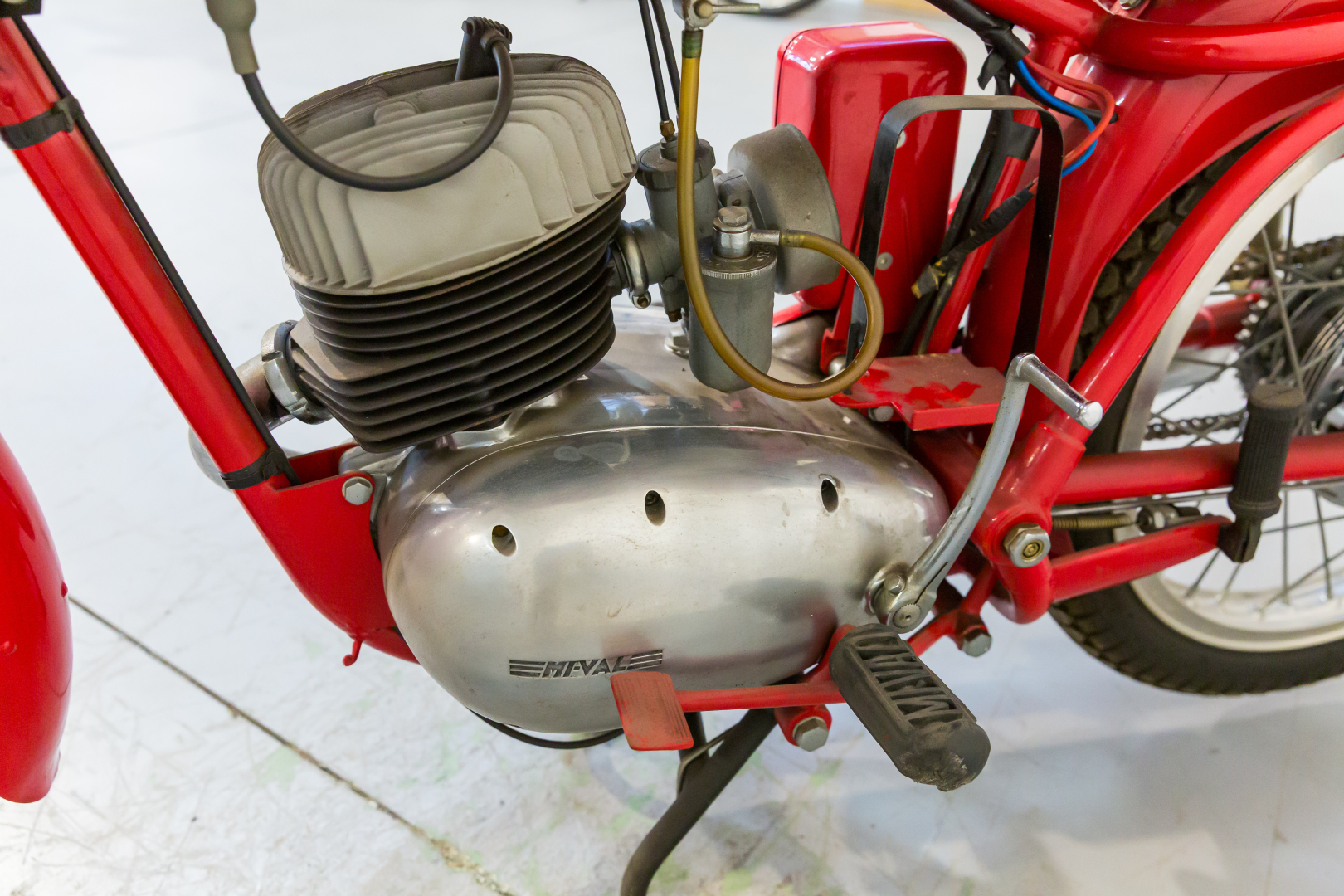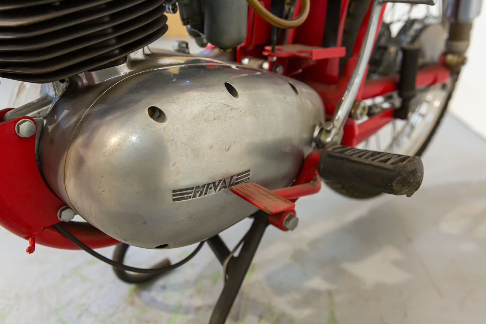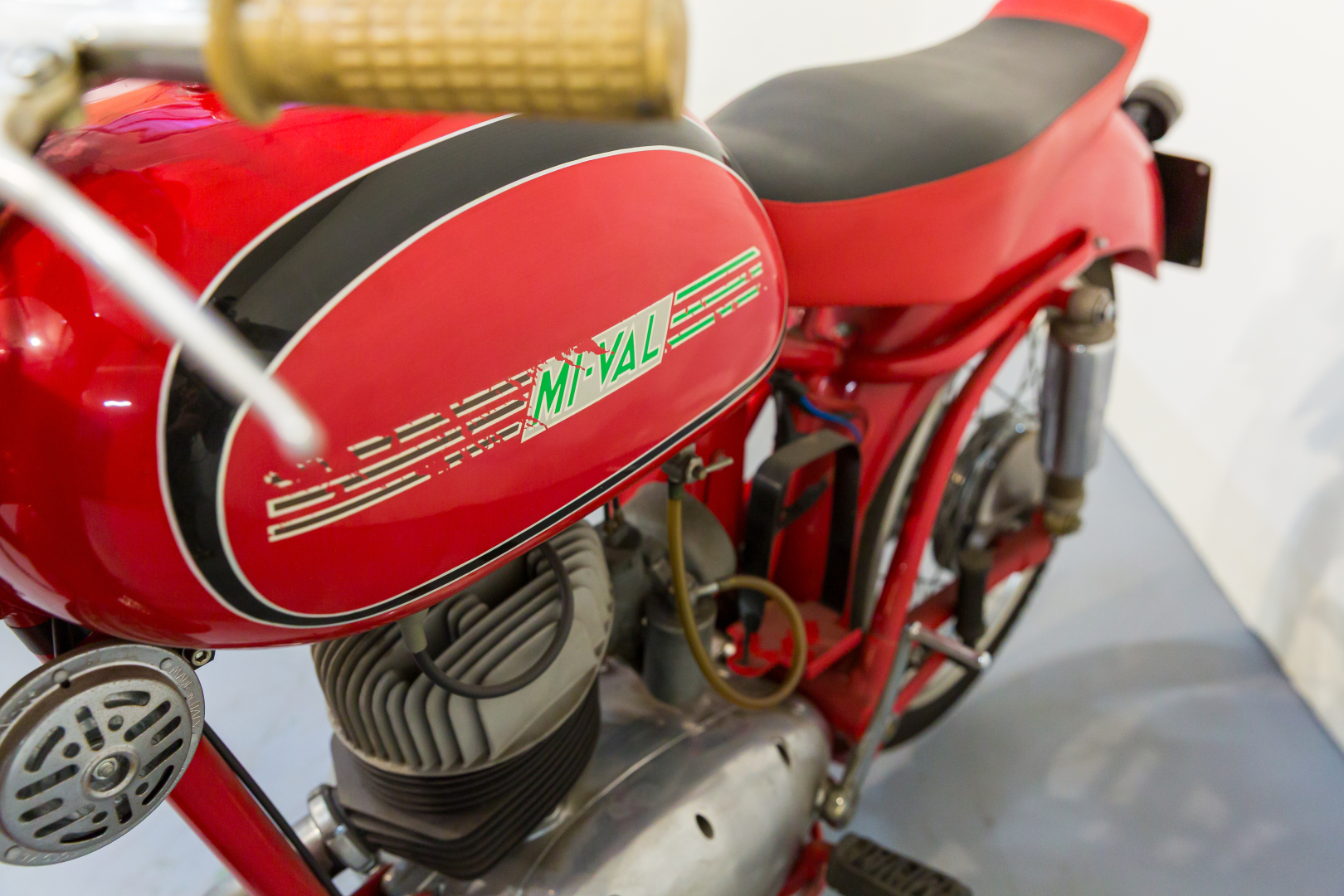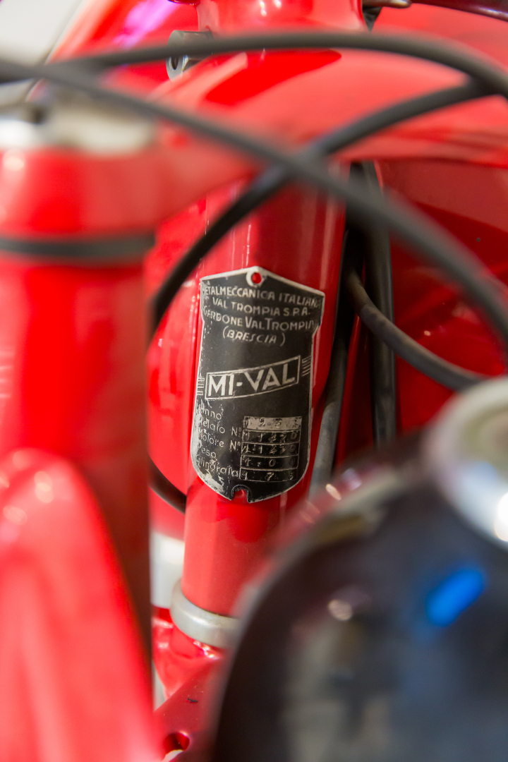 MI‑VAL was one of many companies that began producing motorcycles and scooters after the war to help motorize the country. The Brescia-based firm focused immediately on agile, essential motorcycles with two-stroke engines. Among these, the 175 stands out, powered by a lively engine rated at 9 hp with a four-speed gearbox, built on a single-cradle frame with a semi-hydraulic telescopic front fork and a rear swinging arm assisted by twin hydraulic shock absorbers. The 175 offered here, in the L version, is preserved and in good condition. For parts use.
