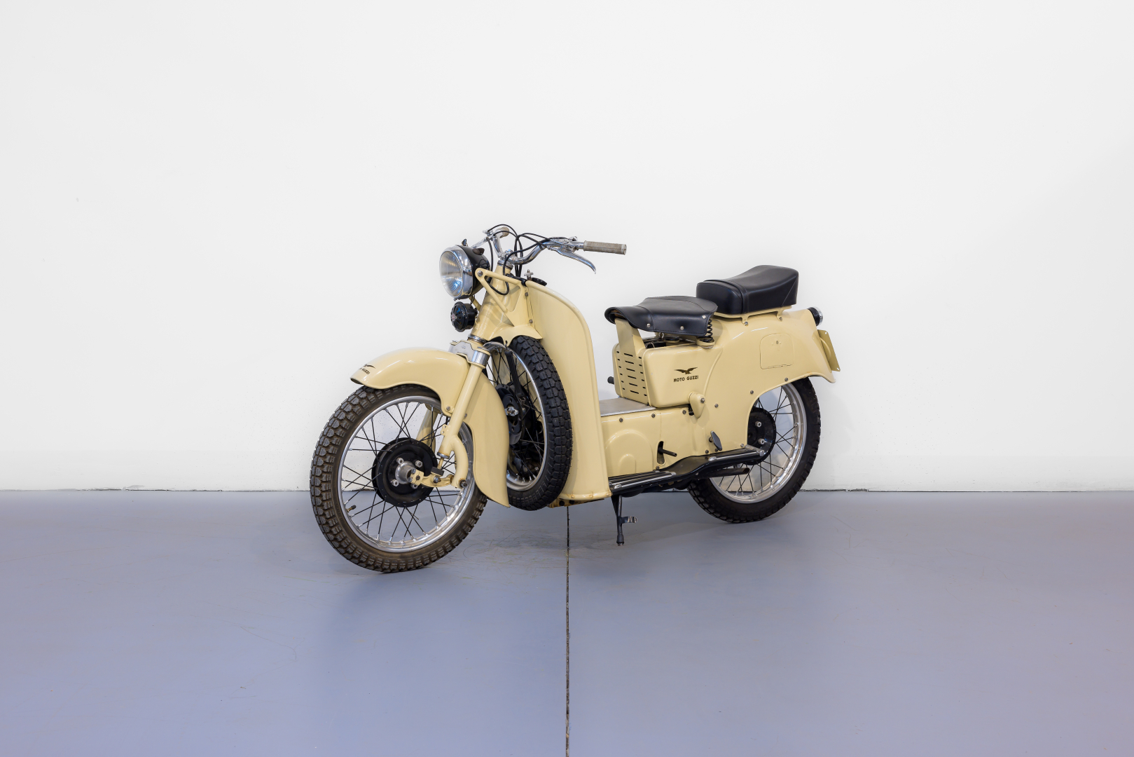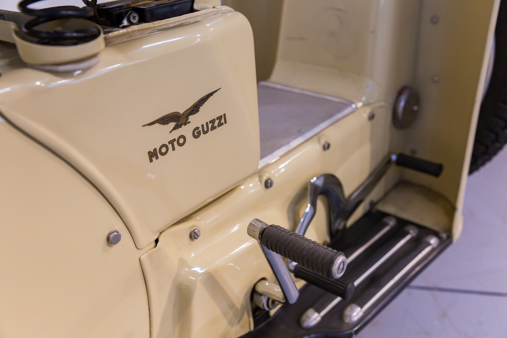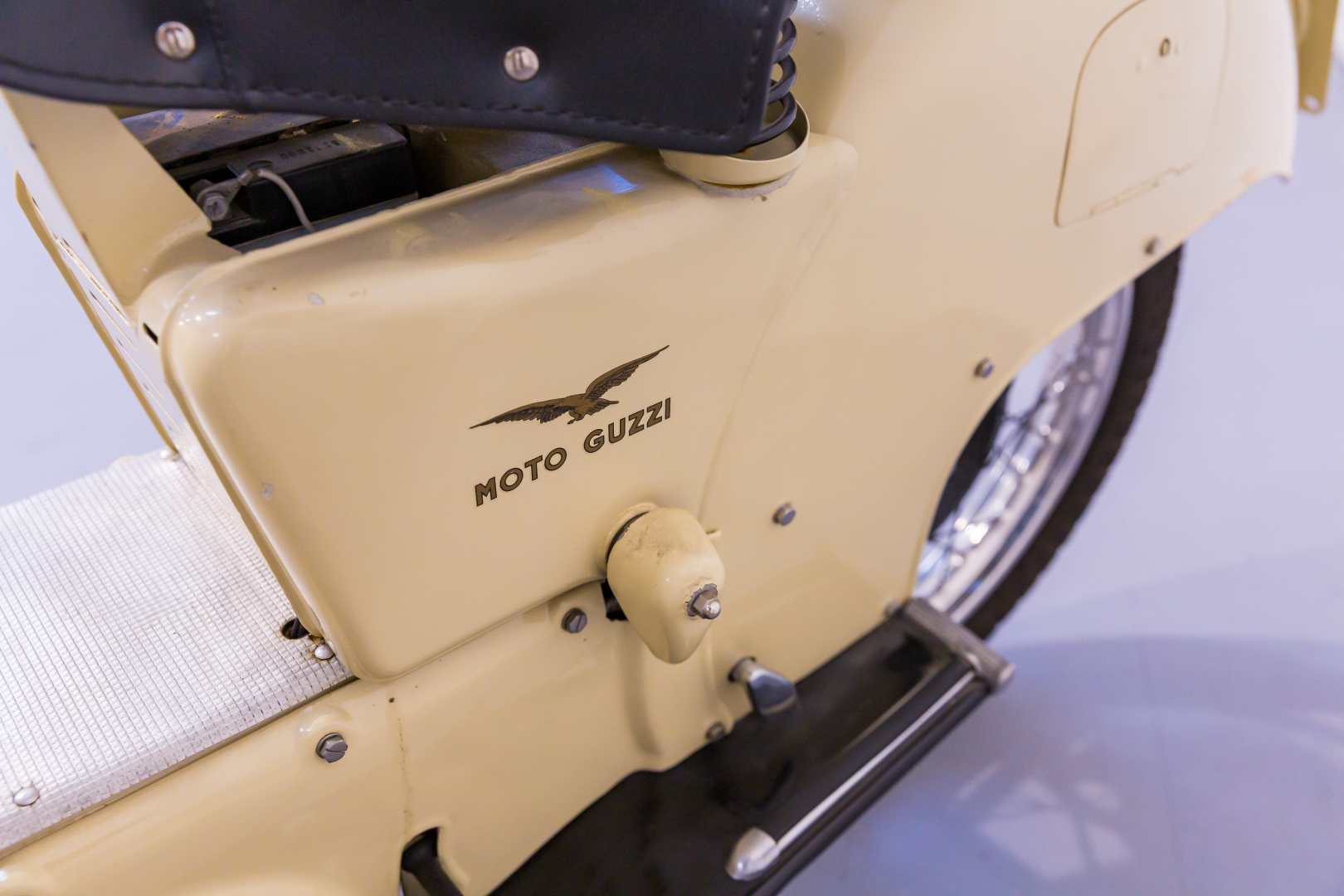 An original Moto Guzzi take on the scooter concept. Pleasant and very comfortable to ride, ideal for out‑of‑town trips. It combines the convenience of a scooter with the stability of large wheels and the added benefit of a spare wheel. Early first‑series model with a 160 cc engine, particularly sought after by collectors. A general check is recommended before use.