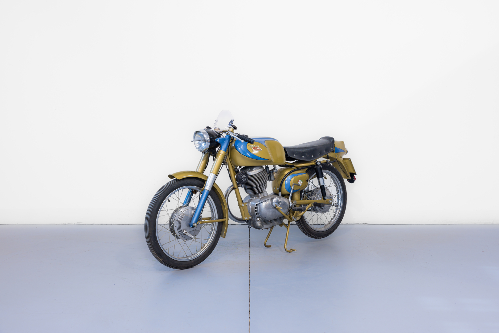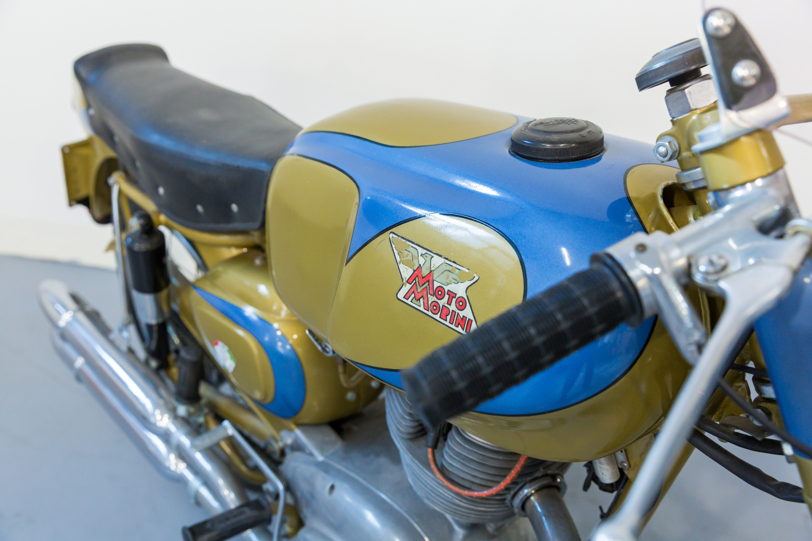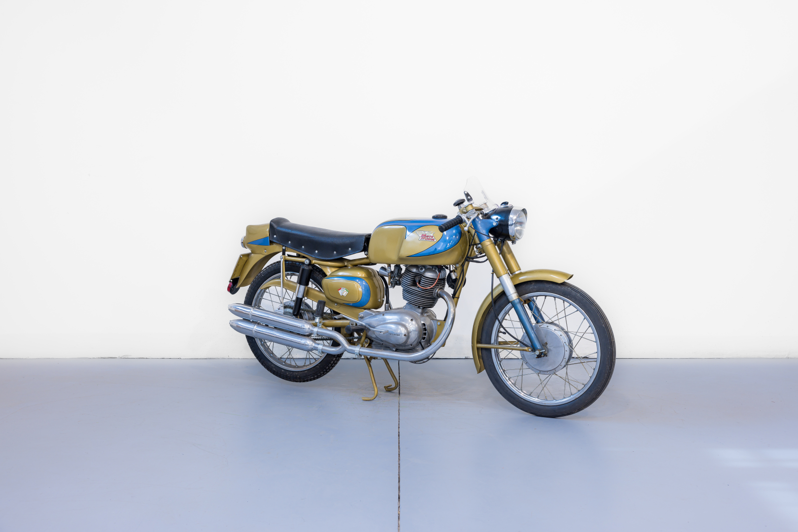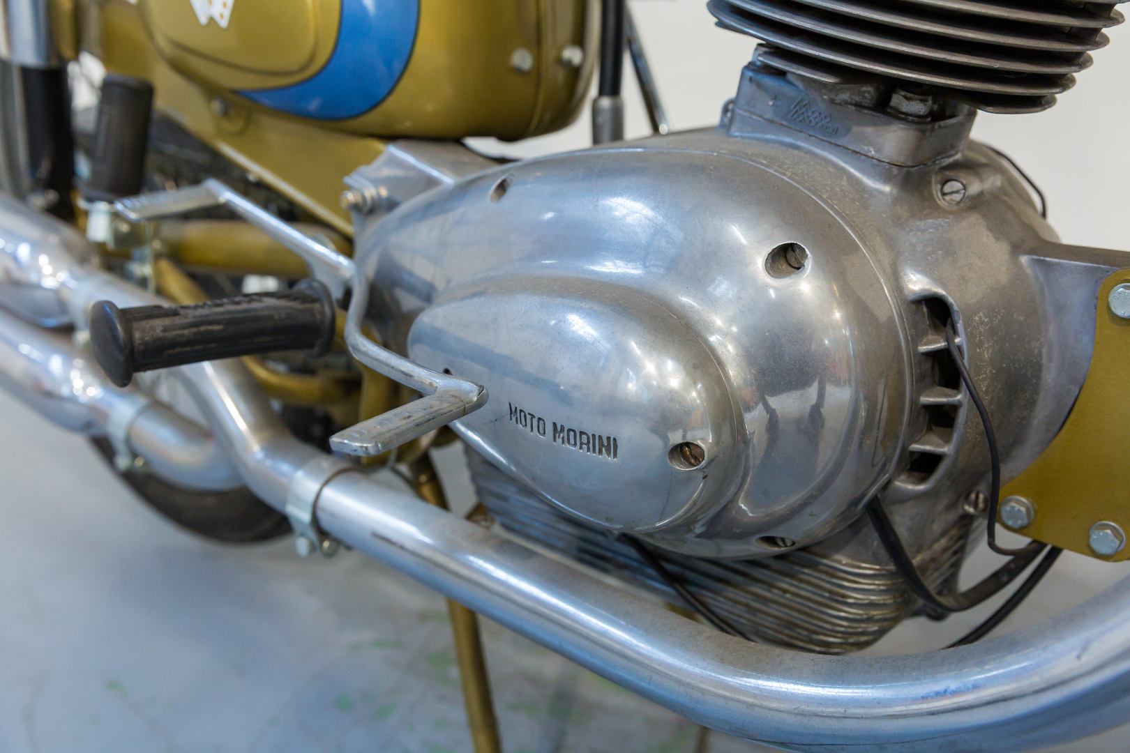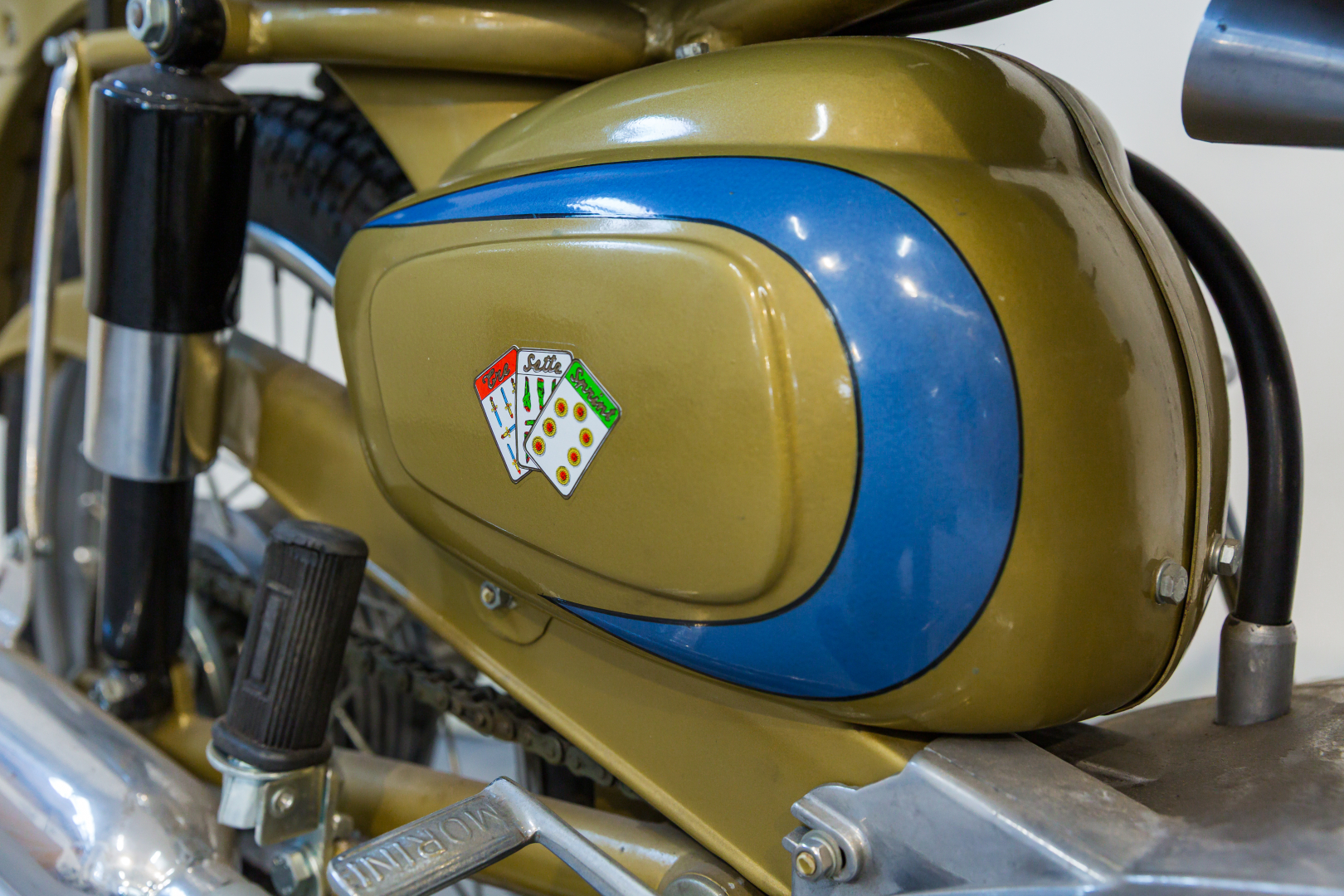 Moto Morini, the renowned Bologna-based company founded by Alfonso Morini in 1937, began by producing economical, reliable motorcycles before adding numerous successful sports models across various categories. Among its greatest hits was the 175 series, introduced in 1953, with the final and most refined model being the Tresette and its Sprint version. The Sprint featured mechanical upgrades such as a high-compression piston, a larger-diameter carburetor, and a revised exhaust, boosting power to 22 hp at a remarkable 10,000 rpm. This lively engine was well complemented by a strong chassis with an open cradle steel-tube frame, a telescopic fork, a swingarm with twin hydraulic shocks, and twin drum brakes with a double-cam front. Restored, excellent condition. A general inspection is recommended before use.