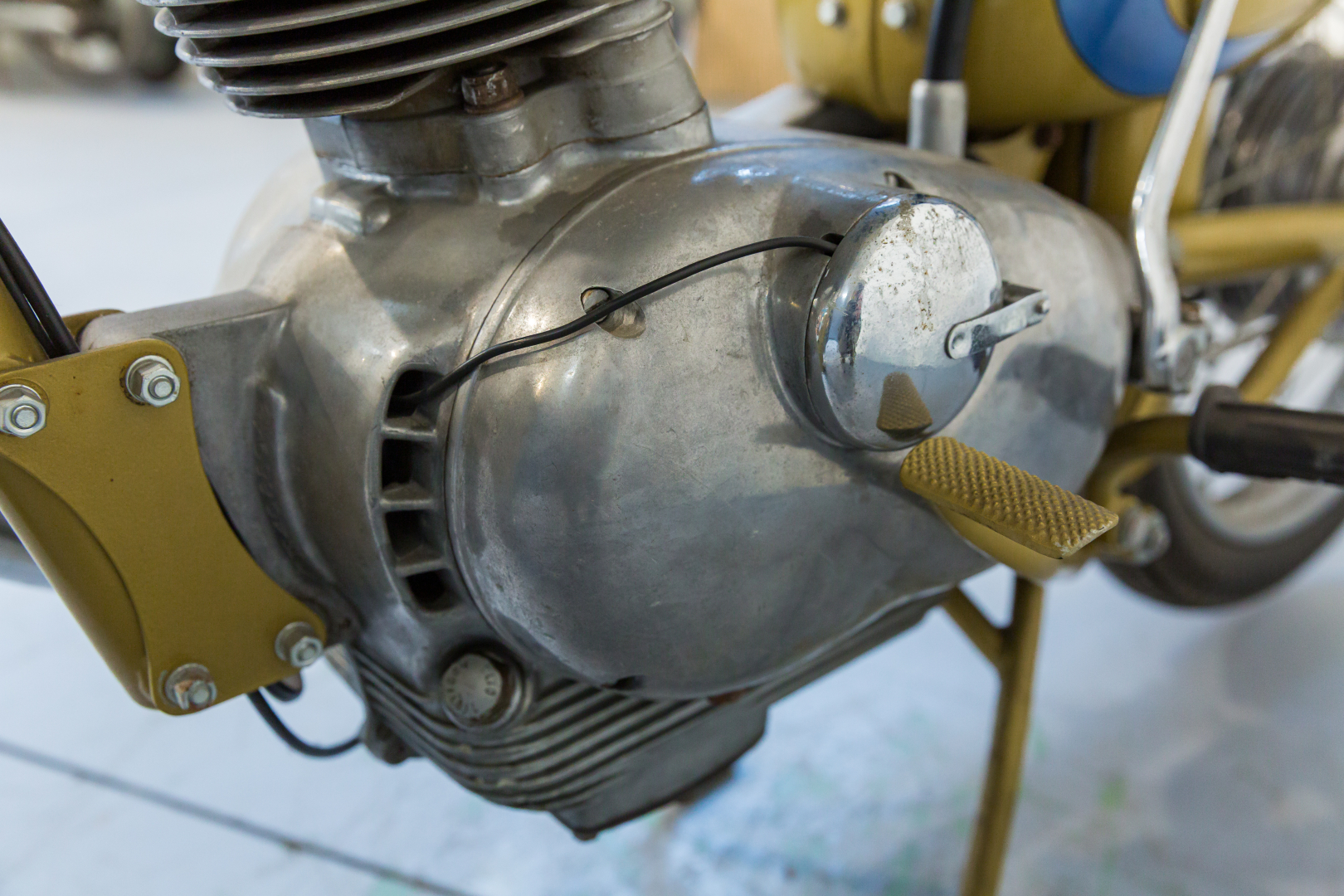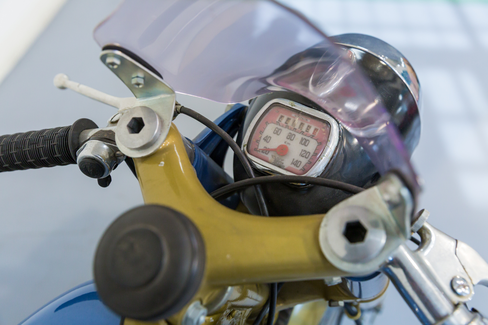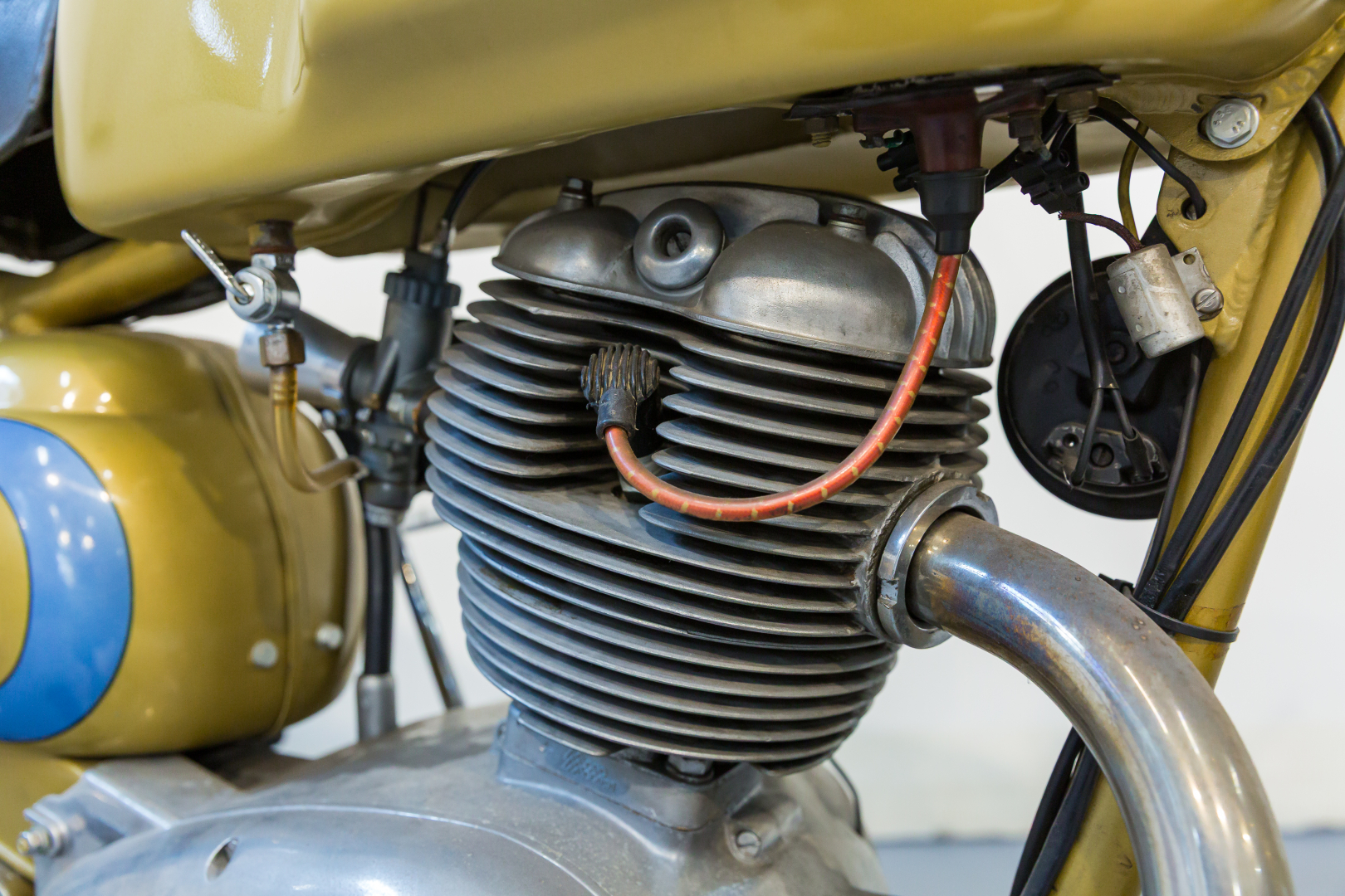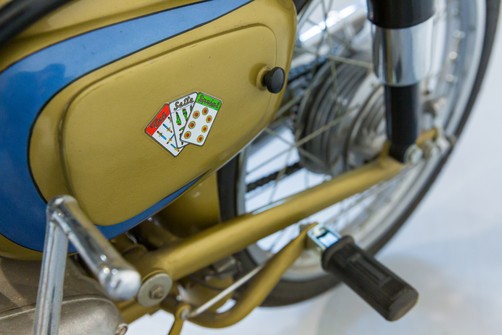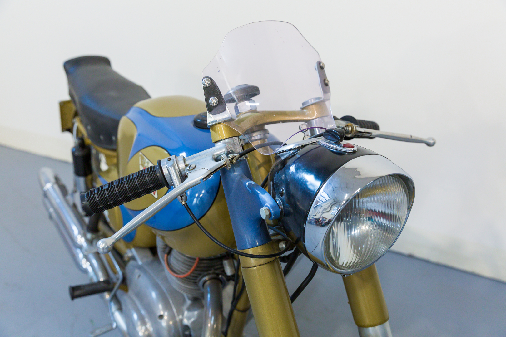 Moto Morini, the renowned Bologna-based company founded by Alfonso Morini in 1937, began by producing economical, reliable motorcycles before adding numerous successful sports models across various categories. Among its greatest hits was the 175 series, introduced in 1953, with the final and most refined model being the Tresette and its Sprint version. The Sprint featured mechanical upgrades such as a high-compression piston, a larger-diameter carburetor, and a revised exhaust, boosting power to 22 hp at a remarkable 10,000 rpm. This lively engine was well complemented by a strong chassis with an open cradle steel-tube frame, a telescopic fork, a swingarm with twin hydraulic shocks, and twin drum brakes with a double-cam front. Restored, excellent condition. A general inspection is recommended before use.