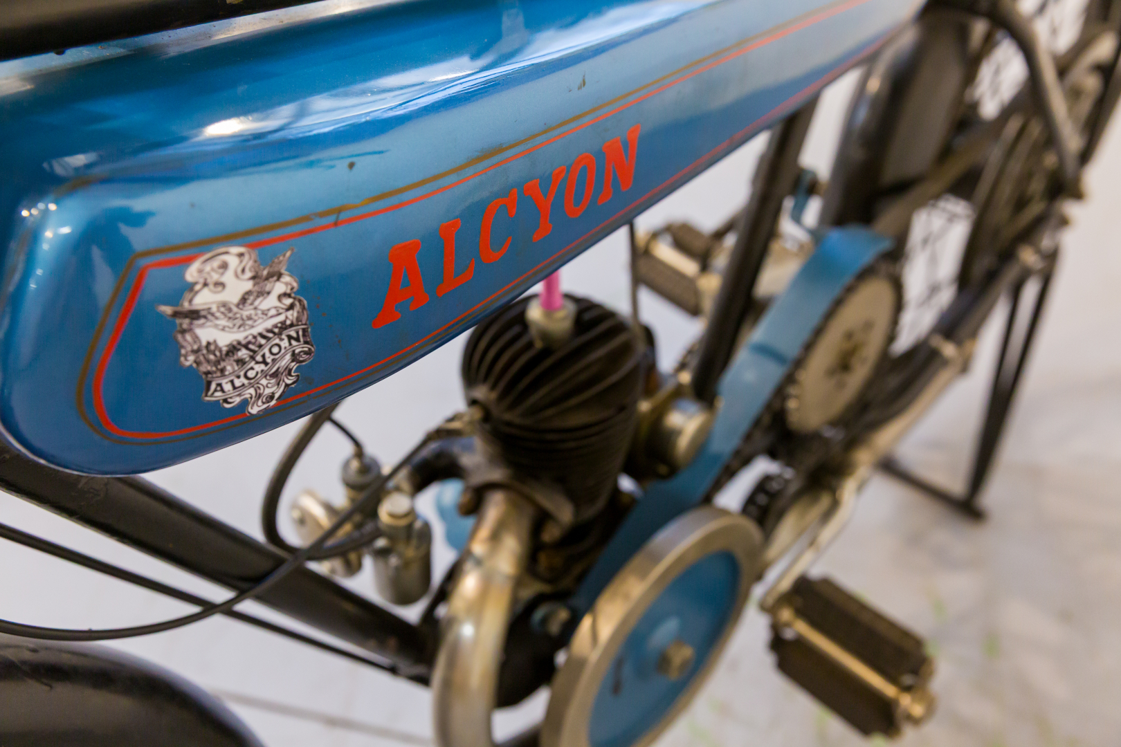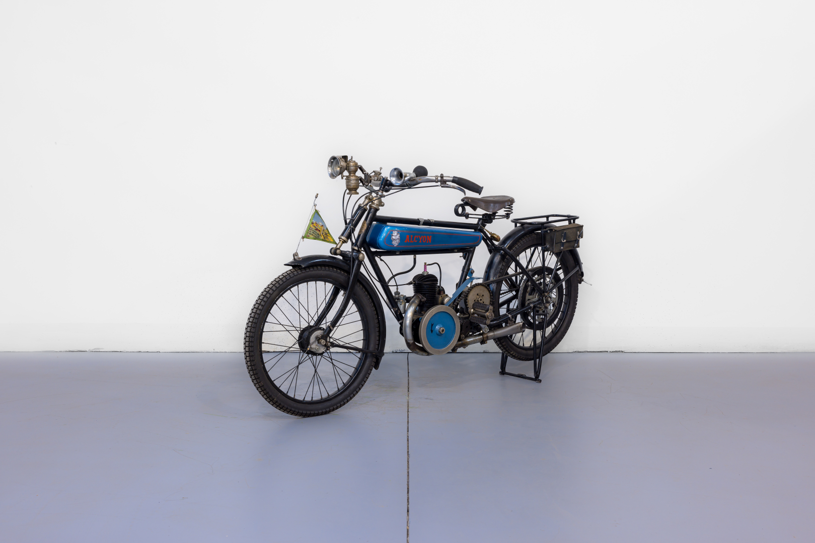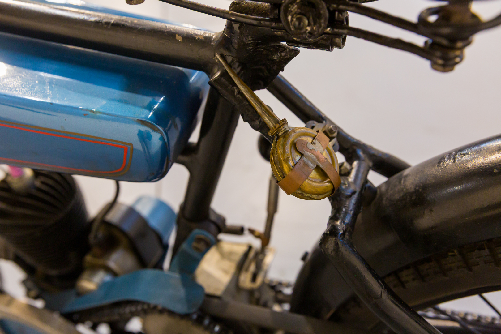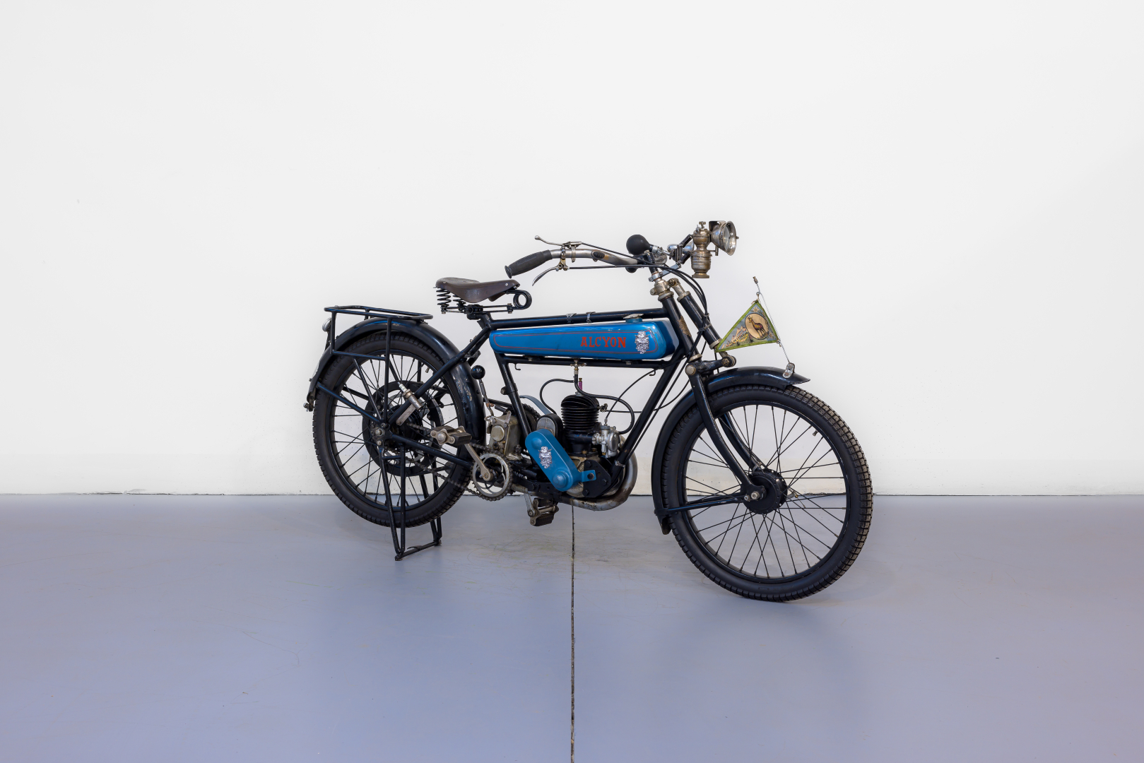 Alcyon is a French company founded by Edmond Gentil in 1890 in Neuilly‑sur‑Seine, using the namesake halcyon bird as its logo. Bicycle production soon grew significantly, from a few thousand annually to an impressive 40,000 units in 1909. Alongside bicycle production, to meet user needs they modified frames to pair them with engines. The example offered features a reinforced frame, a front suspension with a central spring located ahead of the steering head, a rear block brake, and a 175 cc two‑stroke single with magneto ignition, two‑speed gearbox, and final chain drive. Undergoing a conservation restoration, it is in running order and is a decidedly rare piece—very interesting for early‑1900s motor‑bicycle enthusiasts. A general check is recommended before use.