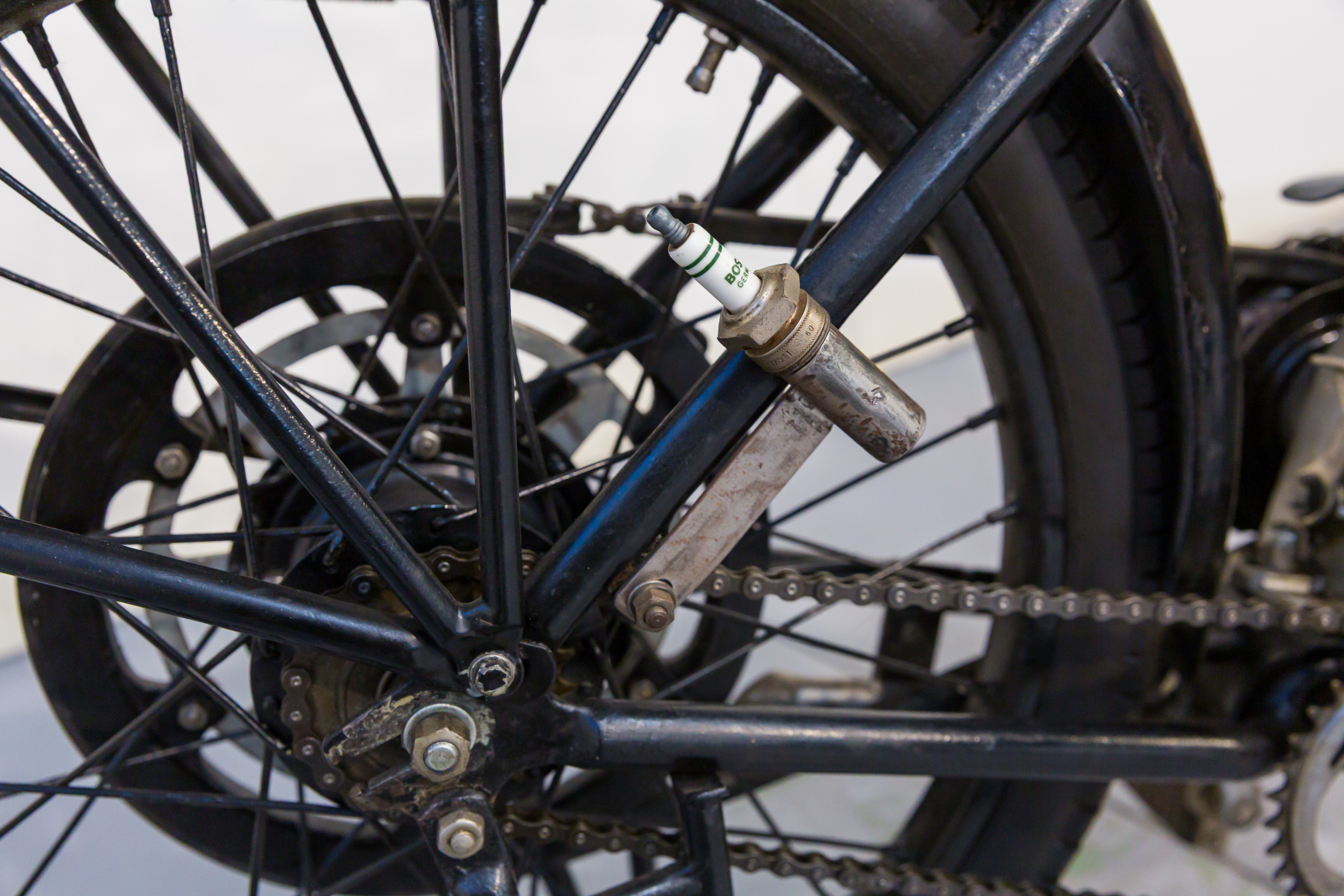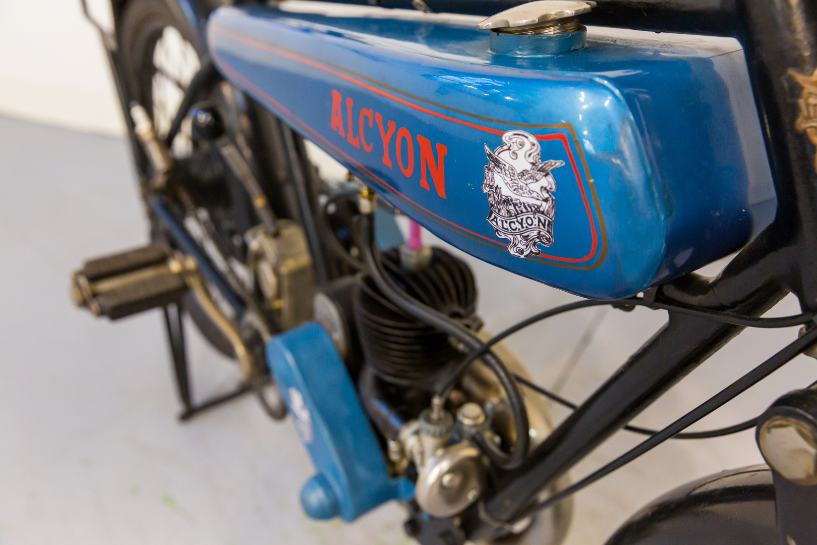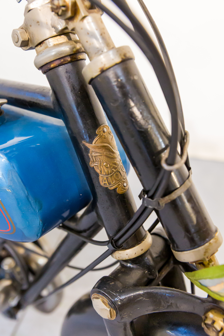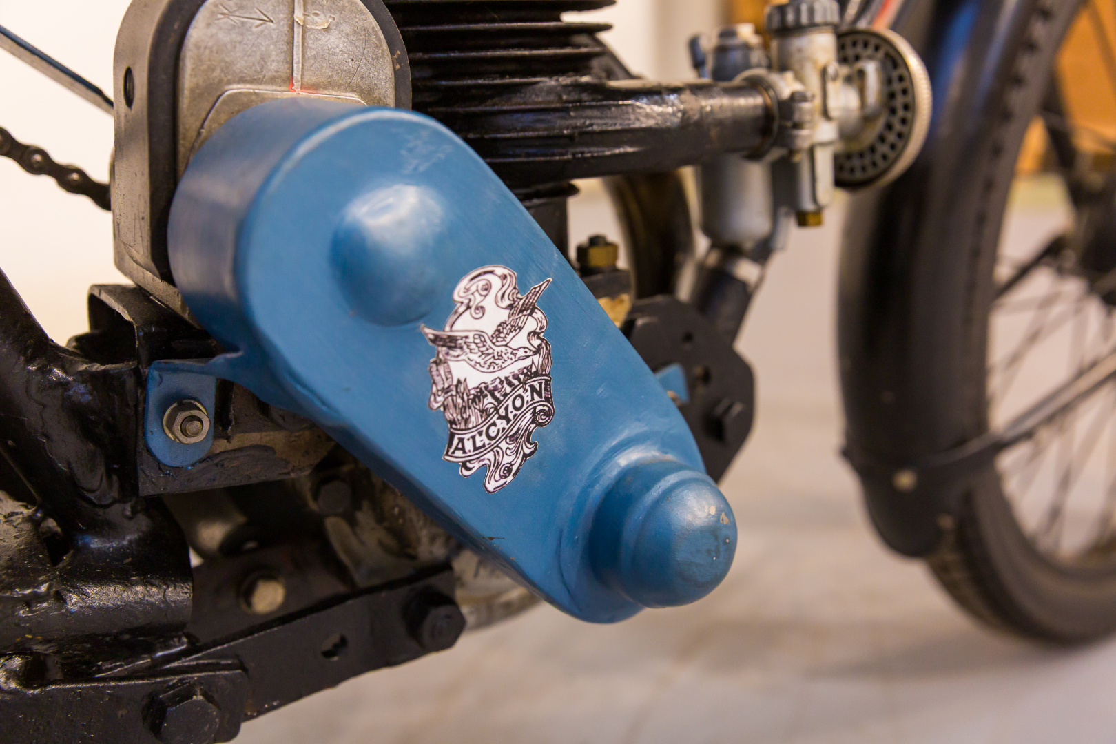 Alcyon is a French company founded by Edmond Gentil in 1890 in Neuilly‑sur‑Seine, using the namesake halcyon bird as its logo. Bicycle production soon grew significantly, from a few thousand annually to an impressive 40,000 units in 1909. Alongside bicycle production, to meet user needs they modified frames to pair them with engines. The example offered features a reinforced frame, a front suspension with a central spring located ahead of the steering head, a rear block brake, and a 175 cc two‑stroke single with magneto ignition, two‑speed gearbox, and final chain drive. Undergoing a conservation restoration, it is in running order and is a decidedly rare piece—very interesting for early‑1900s motor‑bicycle enthusiasts. A general check is recommended before use.
