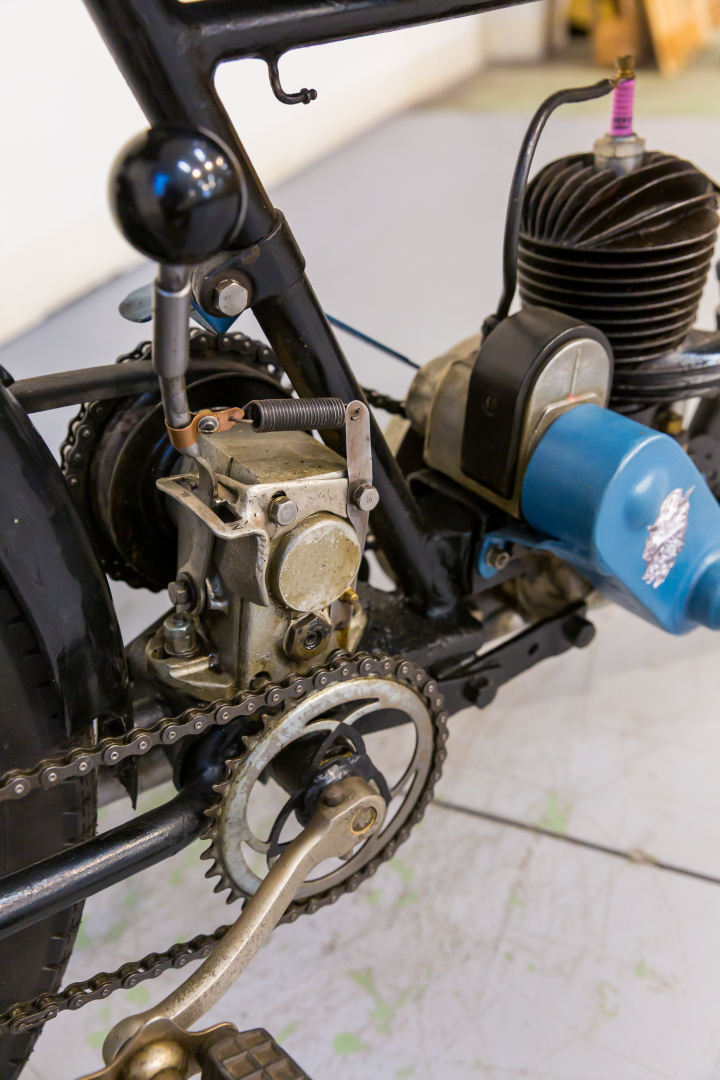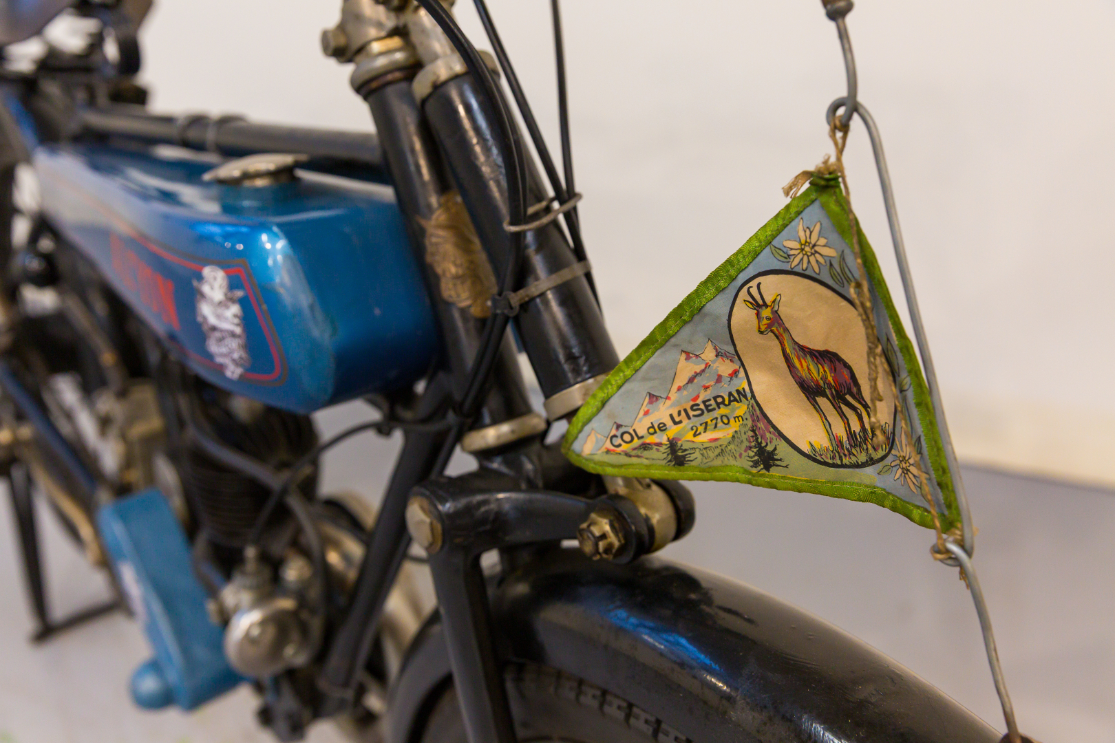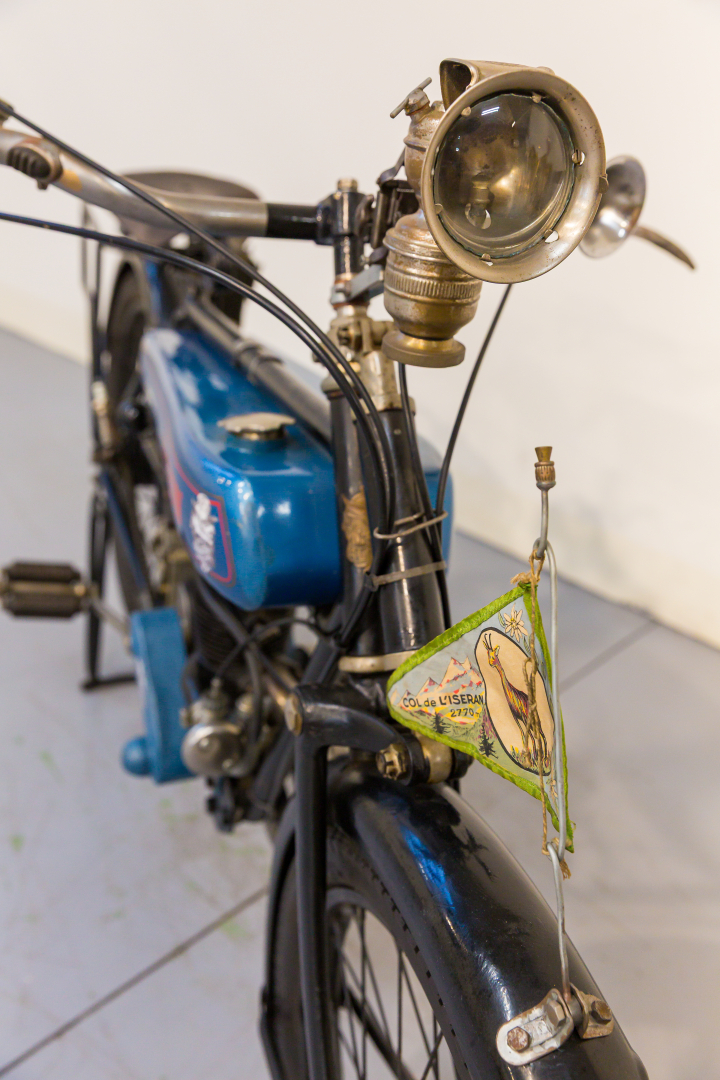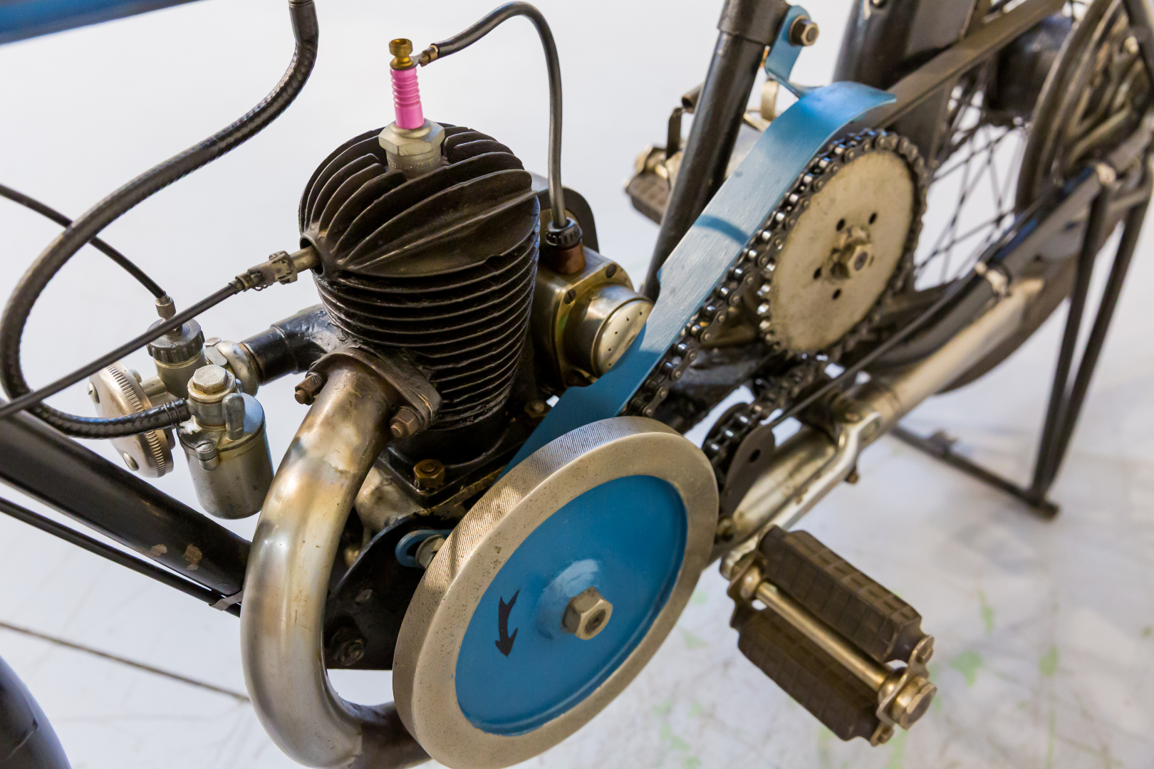 Alcyon is a French company founded by Edmond Gentil in 1890 in Neuilly‑sur‑Seine, using the namesake halcyon bird as its logo. Bicycle production soon grew significantly, from a few thousand annually to an impressive 40,000 units in 1909. Alongside bicycle production, to meet user needs they modified frames to pair them with engines. The example offered features a reinforced frame, a front suspension with a central spring located ahead of the steering head, a rear block brake, and a 175 cc two‑stroke single with magneto ignition, two‑speed gearbox, and final chain drive. Undergoing a conservation restoration, it is in running order and is a decidedly rare piece—very interesting for early‑1900s motor‑bicycle enthusiasts. A general check is recommended before use.
