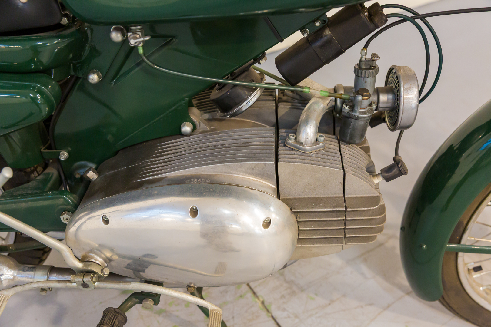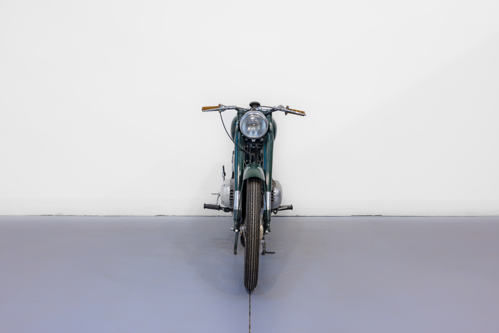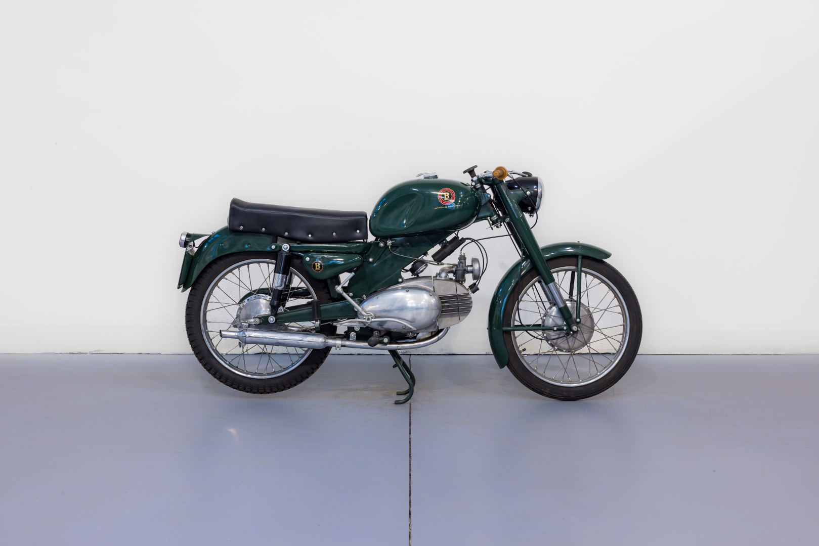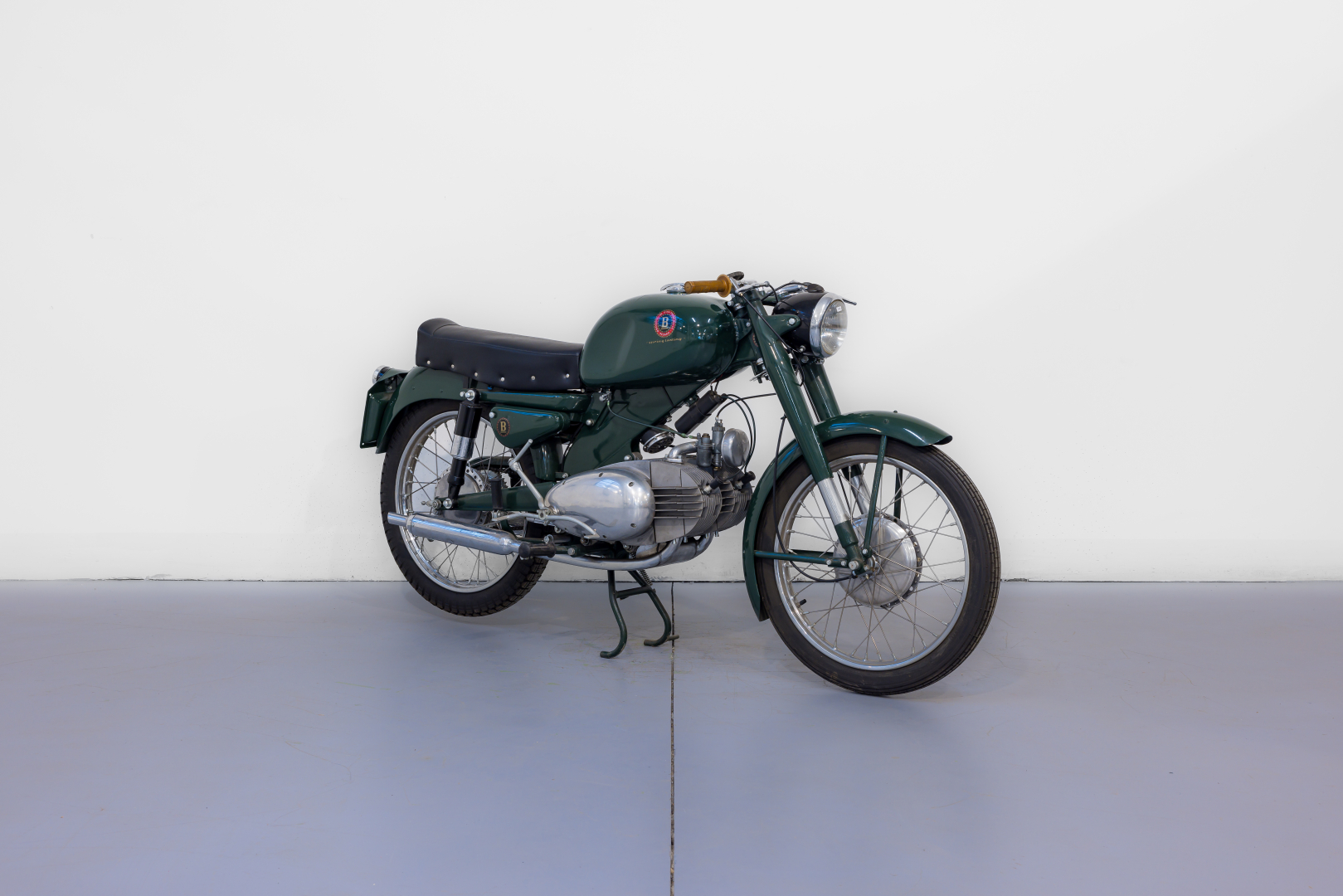 The irreconcilable family disputes that led to the separation of the Benelli brothers and Giuseppe’s creation of the new Motobi brand resulted in a range of technically and stylistically interesting models. In the mid‑displacement class (250 cc), Motobi launched the Spring Lasting in 1952 as a rival to the Benelli Leonessa. It featured the brand’s distinctive egg‑shaped engine—this time a two‑stroke twin with centrifugal rotary‑valve induction, an advanced but complex system later replaced by a conventional setup using a carburetor with a split intake manifold. Restored, excellent condition.