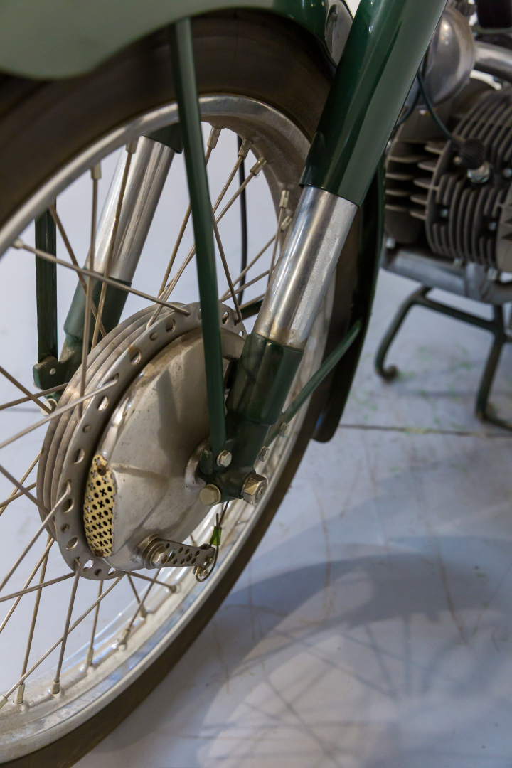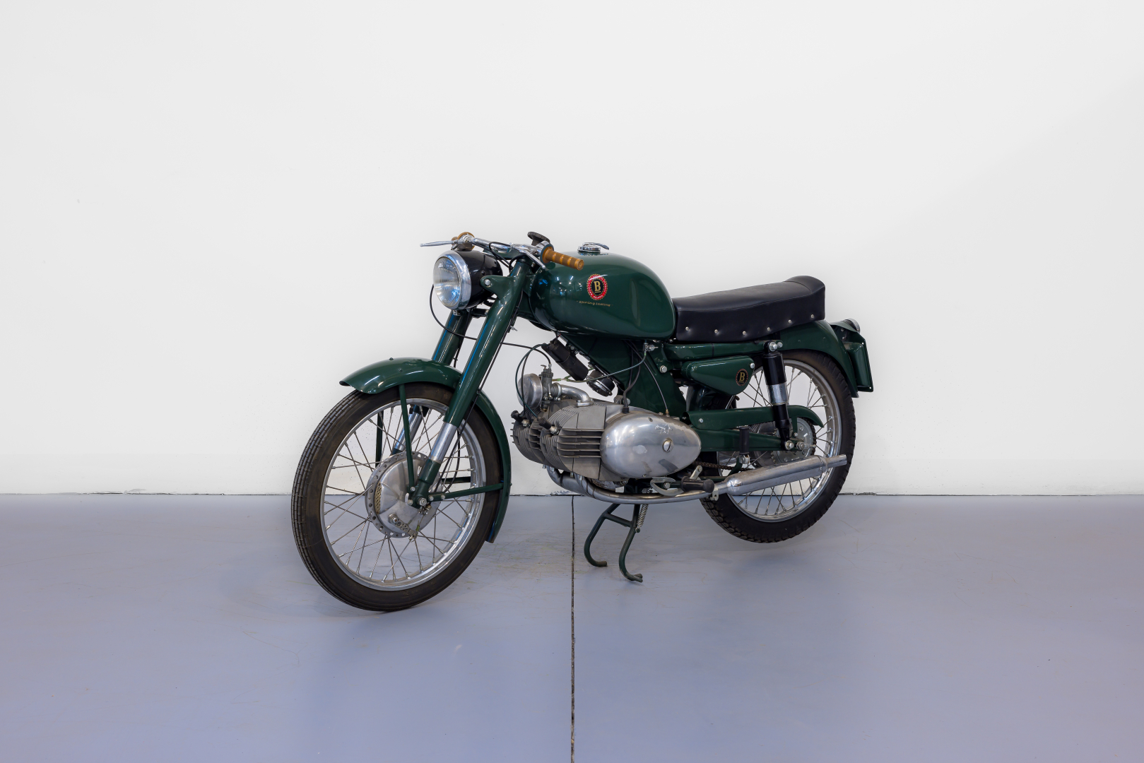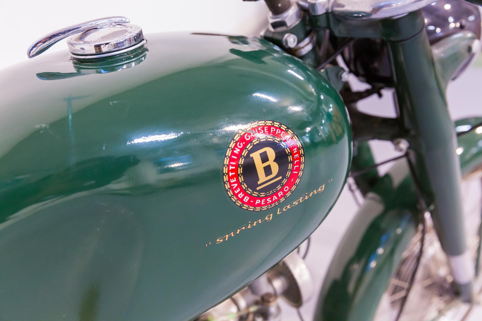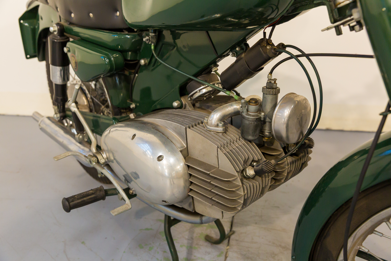The irreconcilable family disputes that led to the separation of the Benelli brothers and Giuseppe’s creation of the new Motobi brand resulted in a range of technically and stylistically interesting models. In the mid‑displacement class (250 cc), Motobi launched the Spring Lasting in 1952 as a rival to the Benelli Leonessa. It featured the brand’s distinctive egg‑shaped engine—this time a two‑stroke twin with centrifugal rotary‑valve induction, an advanced but complex system later replaced by a conventional setup using a carburetor with a split intake manifold. Restored, excellent condition.