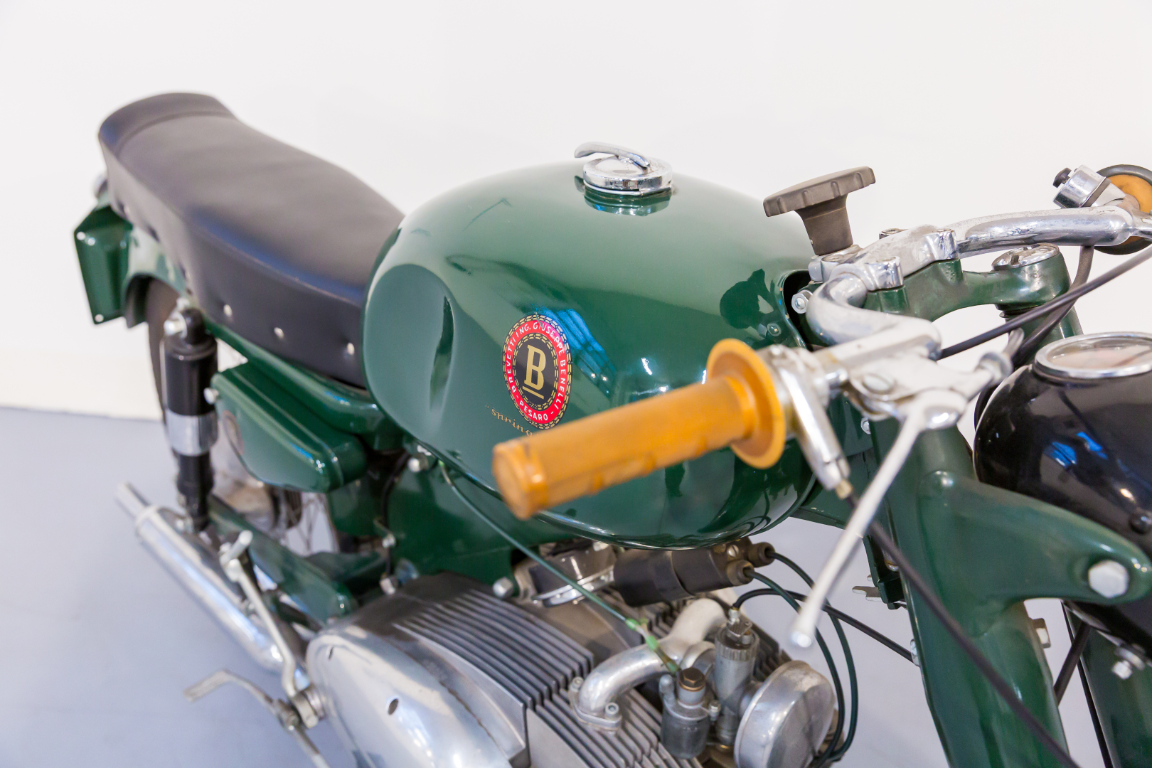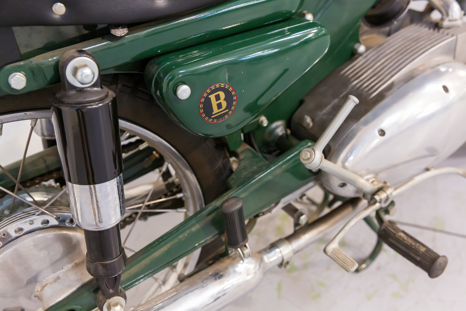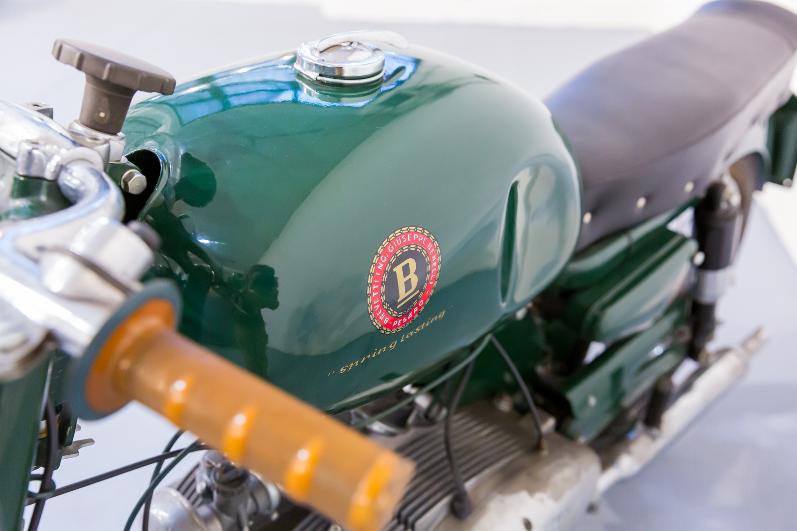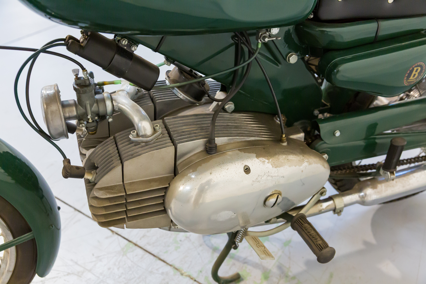 The irreconcilable family disputes that led to the separation of the Benelli brothers and Giuseppe’s creation of the new Motobi brand resulted in a range of technically and stylistically interesting models. In the mid‑displacement class (250 cc), Motobi launched the Spring Lasting in 1952 as a rival to the Benelli Leonessa. It featured the brand’s distinctive egg‑shaped engine—this time a two‑stroke twin with centrifugal rotary‑valve induction, an advanced but complex system later replaced by a conventional setup using a carburetor with a split intake manifold. Restored, excellent condition.