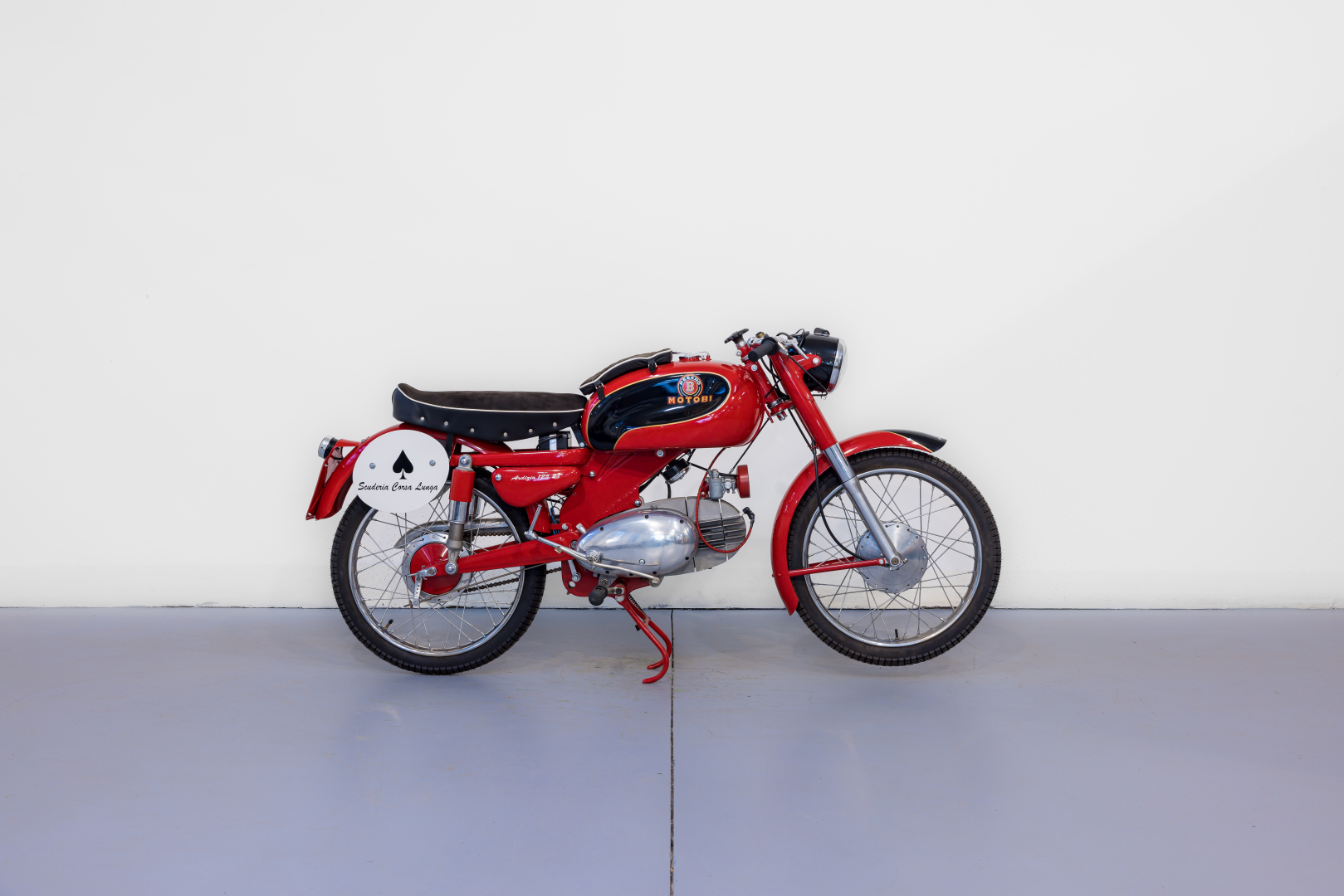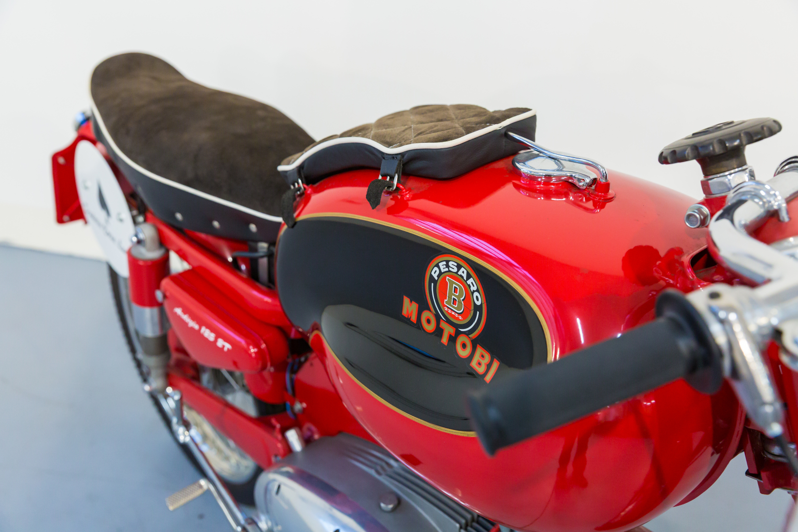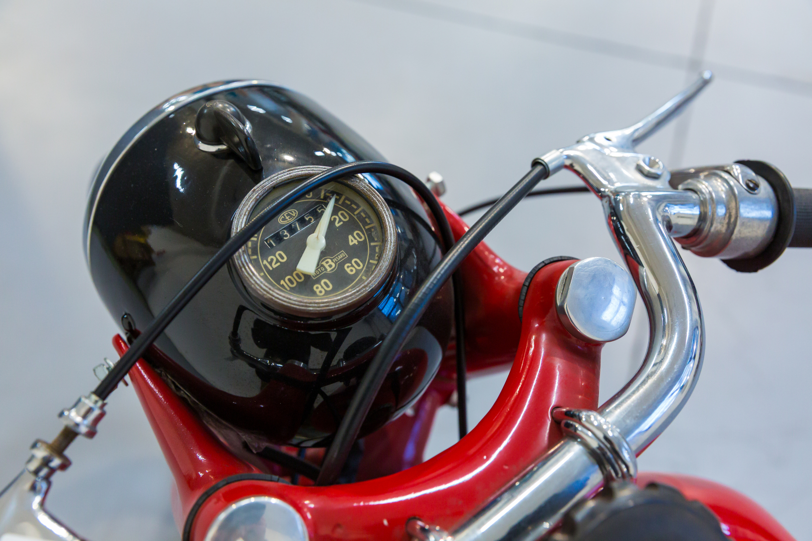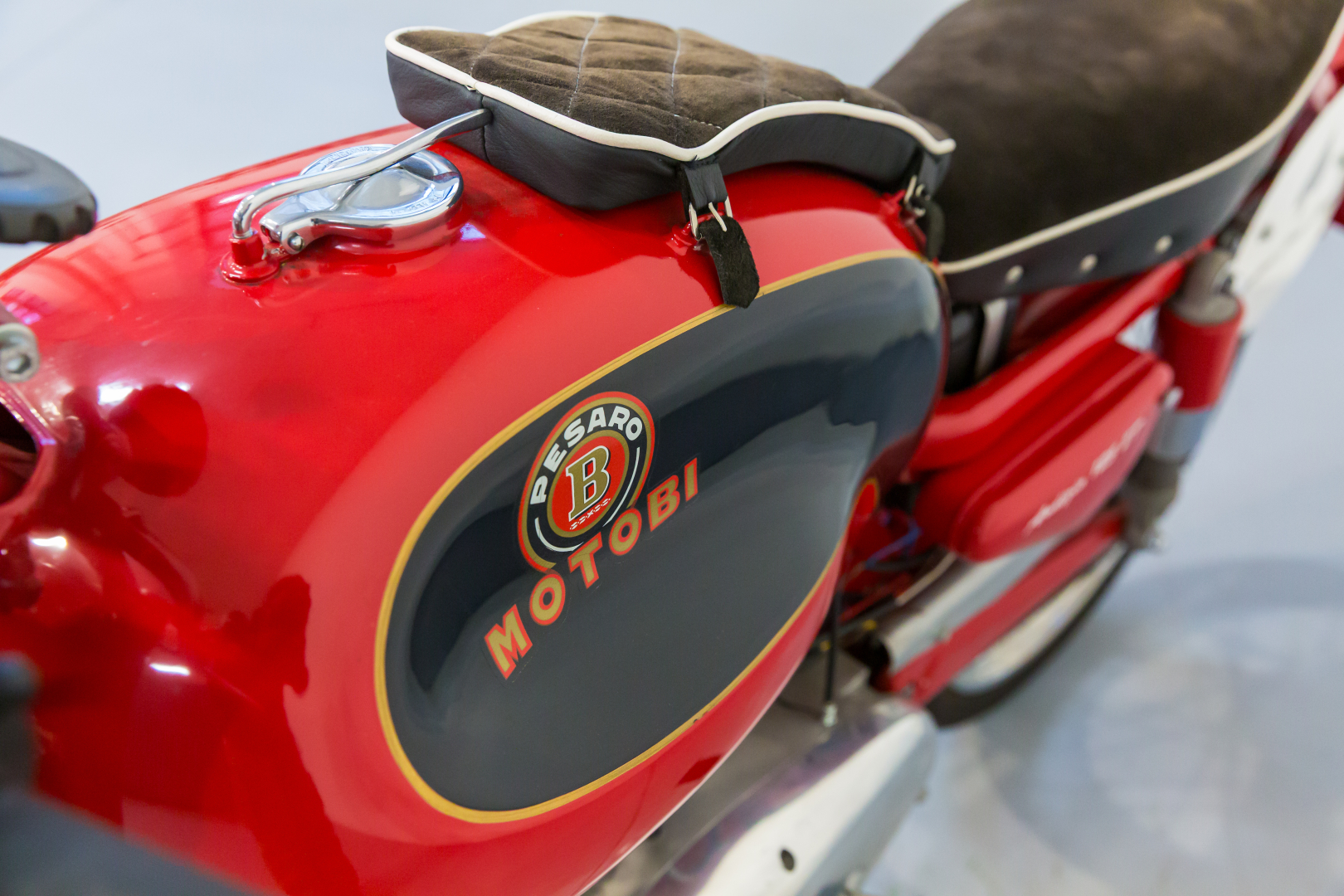 Light motorcycle produced by Motobi of Pesaro from 1955, powered by a 125 cc horizontal two-stroke single-cylinder engine with the characteristic “egg-shaped” design. It featured a four-speed gearbox, pressed-steel monobeam frame, telescopic front fork, swingarm with twin hydraulic shocks, 19" wheels, and side drum brakes. Missing exhaust. Preserved, excellent condition. A general inspection is recommended before use.