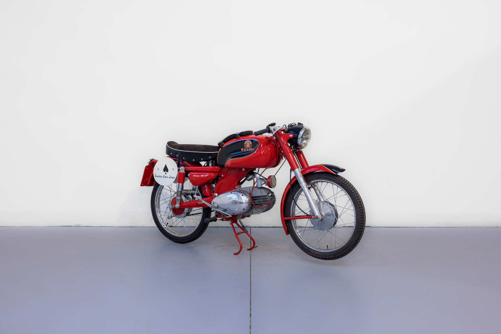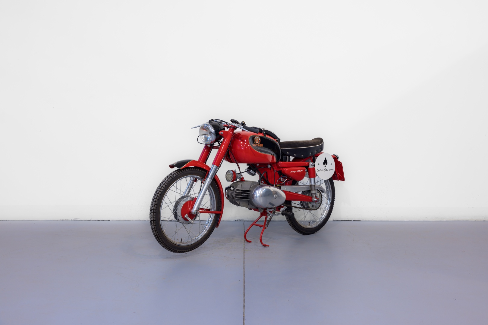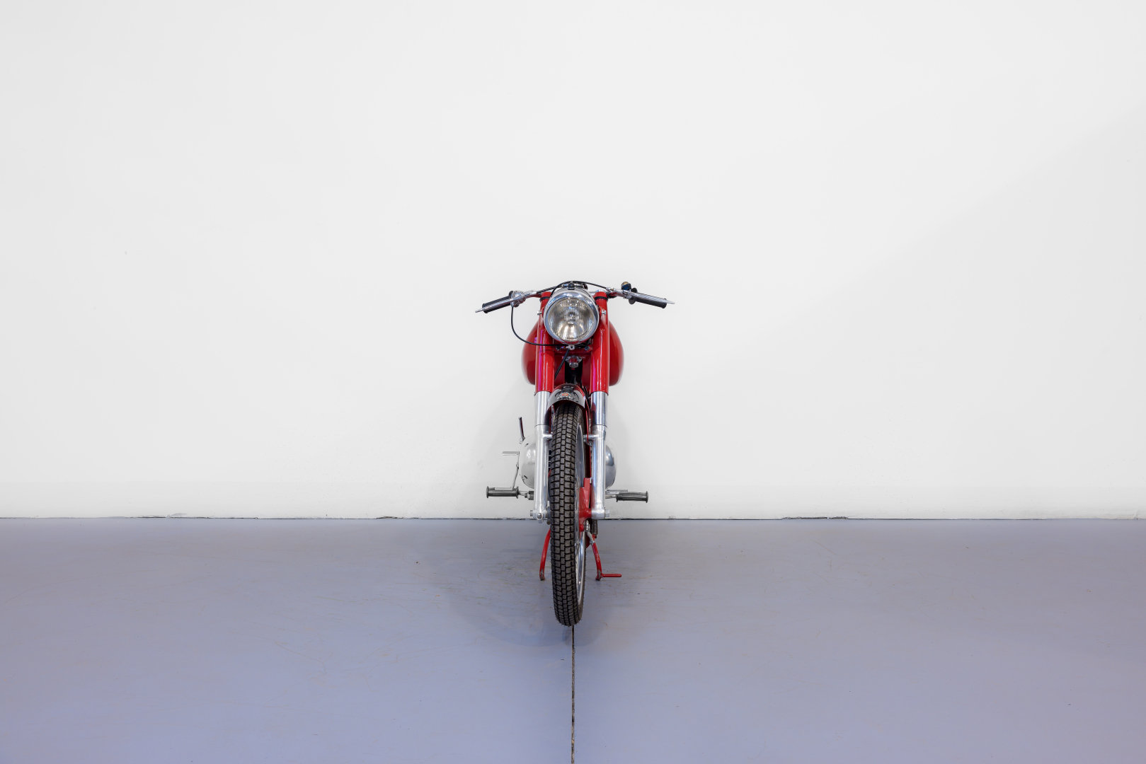 Light motorcycle produced by Motobi of Pesaro from 1955, powered by a 125 cc horizontal two-stroke single-cylinder engine with the characteristic “egg-shaped” design. It featured a four-speed gearbox, pressed-steel monobeam frame, telescopic front fork, swingarm with twin hydraulic shocks, 19" wheels, and side drum brakes. Missing exhaust. Preserved, excellent condition. A general inspection is recommended before use.