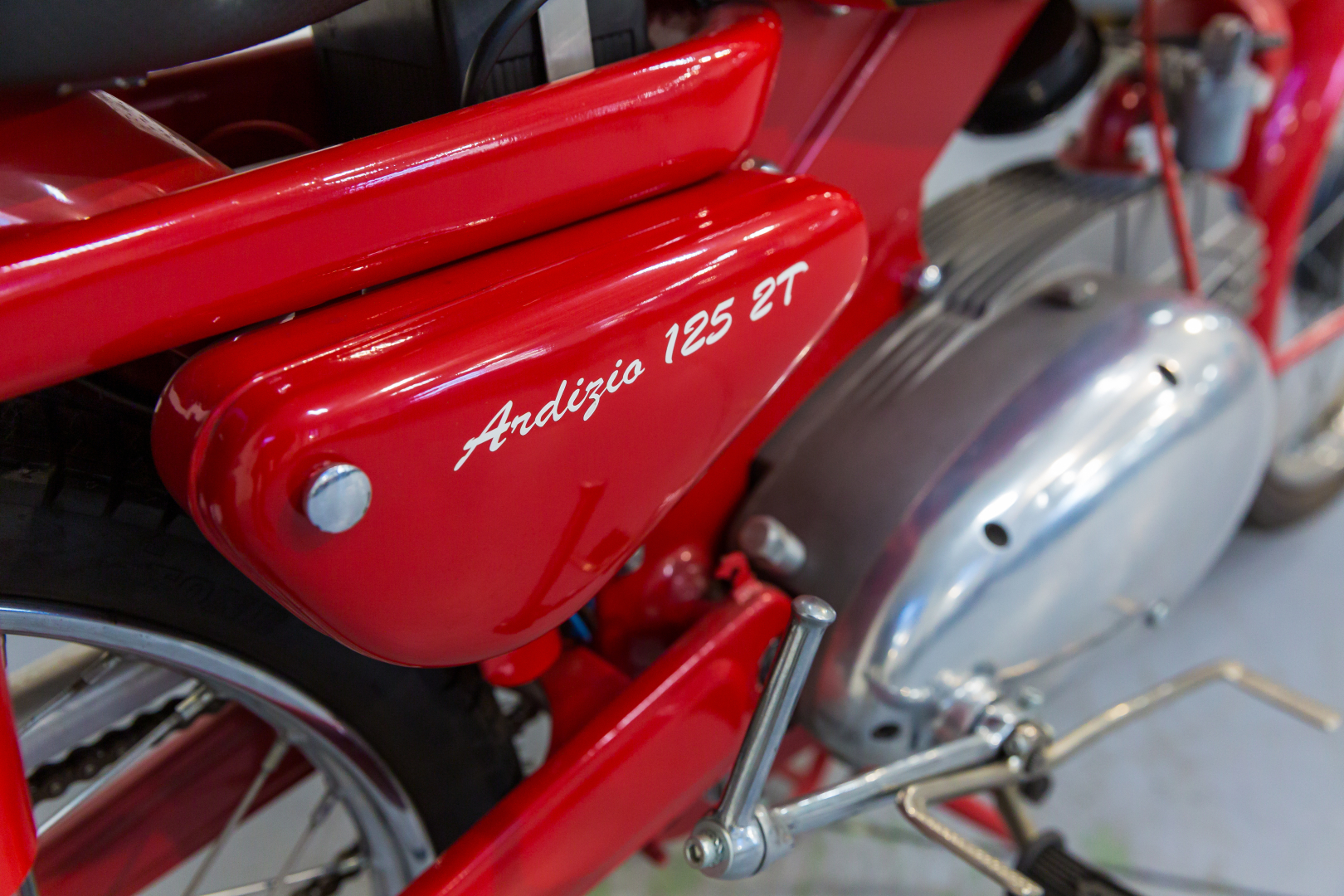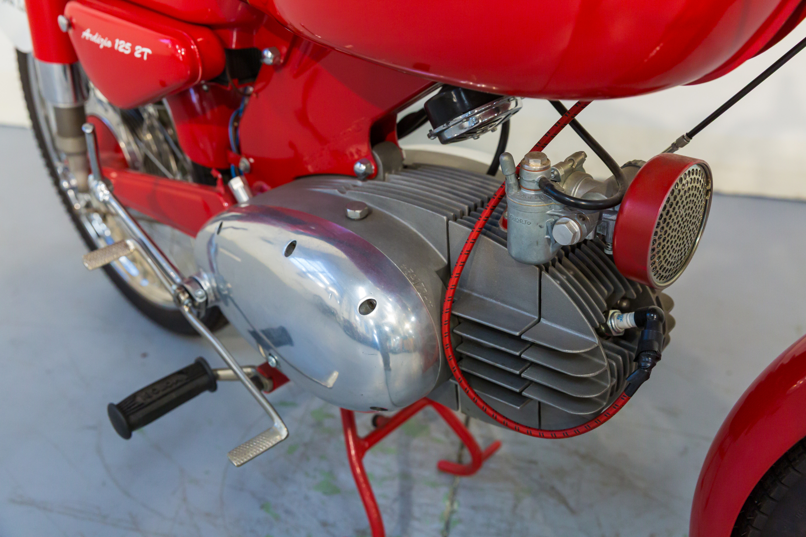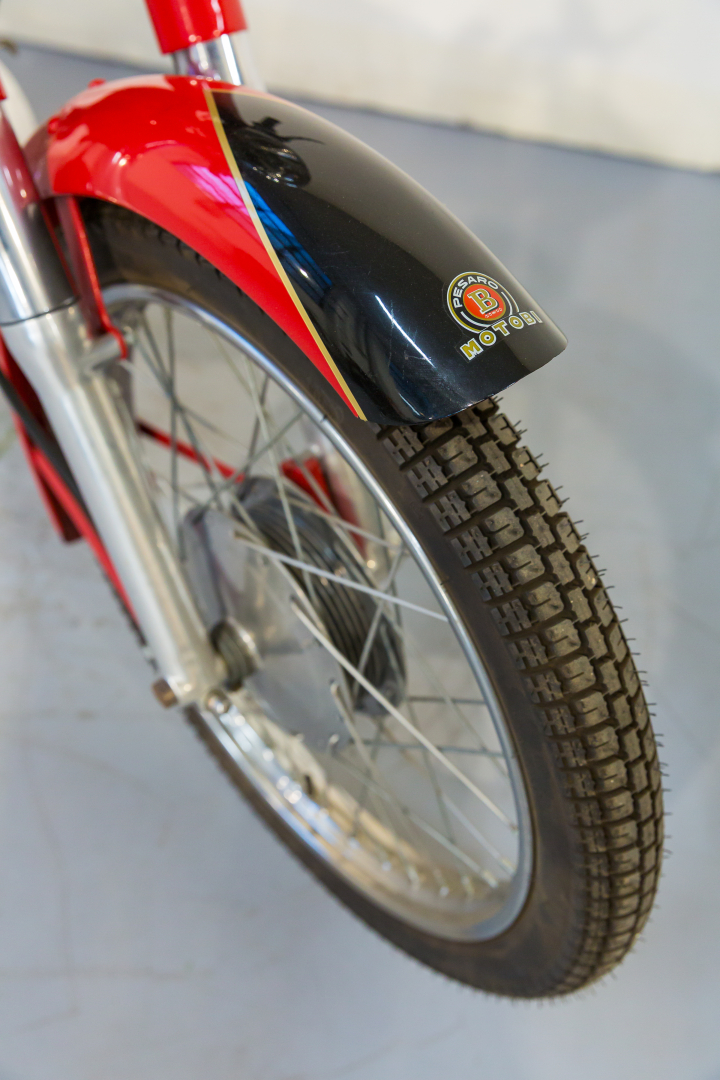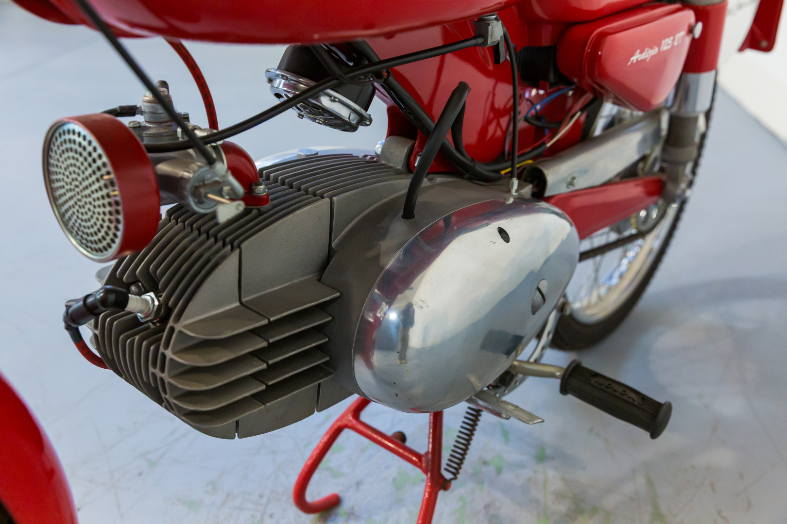 Light motorcycle produced by Motobi of Pesaro from 1955, powered by a 125 cc horizontal two-stroke single-cylinder engine with the characteristic “egg-shaped” design. It featured a four-speed gearbox, pressed-steel monobeam frame, telescopic front fork, swingarm with twin hydraulic shocks, 19" wheels, and side drum brakes. Missing exhaust. Preserved, excellent condition. A general inspection is recommended before use.