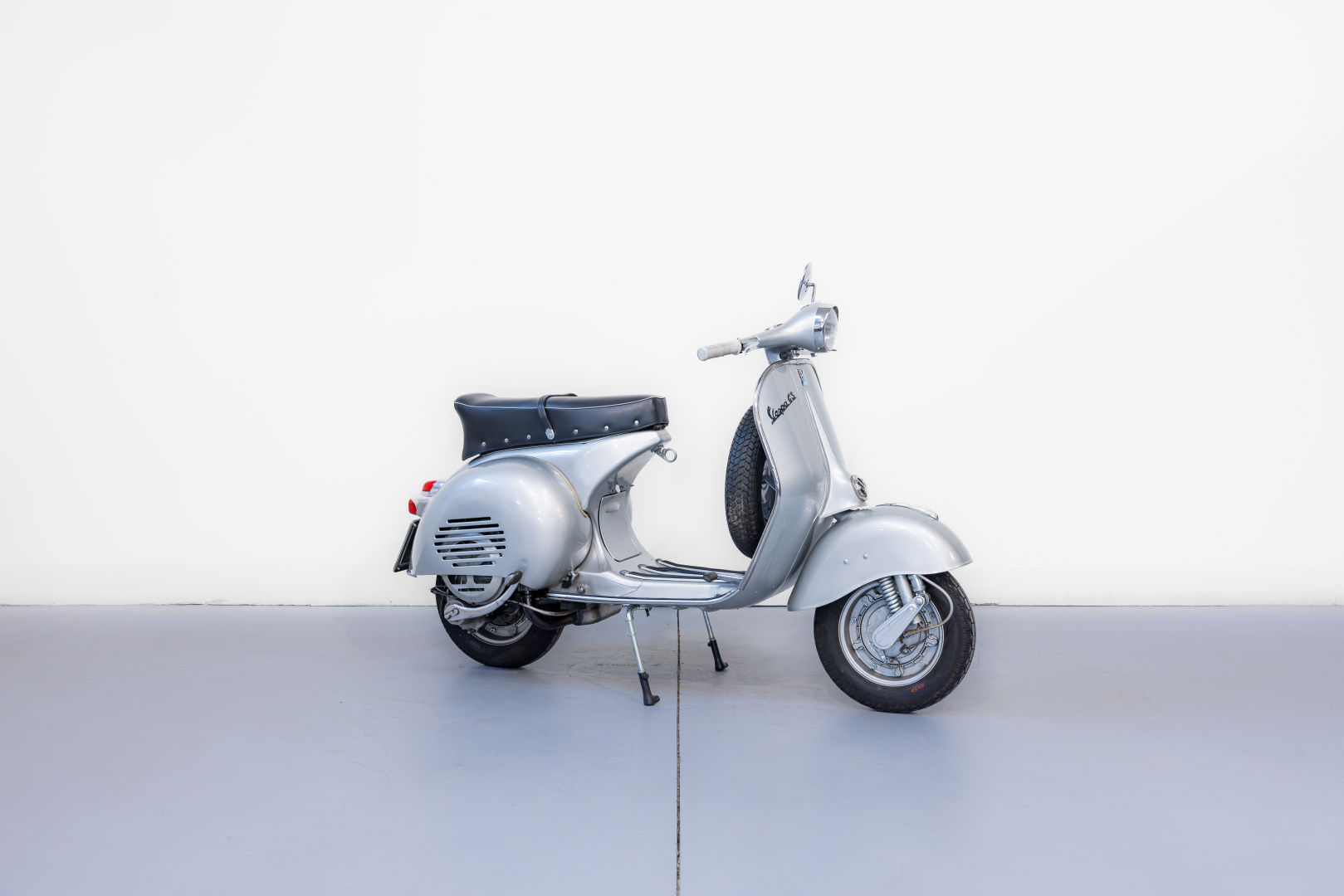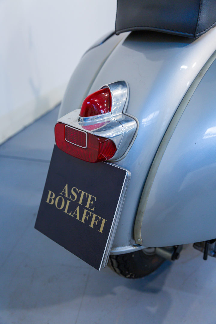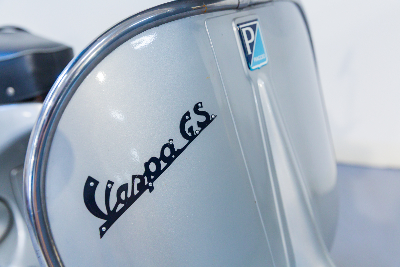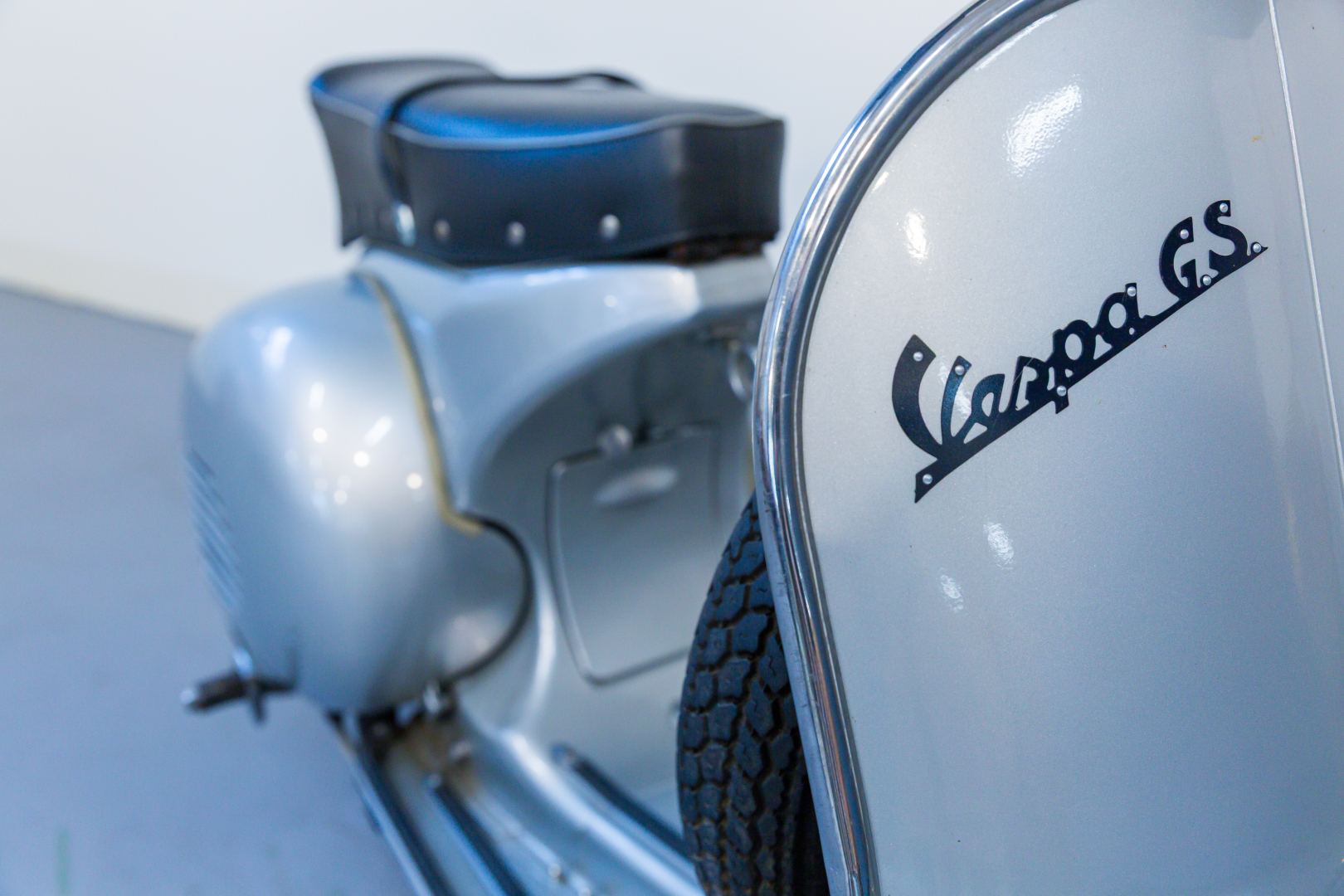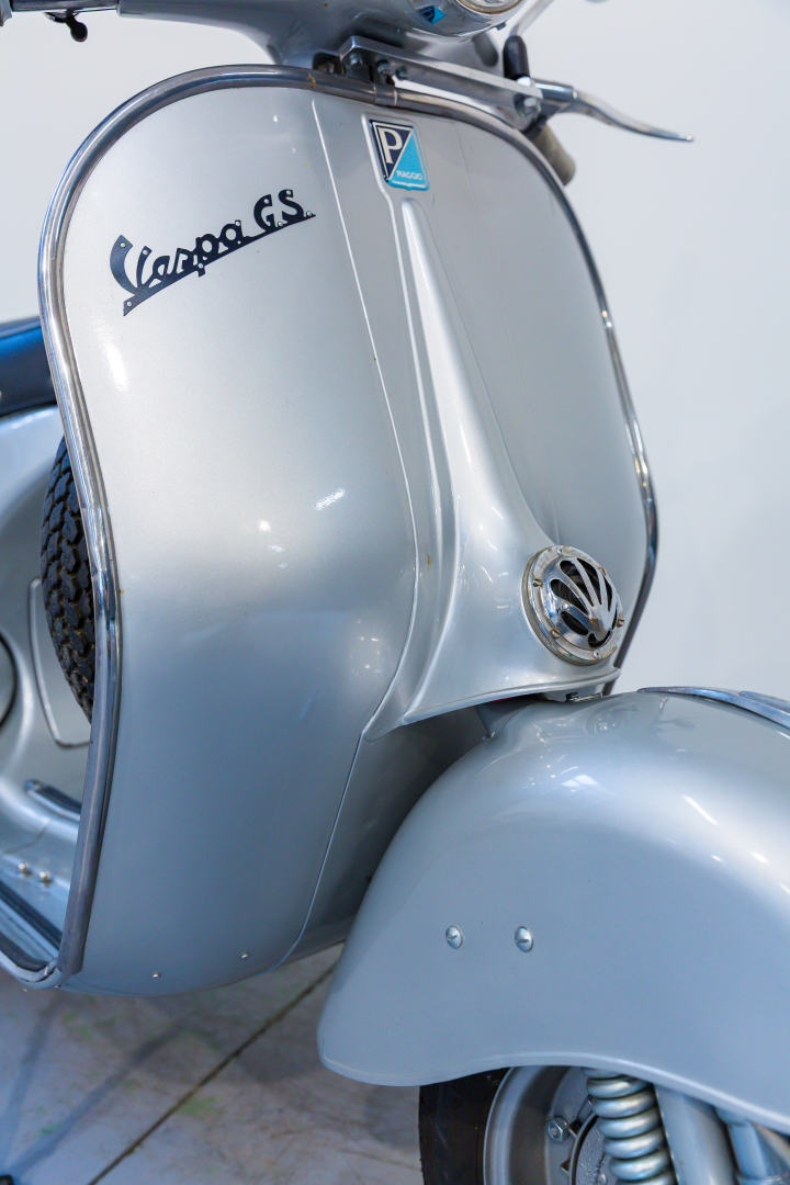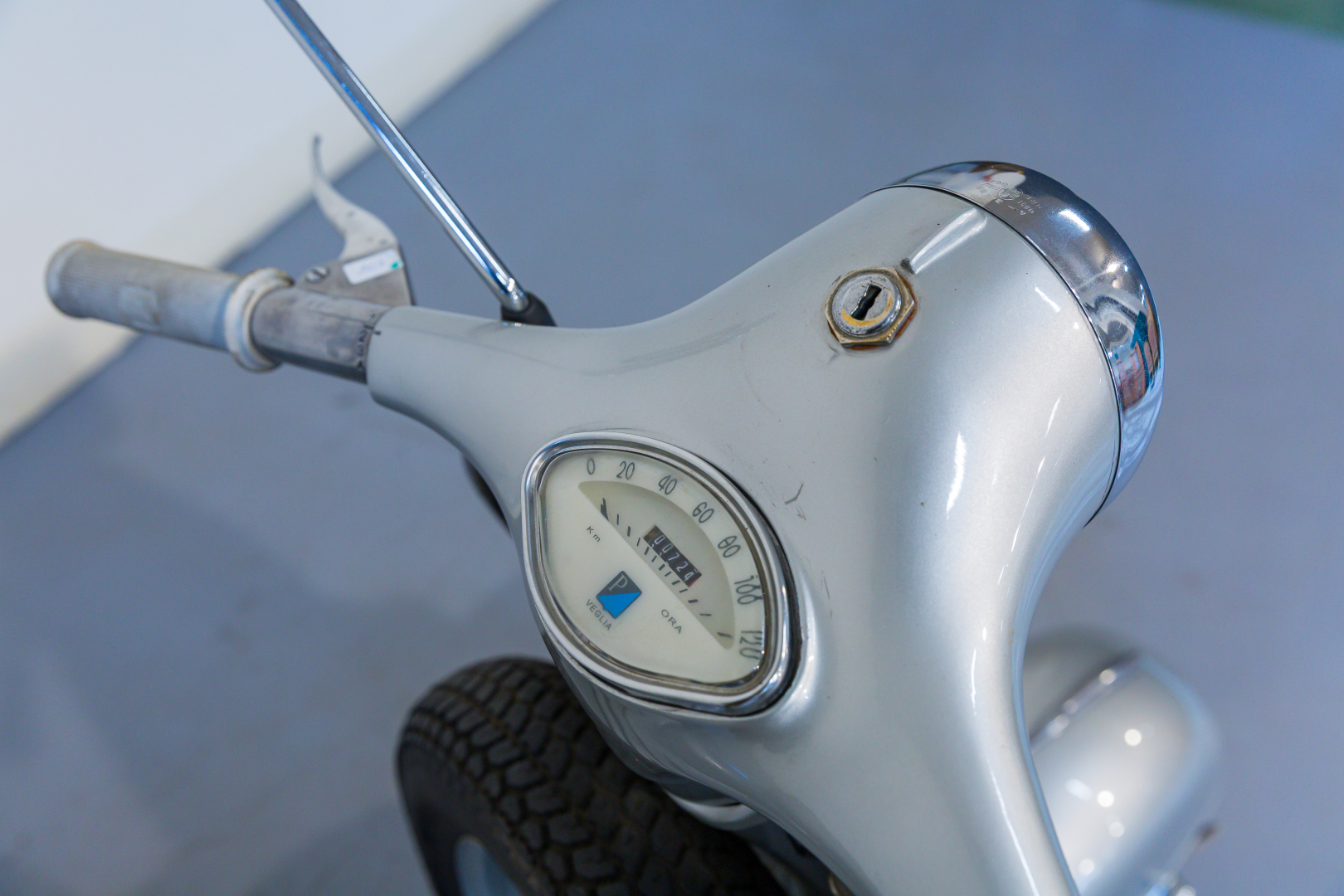 The Vespa model designated VS5M was officially introduced in 1961. The engine was similar to the earlier GS 150, but the main updates concerned the braking system, now featuring ventilated drums, new brake and clutch levers, a ring-shaped luggage hook in front of the seat, and a white-faced speedometer with a 120 km/h scale. The carburetor requires inspection. Excellent overall condition, ASI certified. A general inspection is recommended before use.