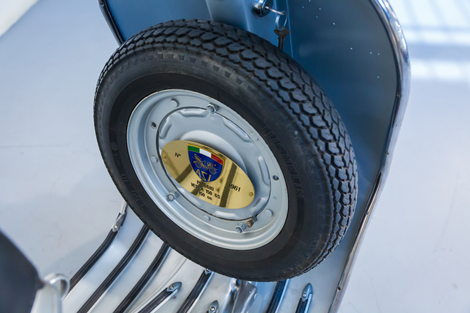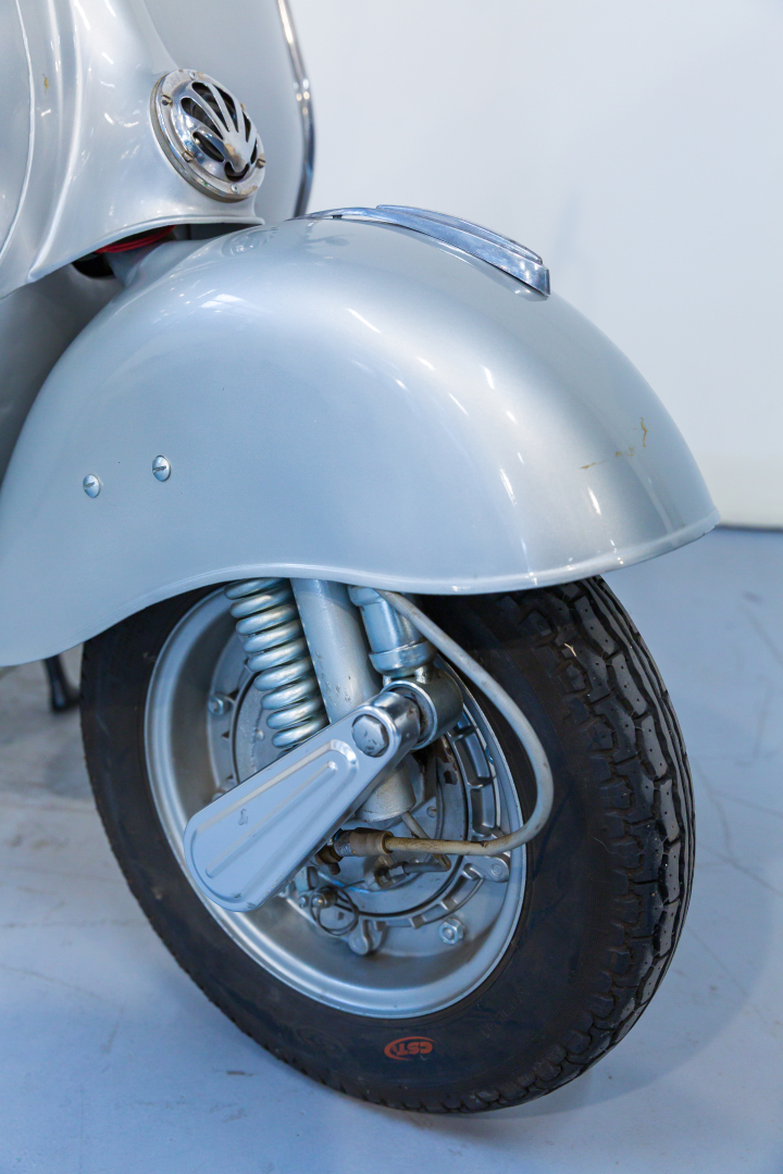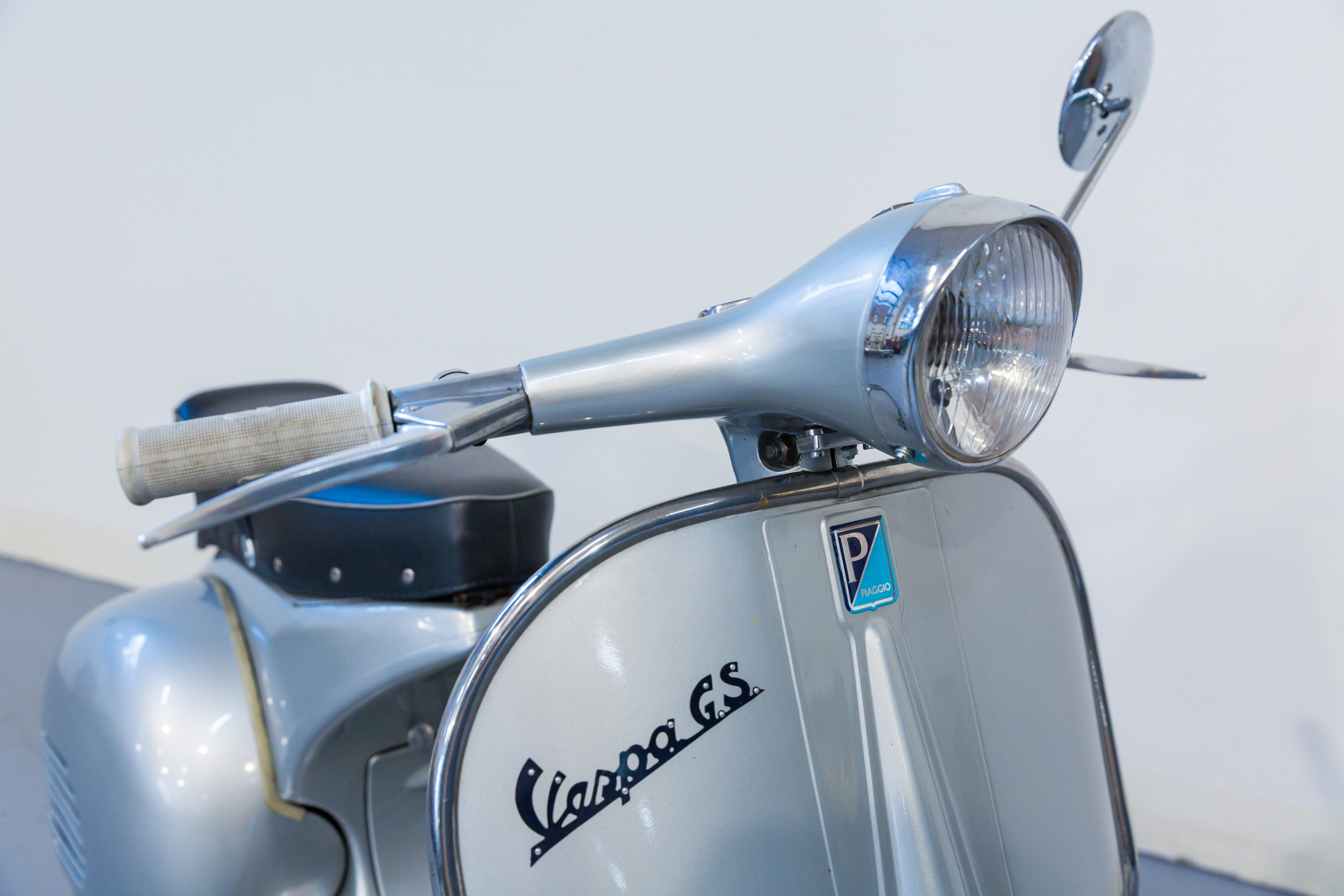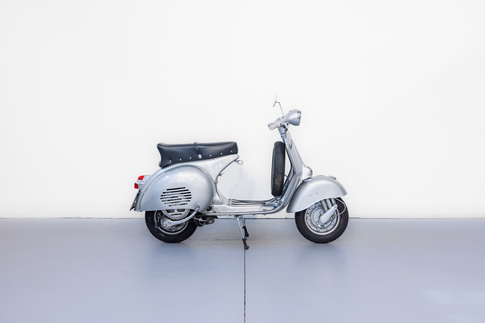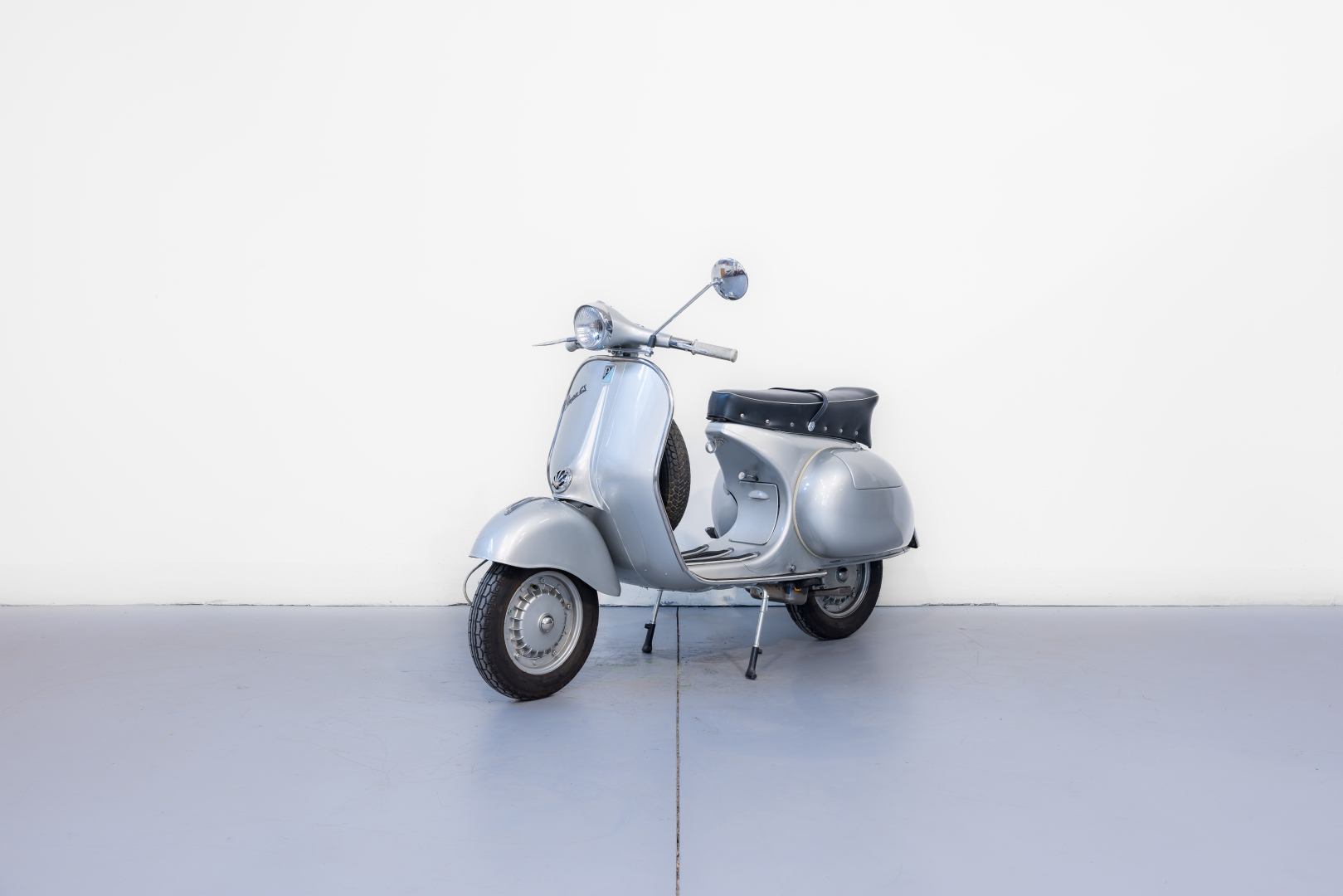 The Vespa model designated VS5M was officially introduced in 1961. The engine was similar to the earlier GS 150, but the main updates concerned the braking system, now featuring ventilated drums, new brake and clutch levers, a ring-shaped luggage hook in front of the seat, and a white-faced speedometer with a 120 km/h scale. The carburetor requires inspection. Excellent overall condition, ASI certified. A general inspection is recommended before use.
