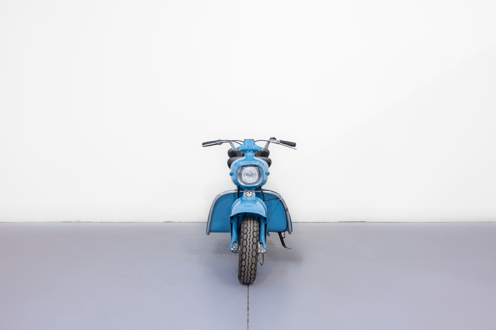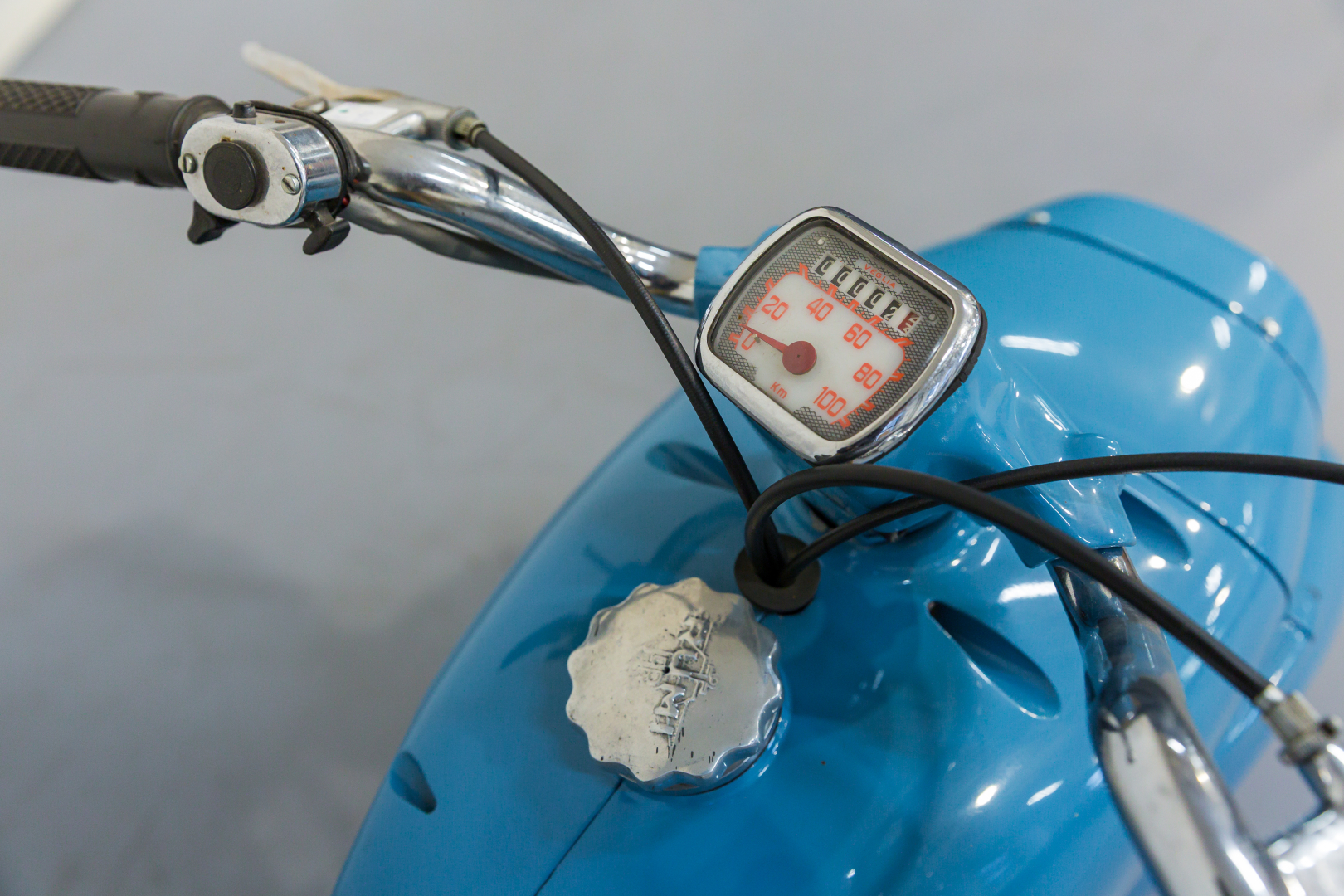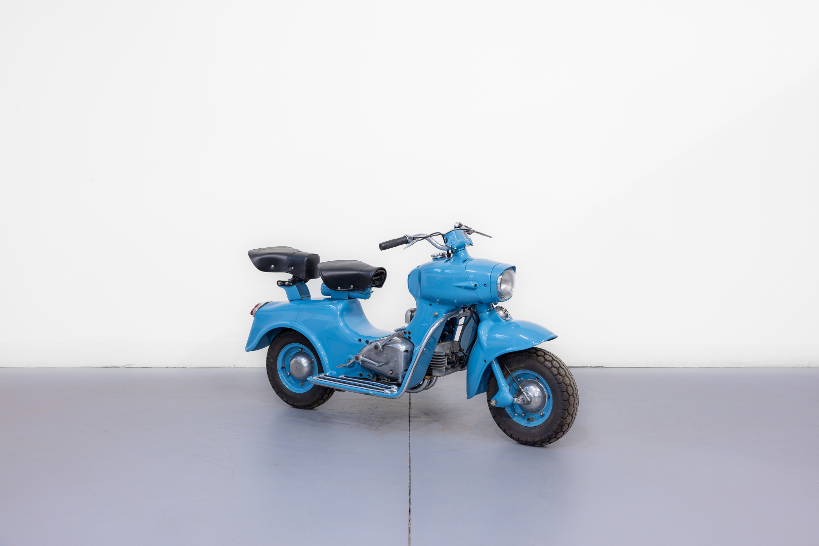 Born from the creativity of Donnino Rumi in 1954, following in the wake of Piaggio and Innocenti’s successes, the Formichino featured a load‑bearing aluminum body: a front section incorporating the fork, headlight, and fuel tank, and a rear section forming the seat base. It used the proven and powerful engine from the famous “Turismo,” a two‑stroke twin with horizontally opposed cylinders fed by a single carburetor, giving the scooter excellent performance. The Formichino offered here is a 1956 model distinguished by a rear body section split into two parts and the addition of a speedometer/odometer. It has been restored and repainted in non‑original colors and is in excellent condition. A general check is recommended before use.