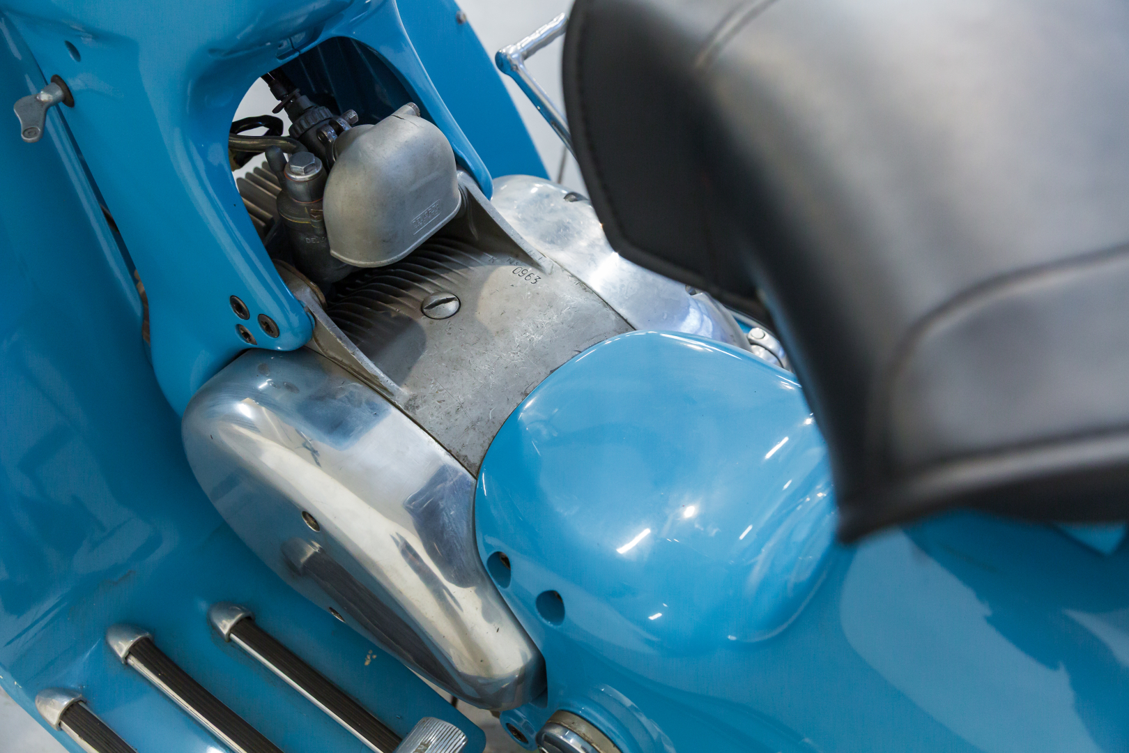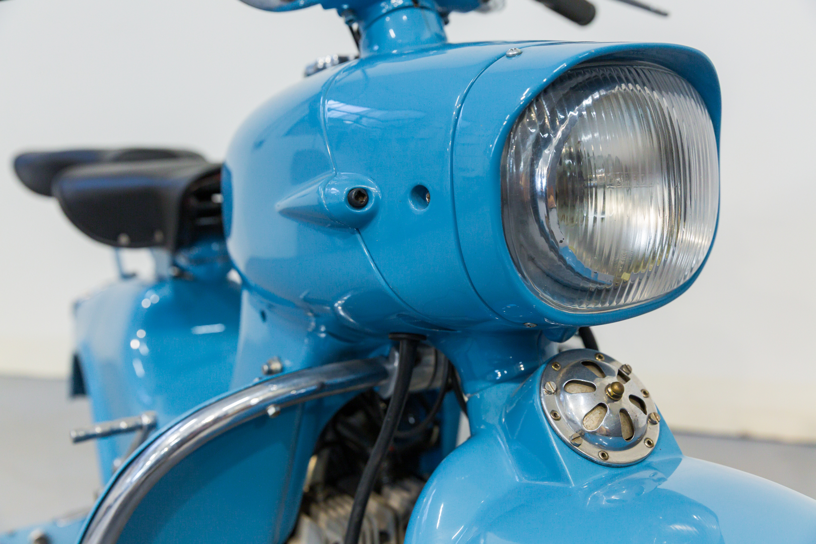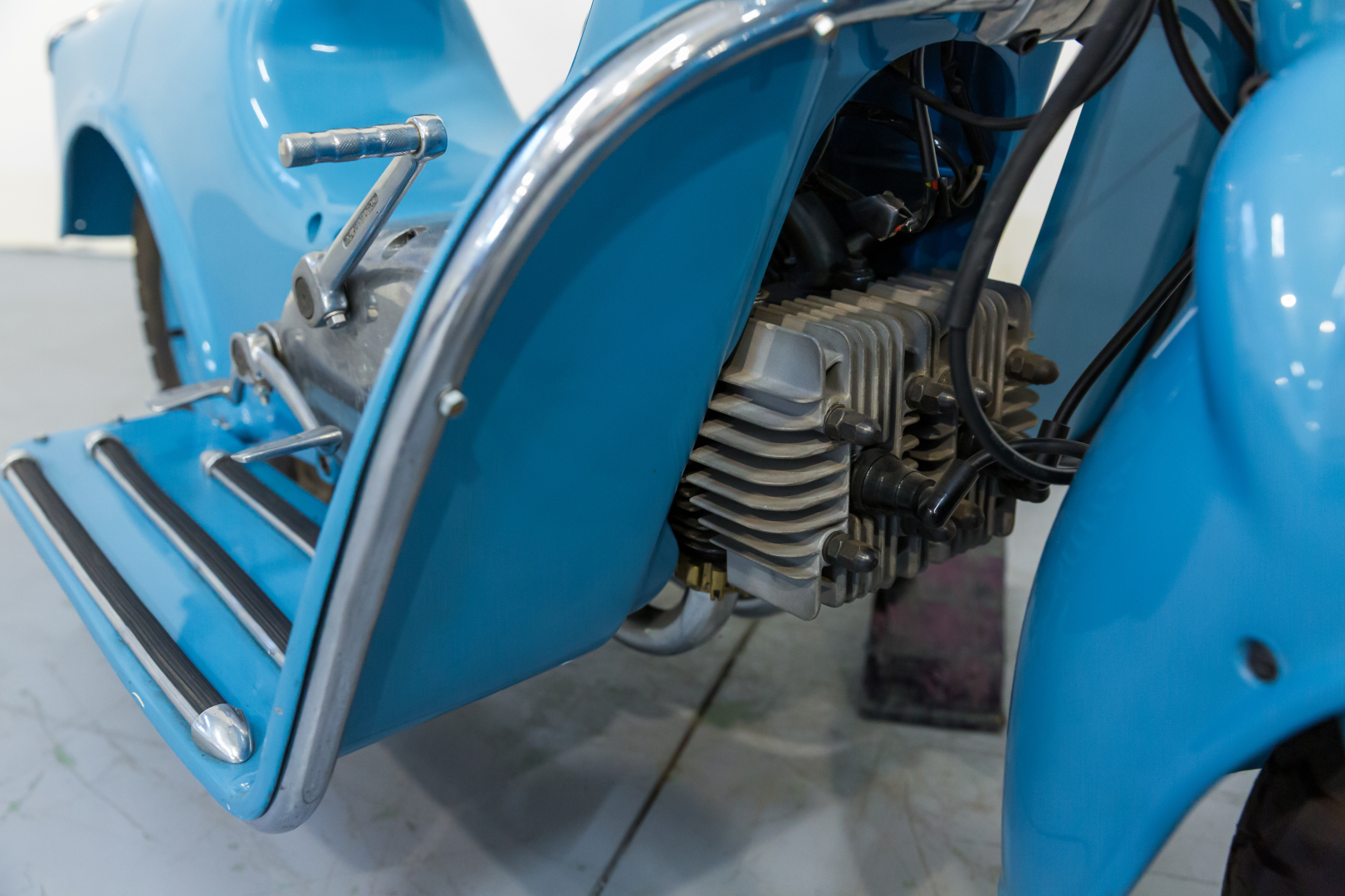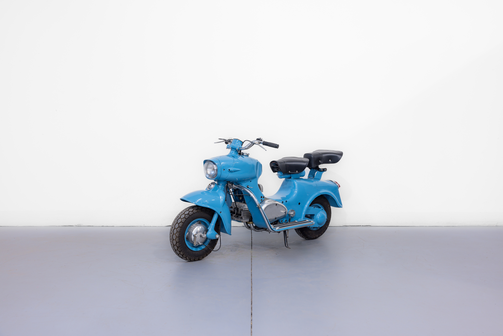 Born from the creativity of Donnino Rumi in 1954, following in the wake of Piaggio and Innocenti’s successes, the Formichino featured a load‑bearing aluminum body: a front section incorporating the fork, headlight, and fuel tank, and a rear section forming the seat base. It used the proven and powerful engine from the famous “Turismo,” a two‑stroke twin with horizontally opposed cylinders fed by a single carburetor, giving the scooter excellent performance. The Formichino offered here is a 1956 model distinguished by a rear body section split into two parts and the addition of a speedometer/odometer. It has been restored and repainted in non‑original colors and is in excellent condition. A general check is recommended before use.