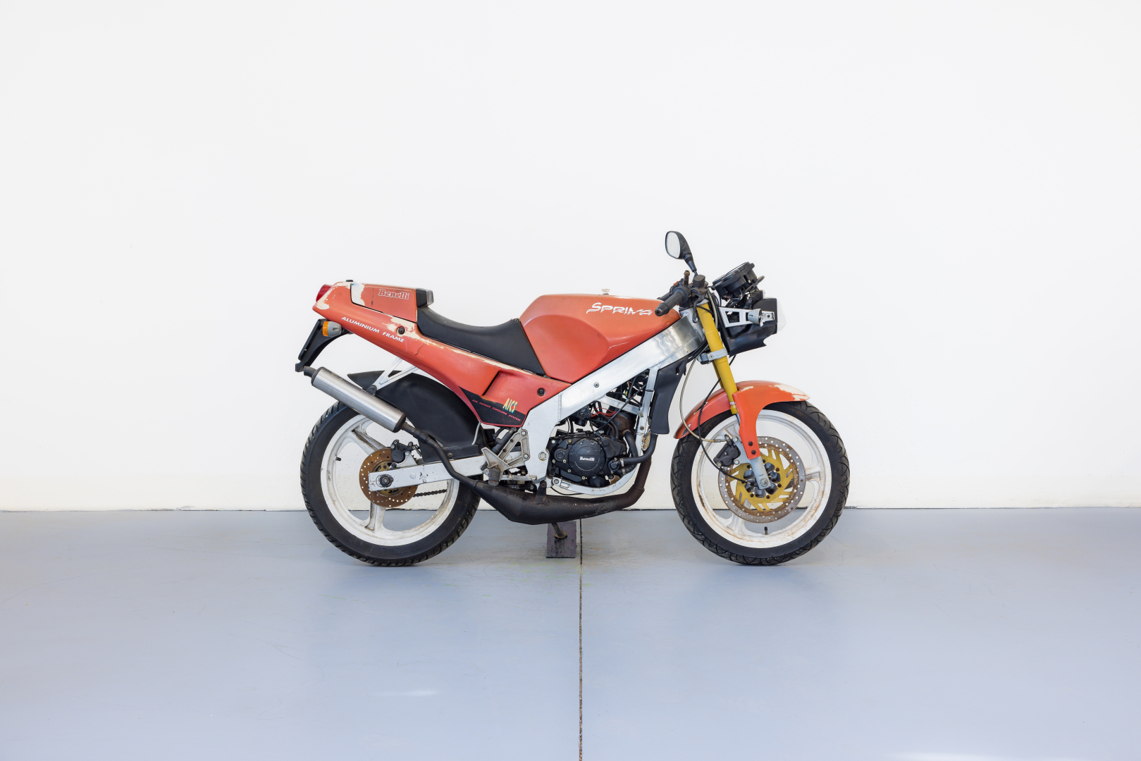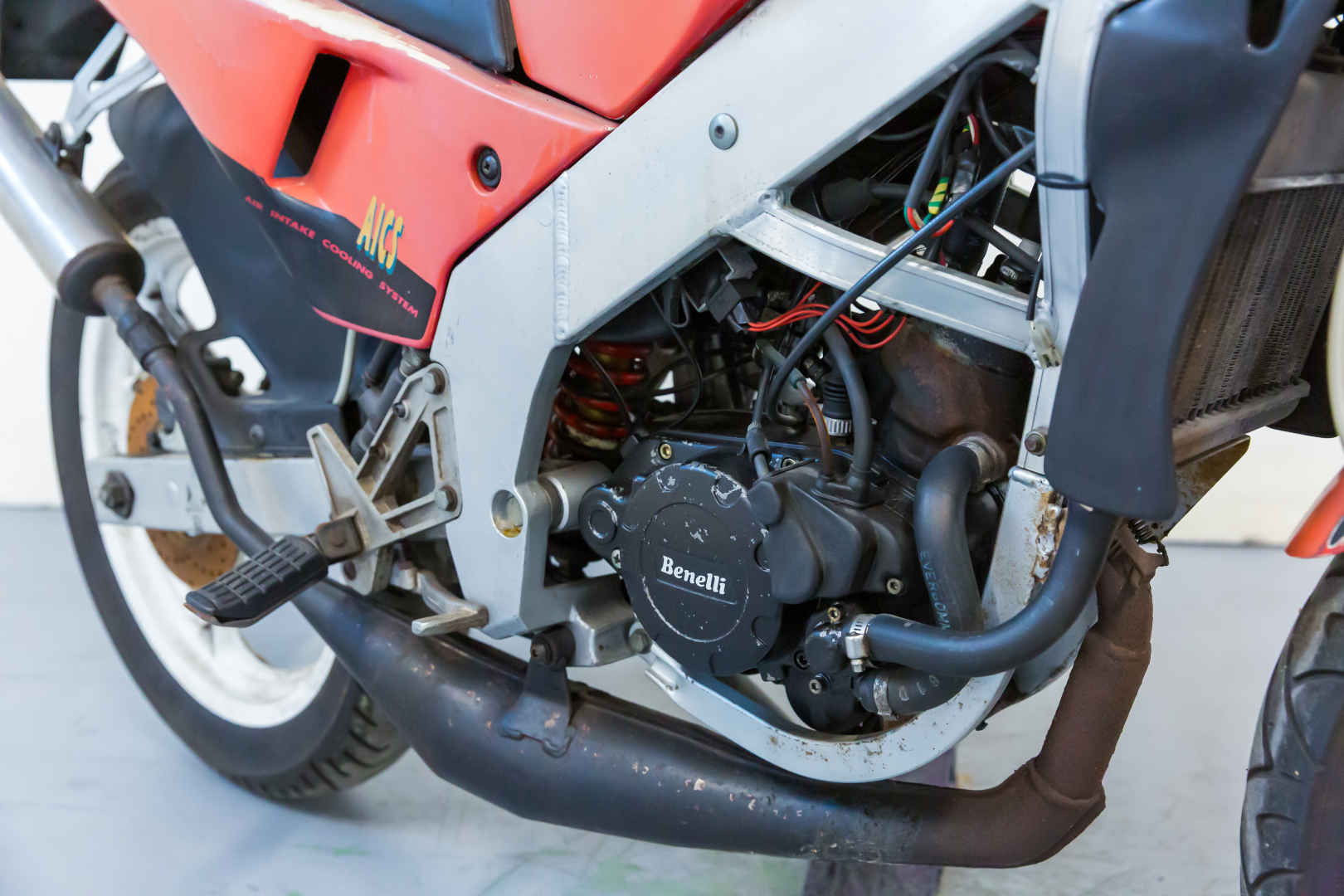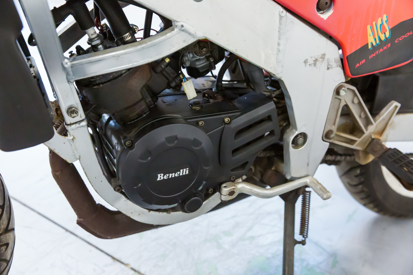 Bright and appealing moped presented by Benelli of Pesaro in the 1990s, equipped with a 49.7cc single-cylinder liquid-cooled engine, reed valve intake, aluminum perimeter frame, upside-down fork, and rear suspension with swingarm and mono-shock with progressive action. A general check-up is recommended before use.