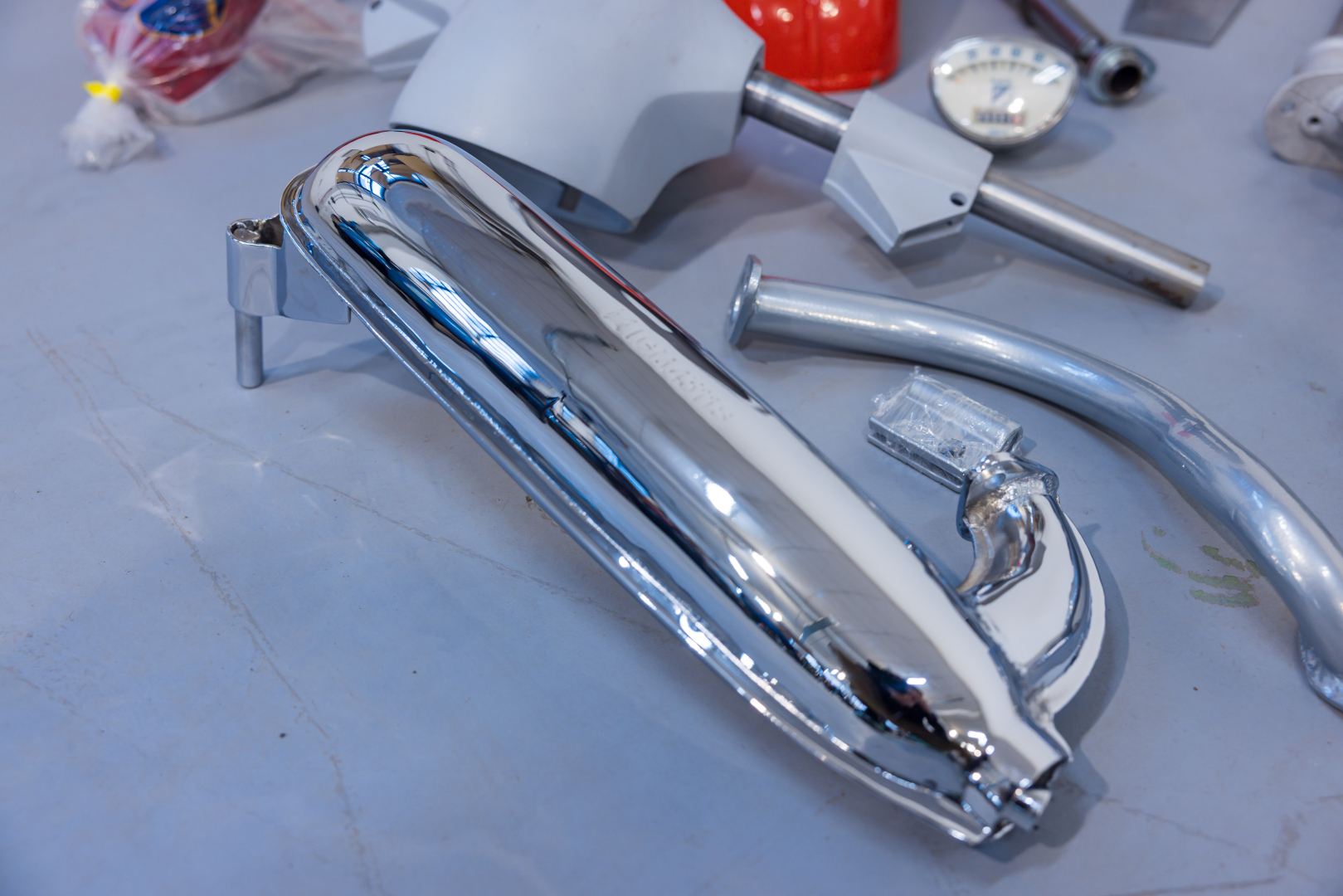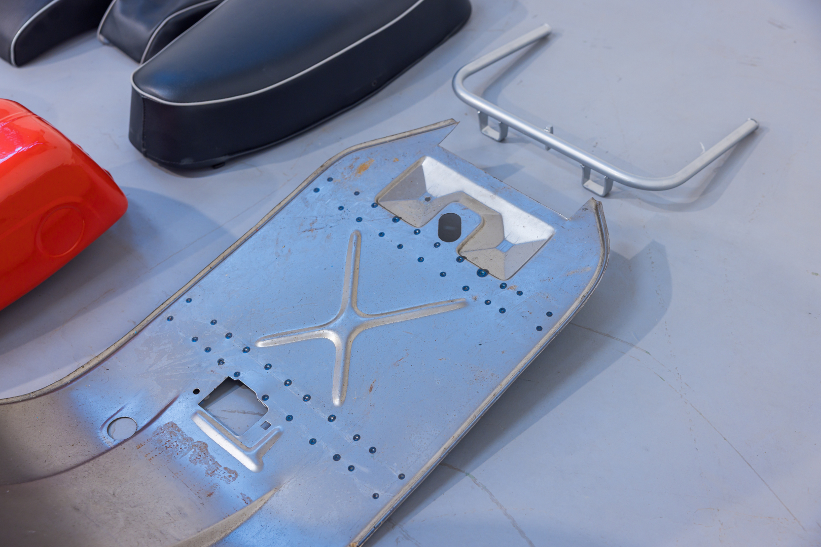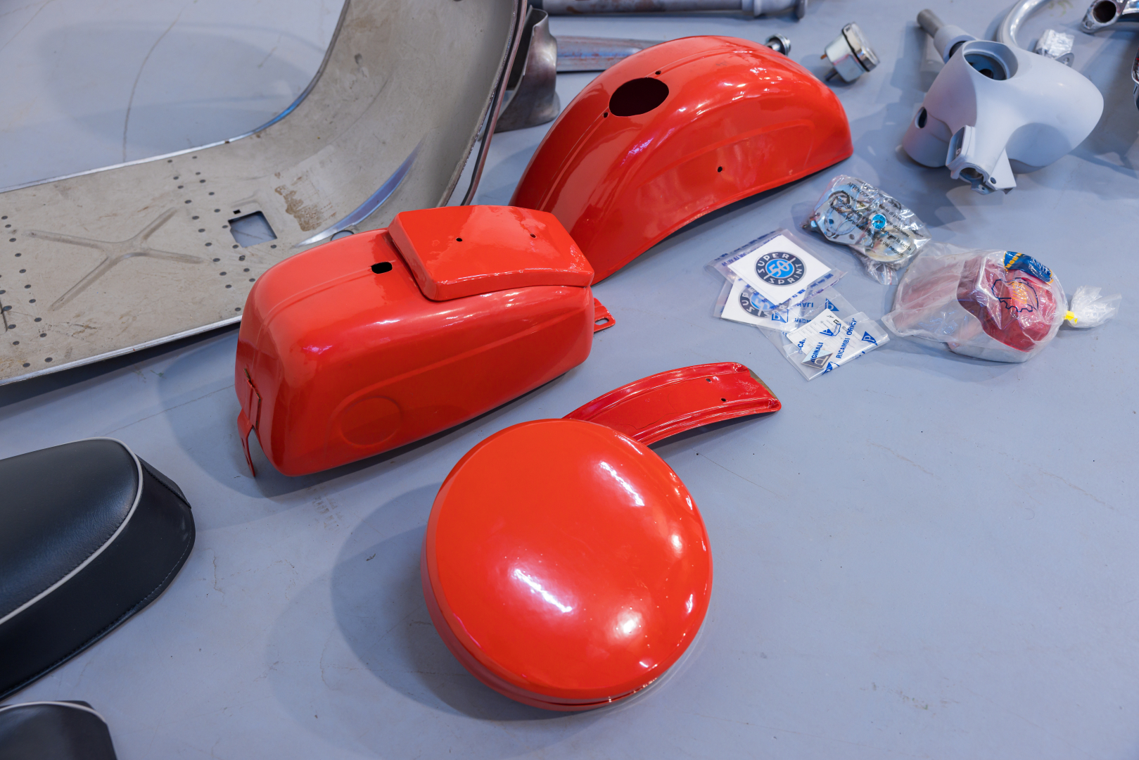Lot of various components for a Piaggio Vespa SS, including a sandblasted shield, handlebar, cover and speedometer, body molding, kickstand, muffler, tank, storage compartment and various small parts, seat and bumpers, fender, reinforcements, and other details. Rare and uncommon set, excellent for continuing a restoration project.