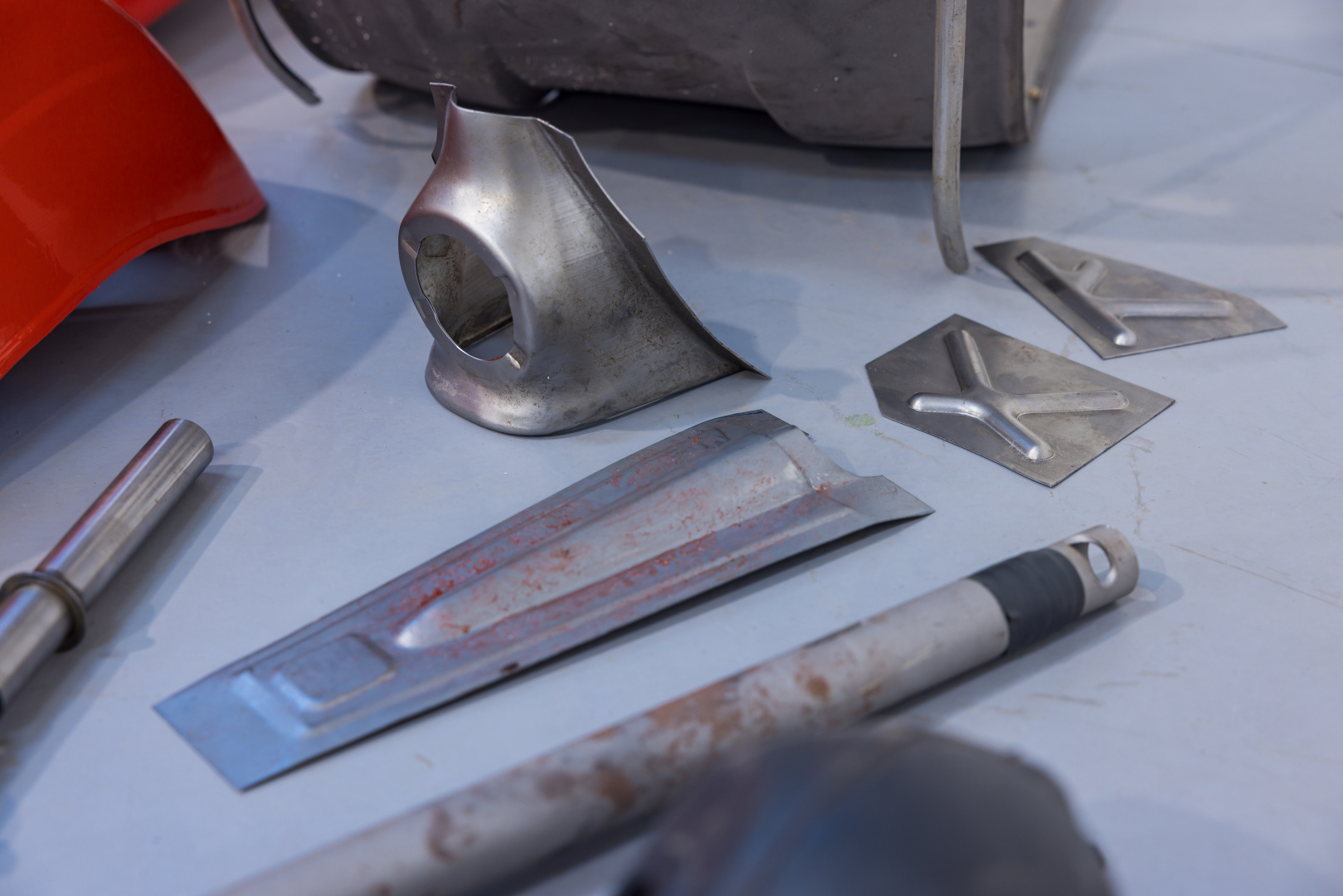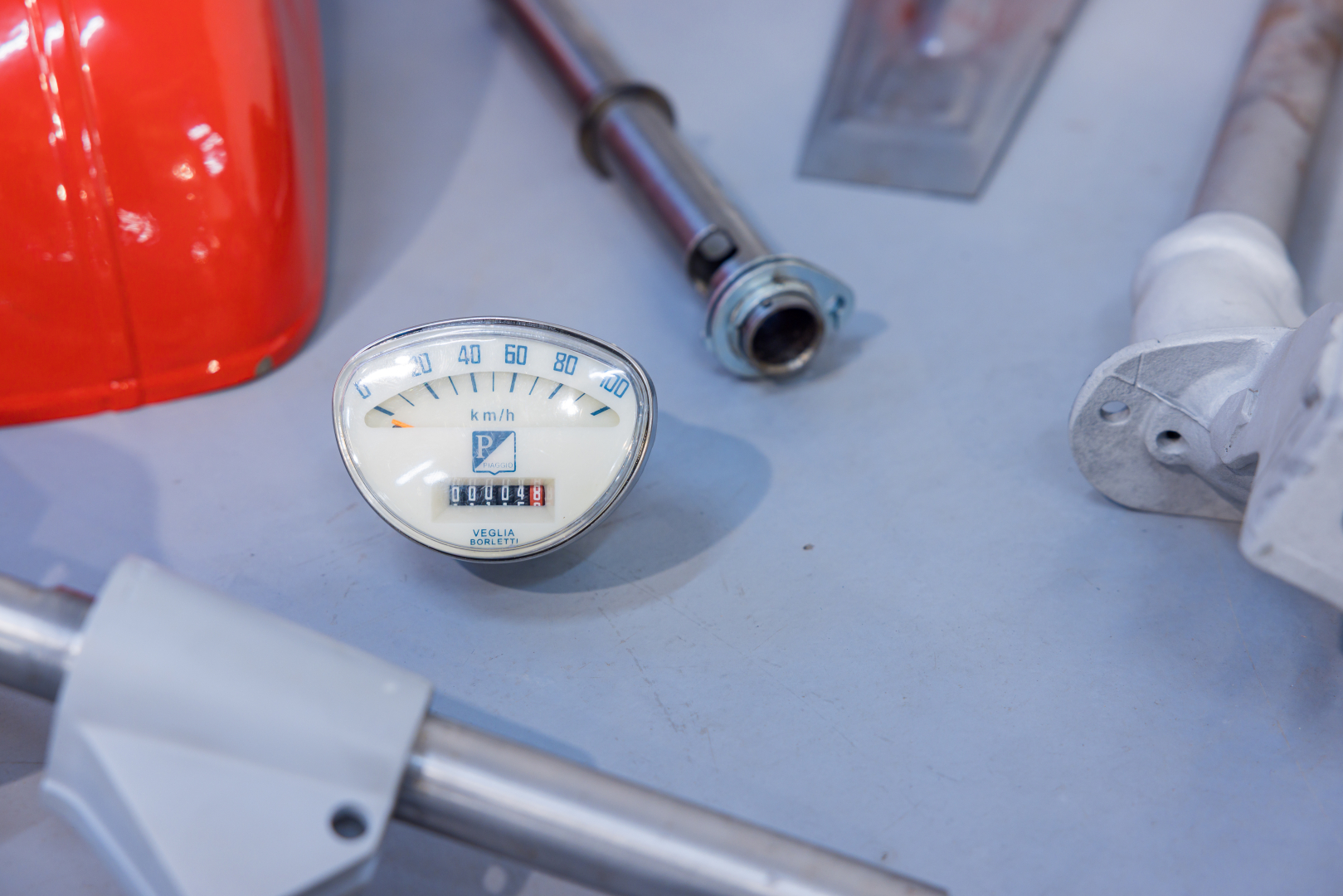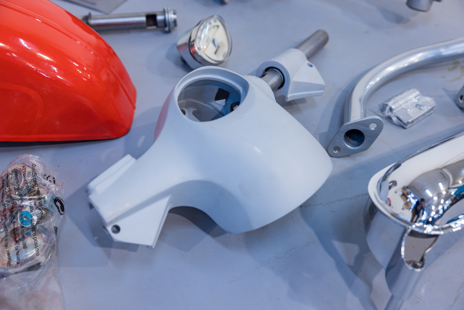 Lot of various components for a Piaggio Vespa SS, including a sandblasted shield, handlebar, cover and speedometer, body molding, kickstand, muffler, tank, storage compartment and various small parts, seat and bumpers, fender, reinforcements, and other details. Rare and uncommon set, excellent for continuing a restoration project.