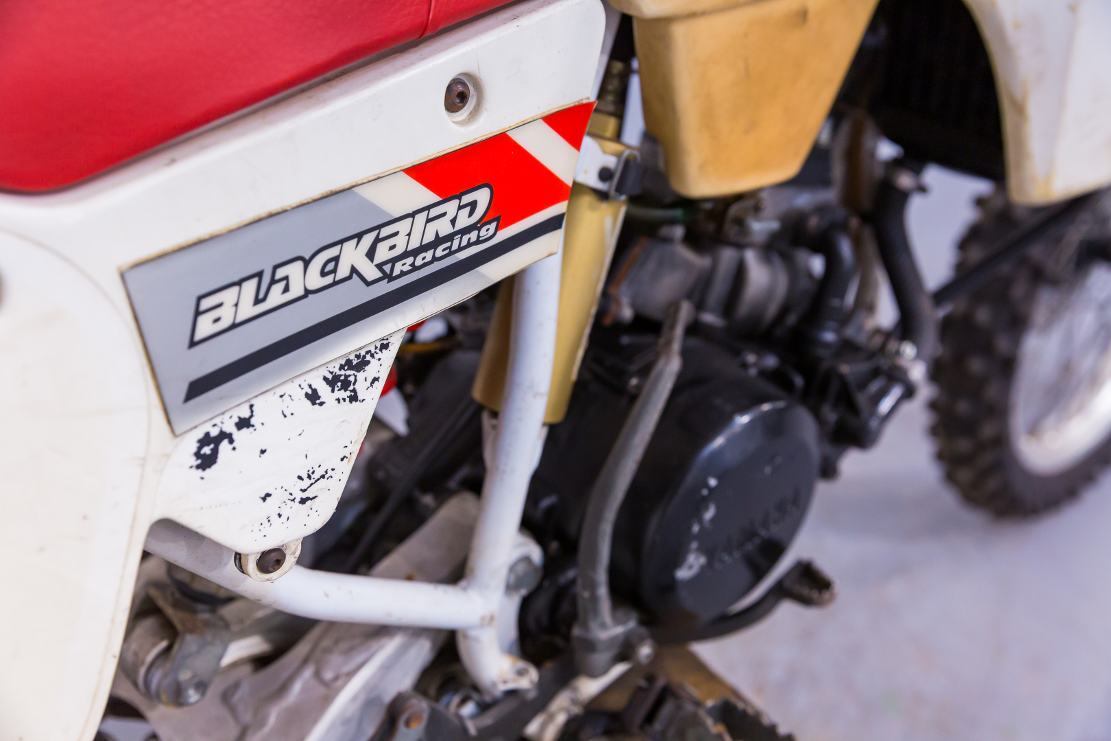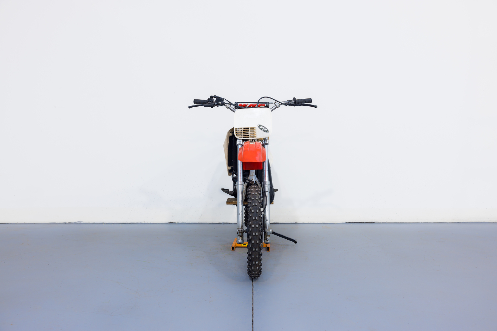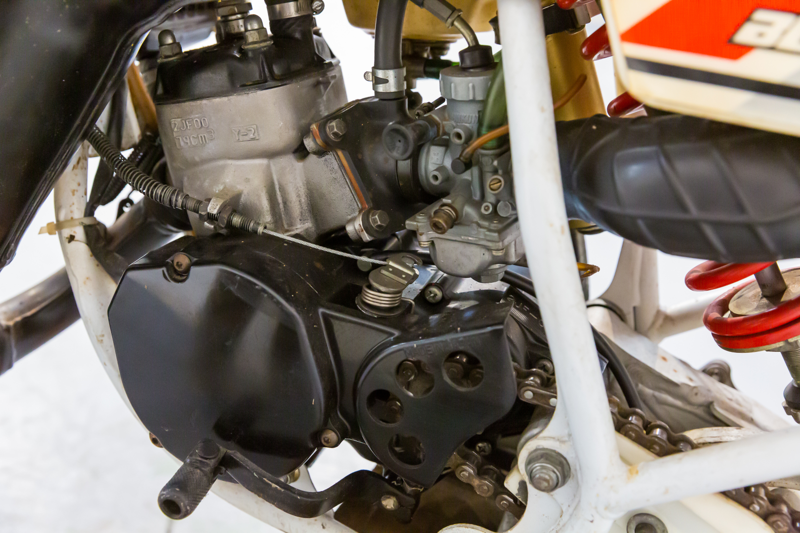 Off-road competition motorcycle specifically designed for young riders, featuring 17” front and 14” rear wheels. Engine is a 79cc liquid-cooled single-cylinder 2-stroke with reed valve intake. Frame is a tubular double-cradle steel, front suspension telescopic fork 33mm diameter, rear suspension aluminum swingarm with progressive-action Mono Cross lever-controlled shock absorber, front disc brake, rear drum brake. Complete, in good condition. A general check-up is recommended before use.