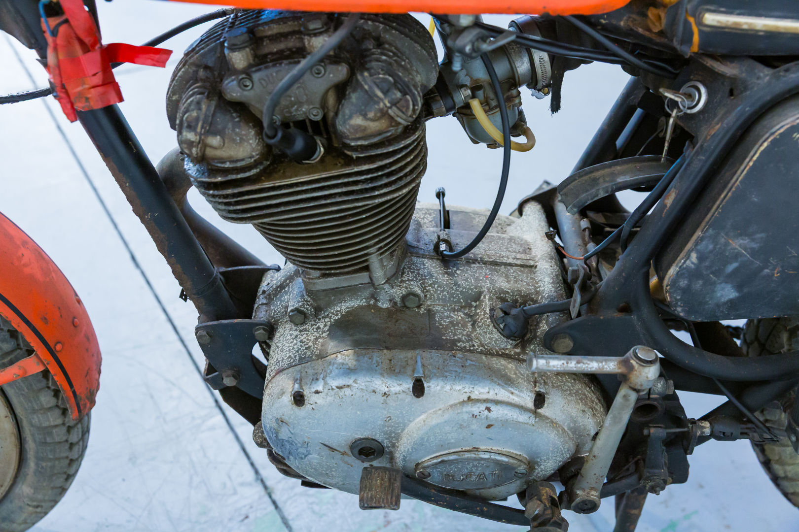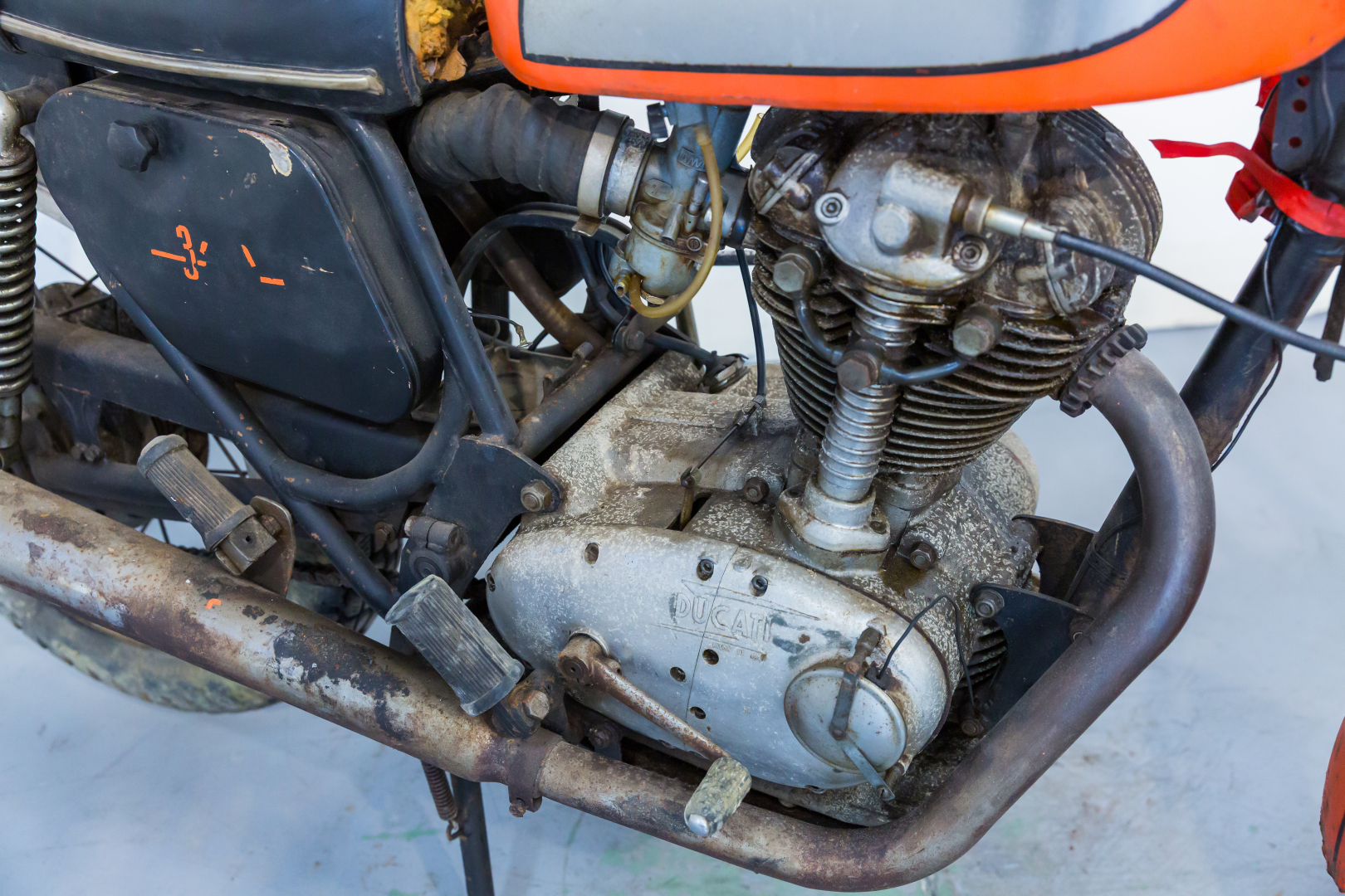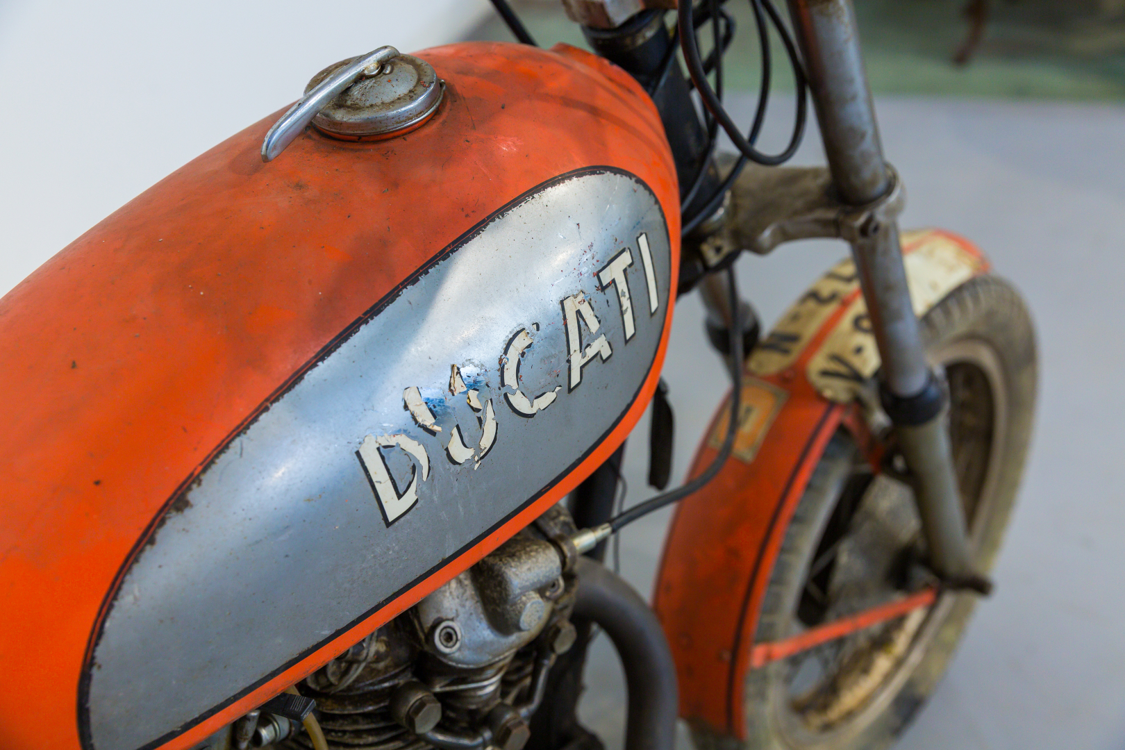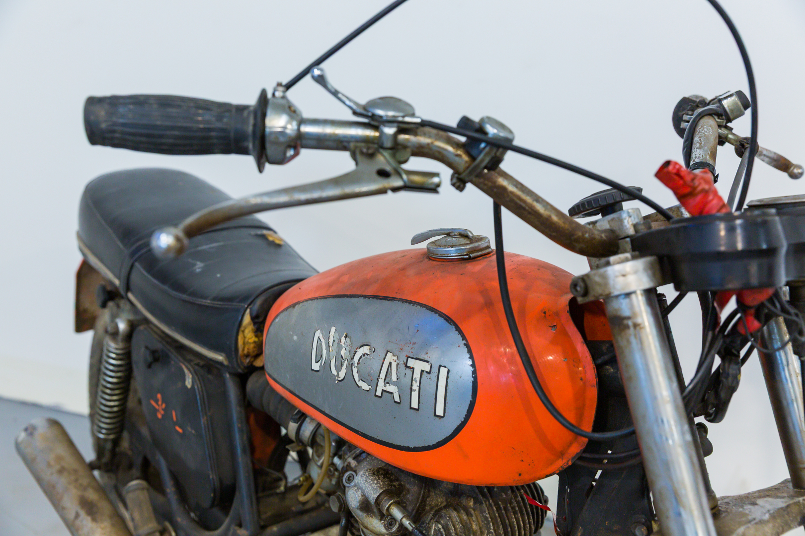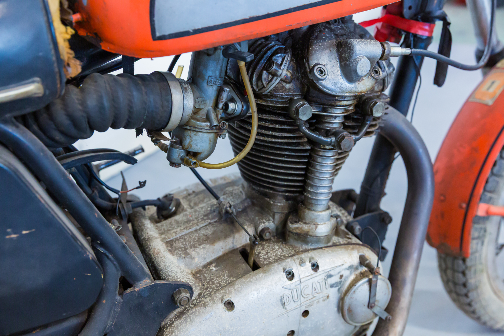 The first Ducati Scrambler was presented in 1962, equipped with a 250 cc 4-stroke single-cylinder engine, free exhaust, and knobby wheels, intended exclusively for the US market. A few years later, in 1968, the Scrambler for the European market was presented; the knobby wheels disappeared, and it was offered in three different displacements—250, 350, and 450 cc—with the classic single-cylinder engine with single overhead camshaft distribution controlled by a shaft and bevel gears.