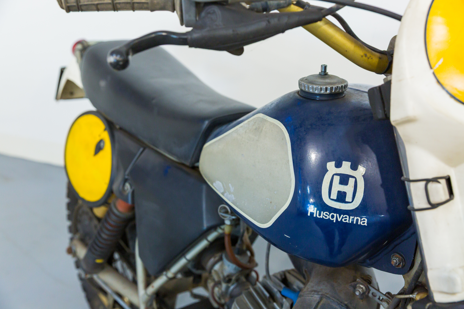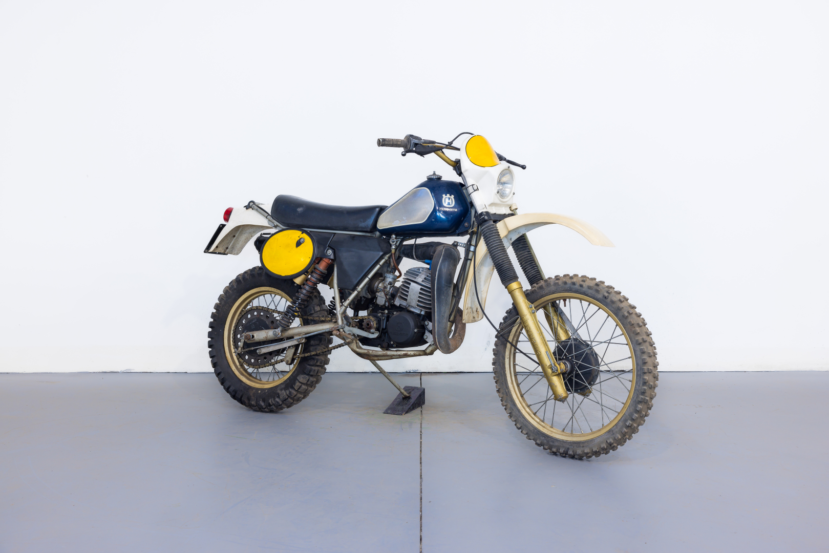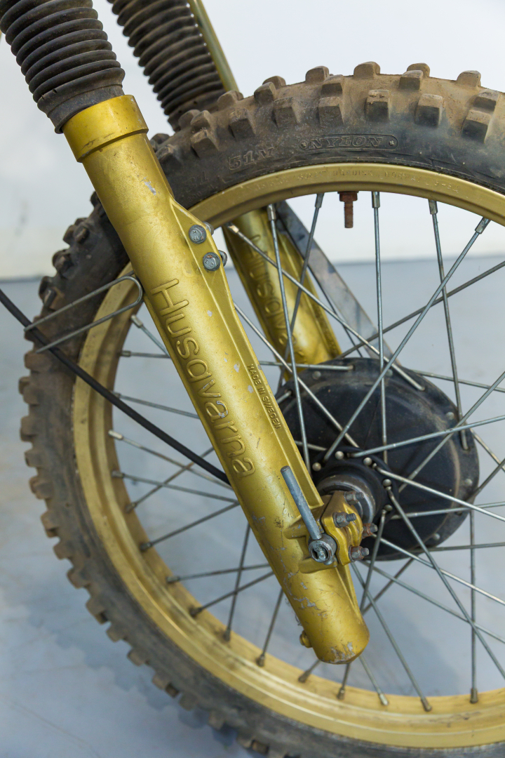 Enduro motorcycle offered by the Swedish company Husqvarna; the model offered is a 250cc with a single-cylinder 2-stroke engine with reed intake, split single-cradle frame in steel, front suspension with leading-axle tele-hydraulic fork, and at the rear, a swinging arm with a pair of tele-hydraulic shock absorbers, drum brakes, and conical-hub wheels. Preserved, complete, fair condition. A general check is recommended before use.