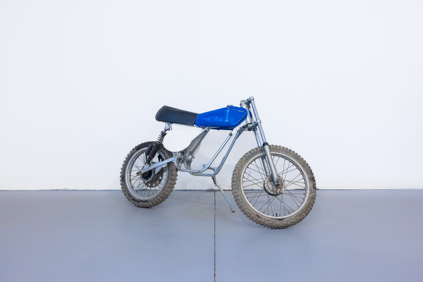 Frame with suspension, semi-complete wheels, seat, and tank belonging to a Simonini 125 Cross motorcycle. Ideal for spare parts.