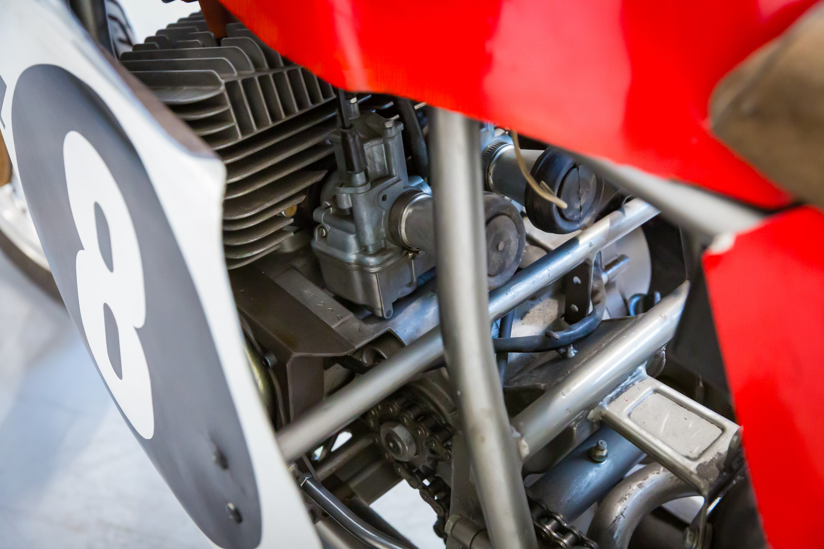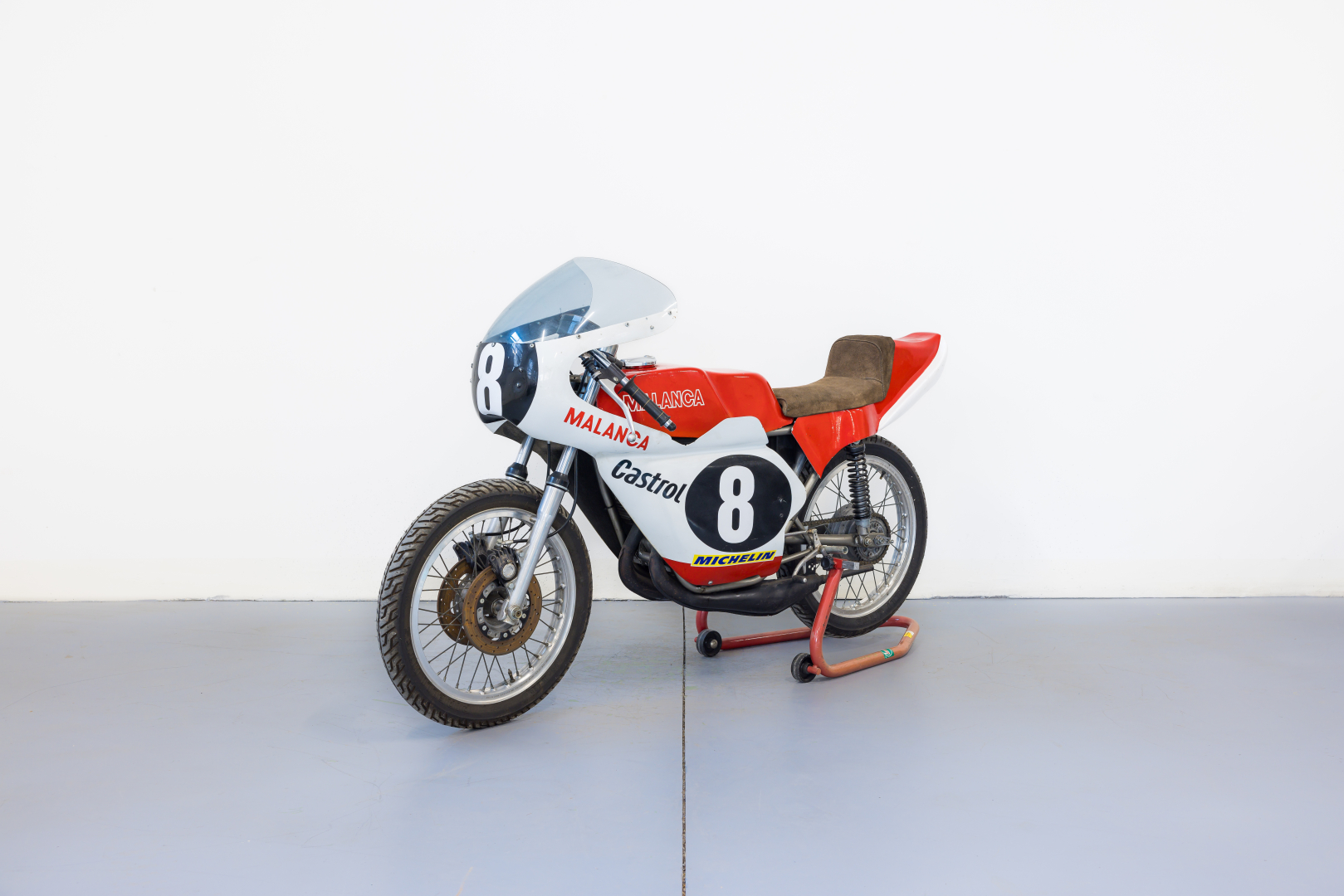 Competition motorcycle derived from the Malanca 125 E2CS, with a 125cc 2-stroke twin-cylinder engine equipped with expansion pipes, standard frame adapted for racing use, rear-set footpegs, racing fairing, front double disc brakes by Bernardi Mozzi Motor with hydraulic control, rear drum brake with mechanical control. A general check-up is recommended before use.