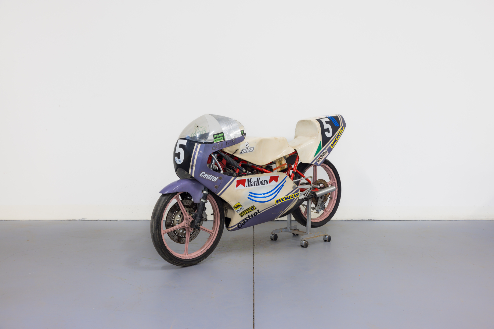 At the end of 1979, Giancarlo Morbidelli, a skilled industrialist from Pesaro specialized in woodworking machines and passionate about racing motorcycles, who had already started his own brand producing successful 50cc and 125cc motorcycles in speed competitions, combined his expertise with Benelli Armi to create MBA (Morbidelli Benelli Armi). This partnership brought the brand 8 world titles, 14 national titles, and 7 continental successes. The most representative and successful model was equipped with a 2-stroke twin-cylinder engine with rotary disc intake and 6-speed gearbox in a steel trellis frame, combined with the best-quality components available at the time. The proposed model is a 1985 VR 125 Cantilever with rear mono-shock, previously owned by rider Anton Slegl, who raced it successfully in the Czech National Championship; it has been updated with non-original components such as rims and brakes, now featuring a Yamaha vented front disc like the rest of the system. Preserved, complete, in fair condition. A general check-up is recommended before use.