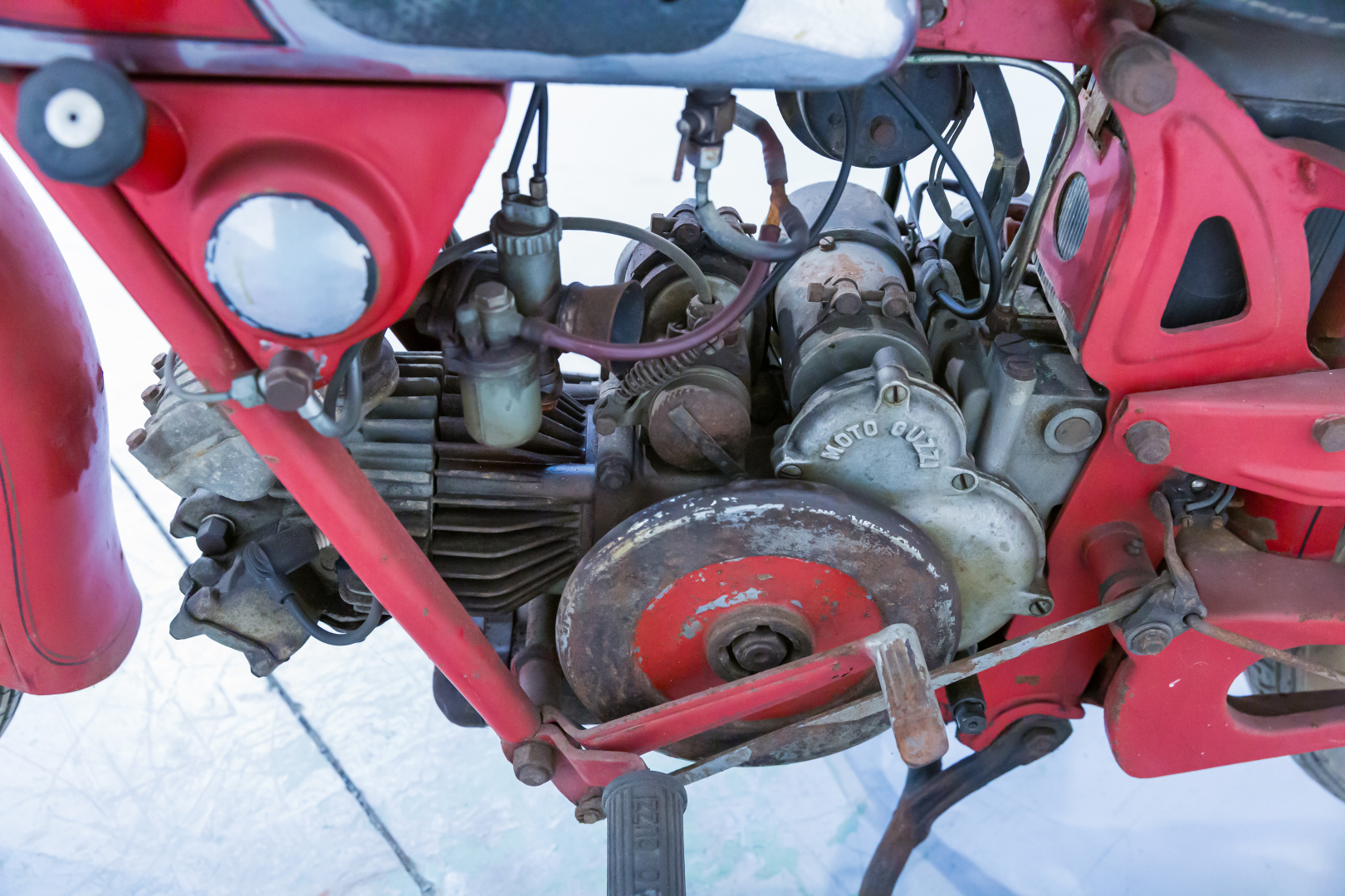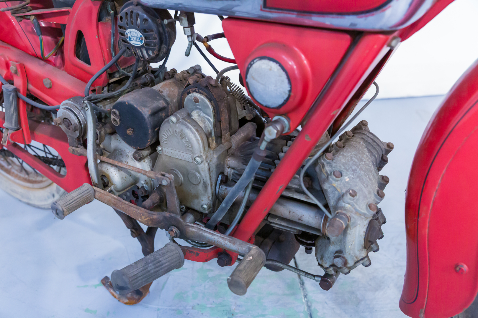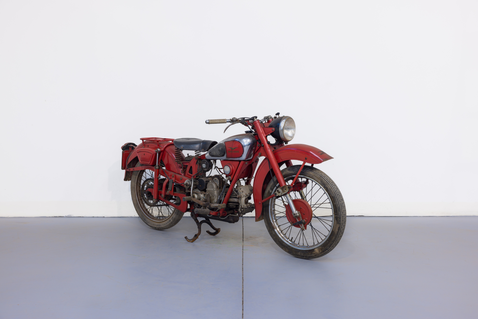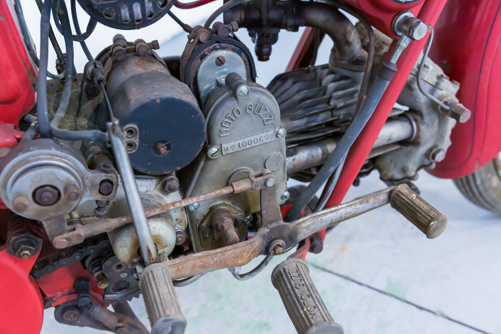 In 1948, Moto Guzzi resumed the model named the Airone, presented in 1939, and modernized it to make it more attractive. The famous horizontal single-cylinder saw the adoption of a light alloy cylinder head. Regarding the suspension, an inverted telescopic fork was adopted at the front, with an original anchor plate and a generous drum brake. At the rear, it featured a swinging arm with coil springs placed under the engine and a pair of supplementary shock absorbers fixed to the frame. Preserved, in fair condition, missing some components, suitable for a restoration project or for spare parts.